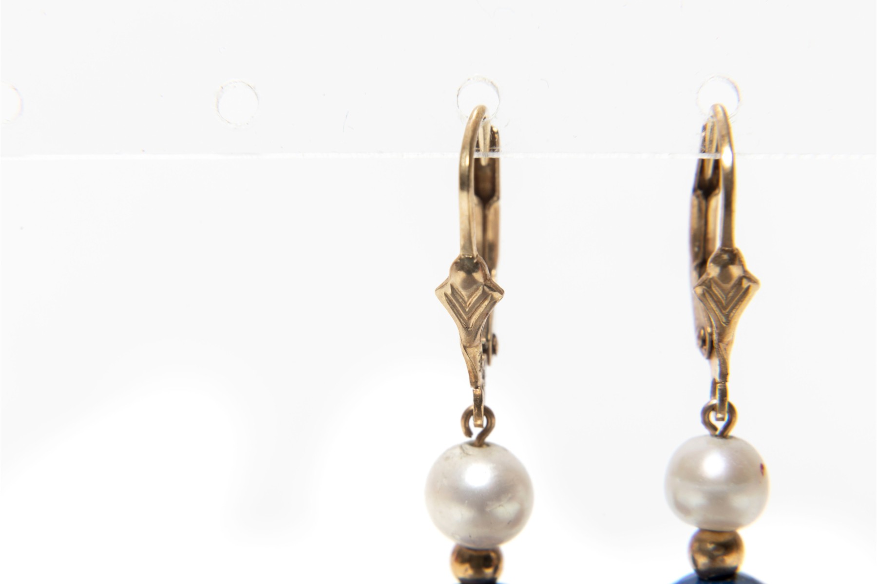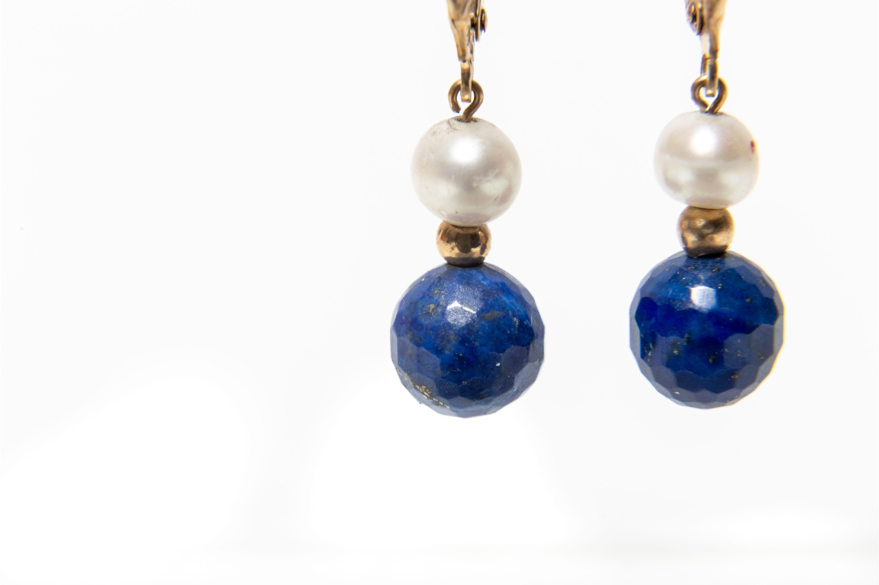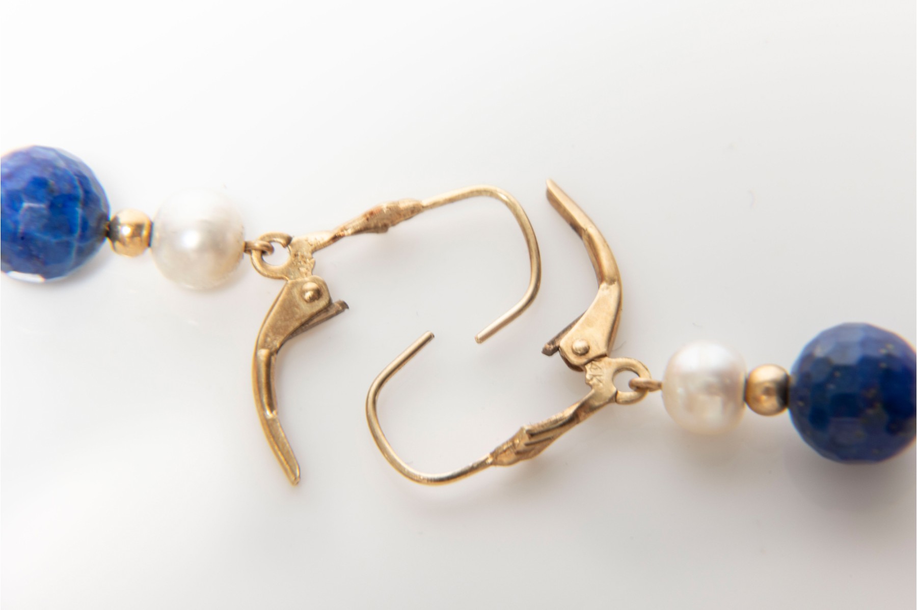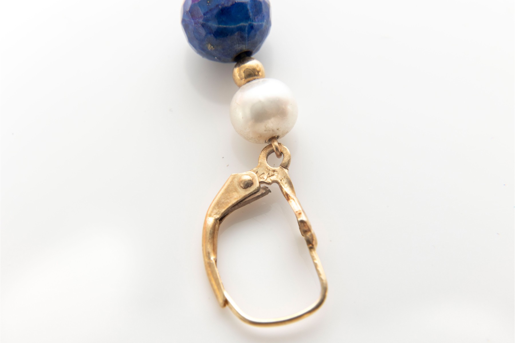 14k yellow gold handsome cultured freshwater pearl and faceted lapis drop earrings, finished with a wire top and lever style backs