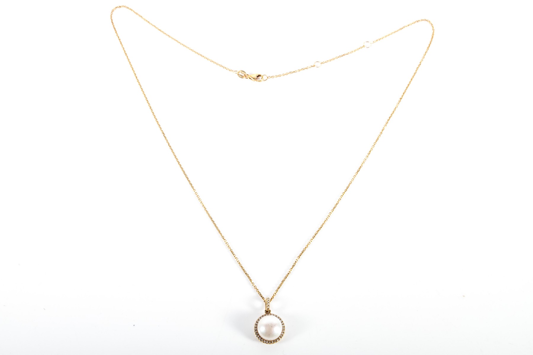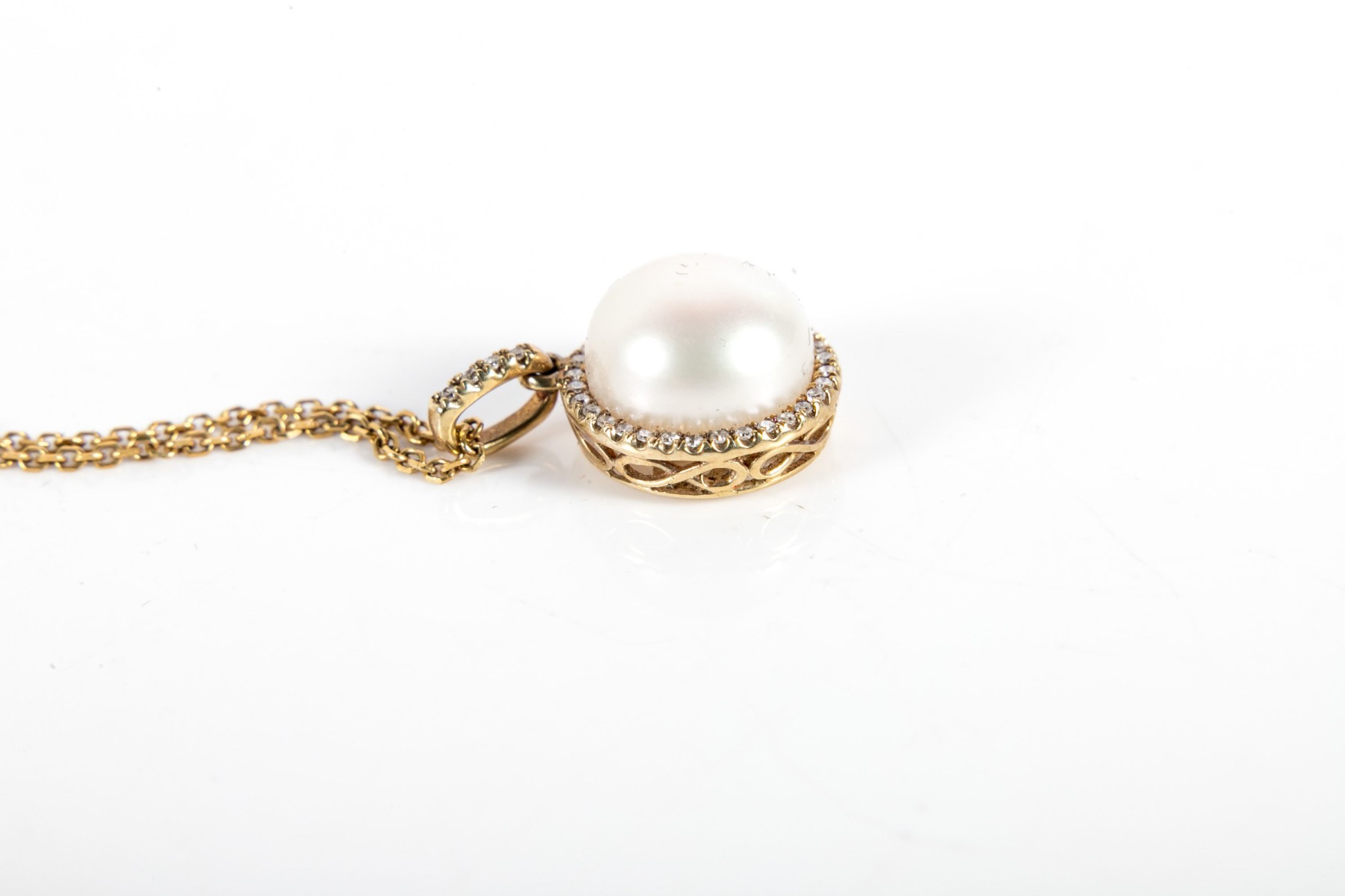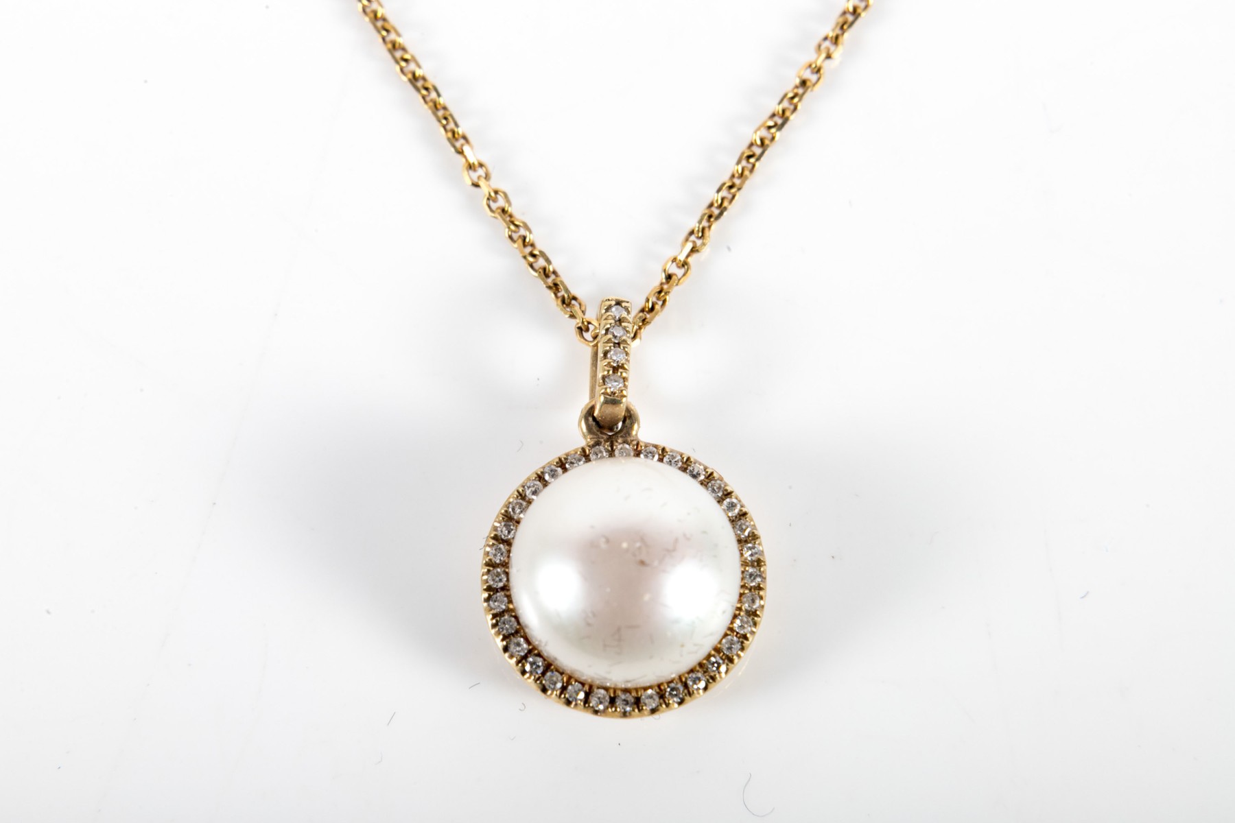A stunning yellow gold necklace displaying a pendant with a white cultured button pearl surrounded by a halo of tiny round moissanites, hanging from a fine cable chain.