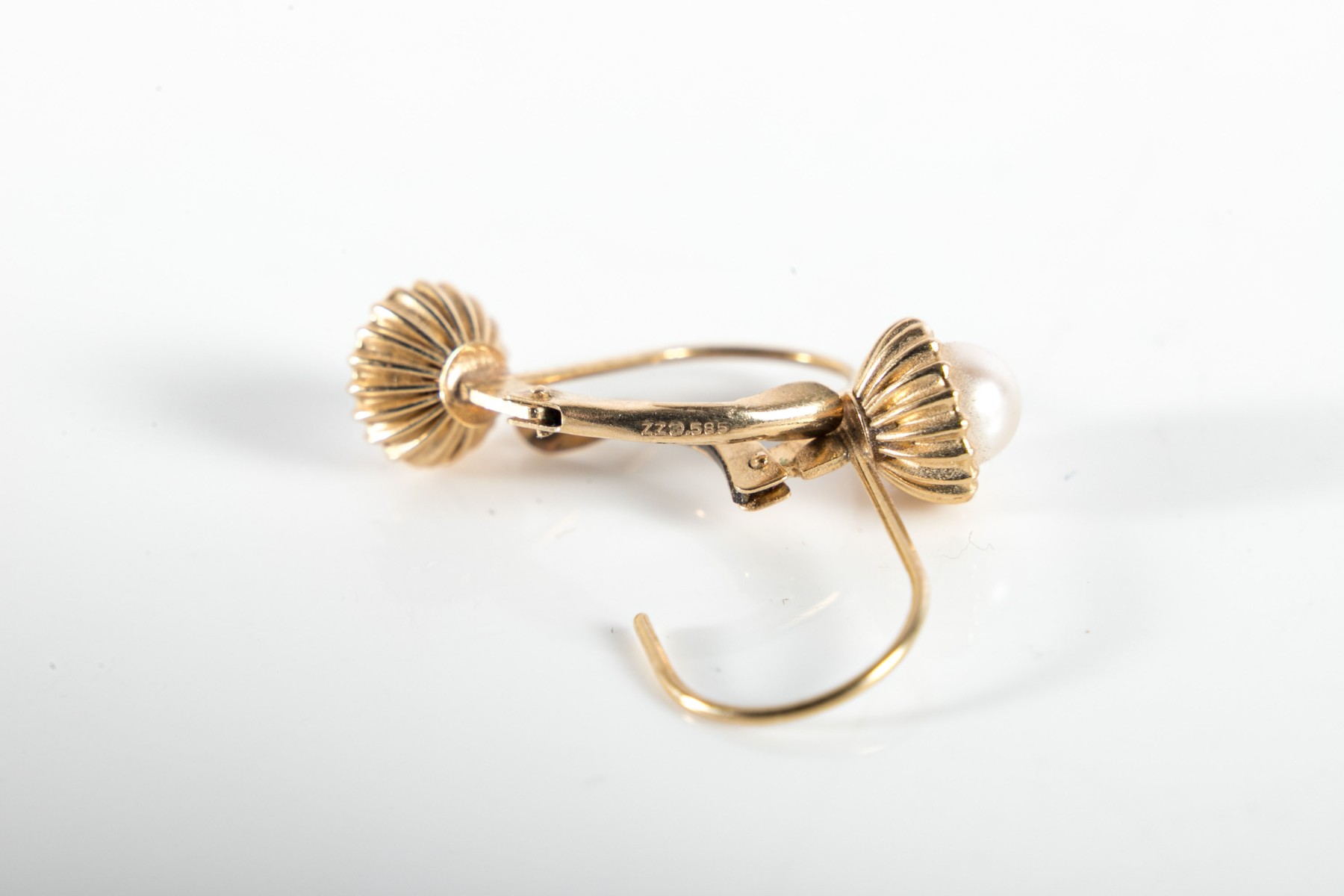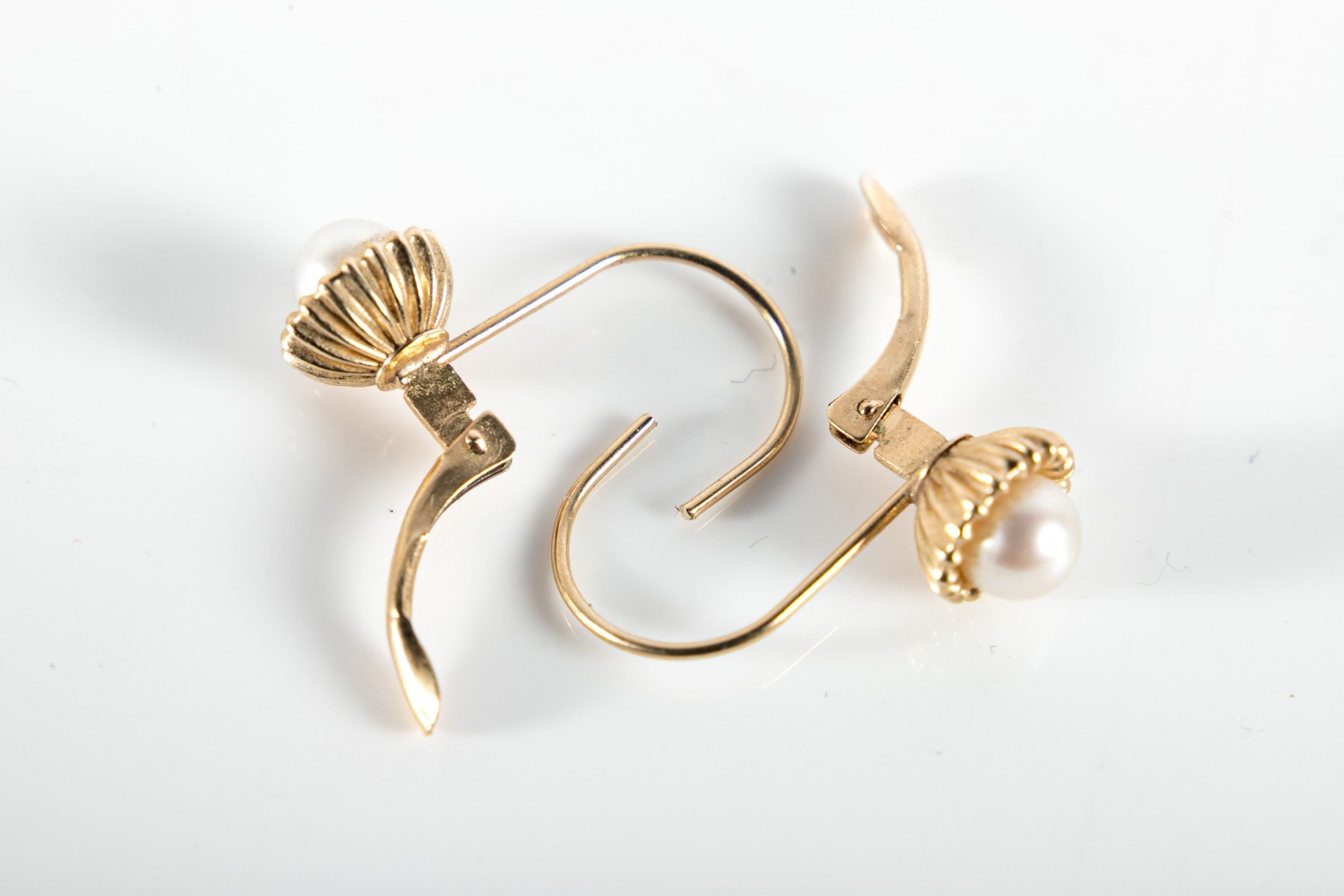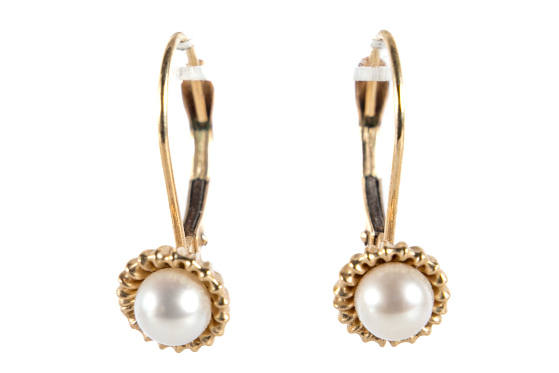 A pretty pair of yellow gold drop earrings displaying white cultured pearls over floral ribbed mountings.