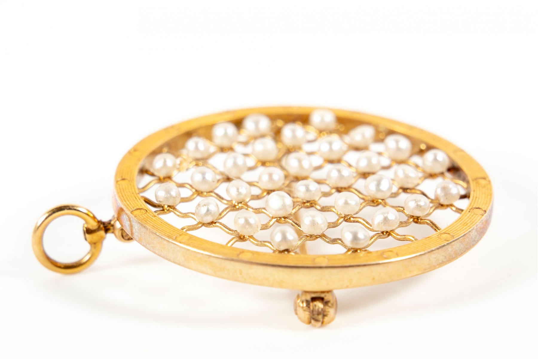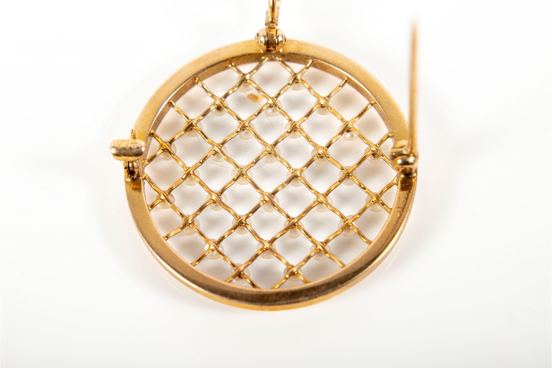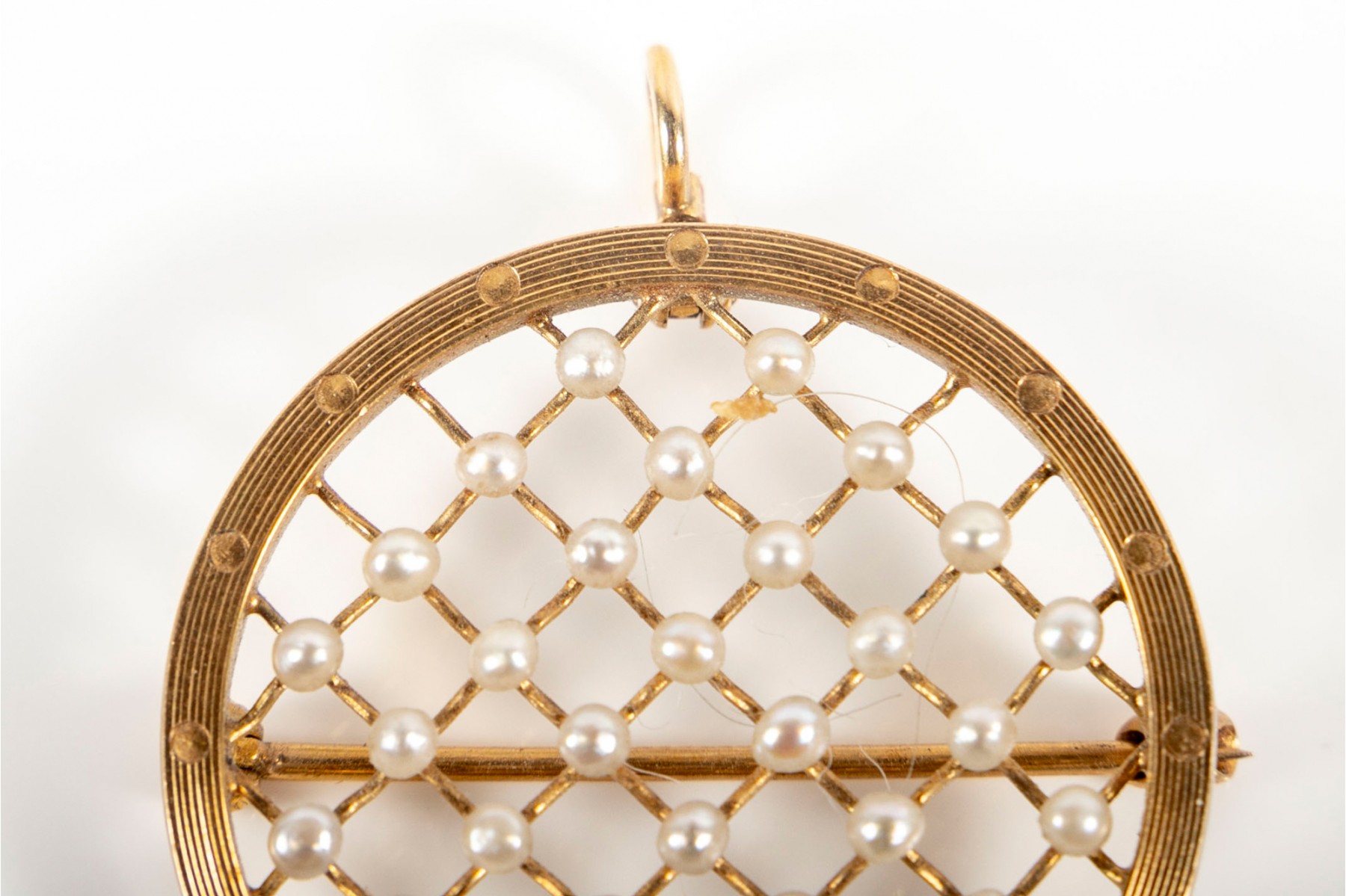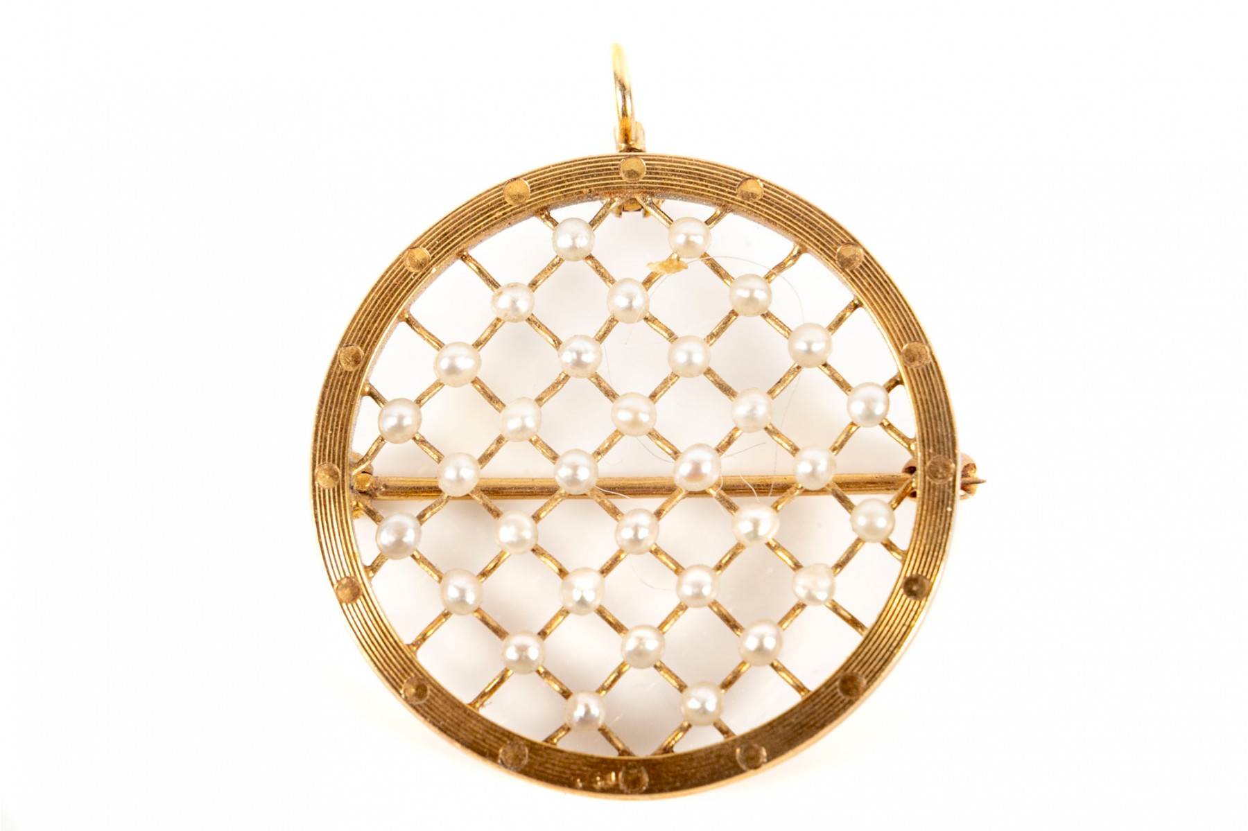 A beautiful yellow gold brooch displaying a dainty lattice with cultured seed pearls at the cross-sections, leading to a finely striated border interrupted by divet details. Includes a swiveling bail for use as a pendant.