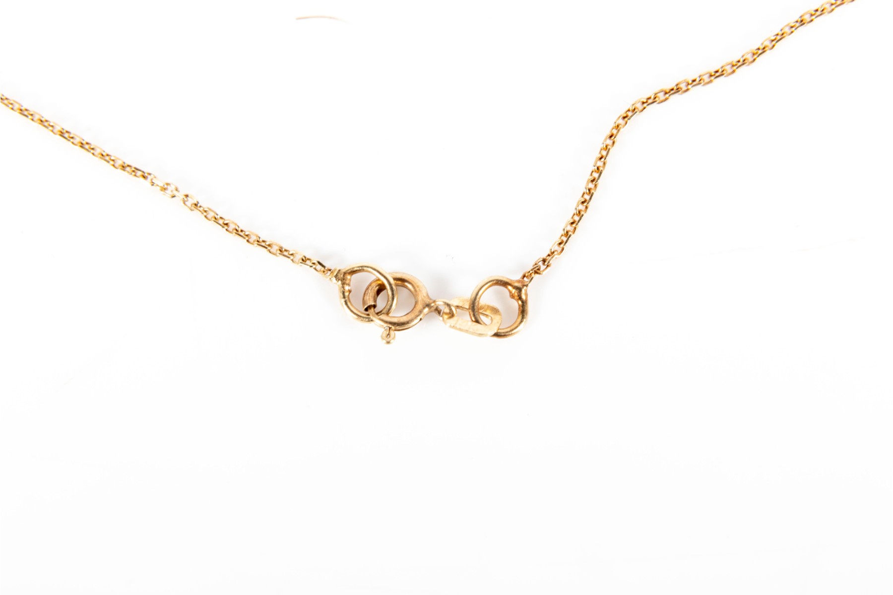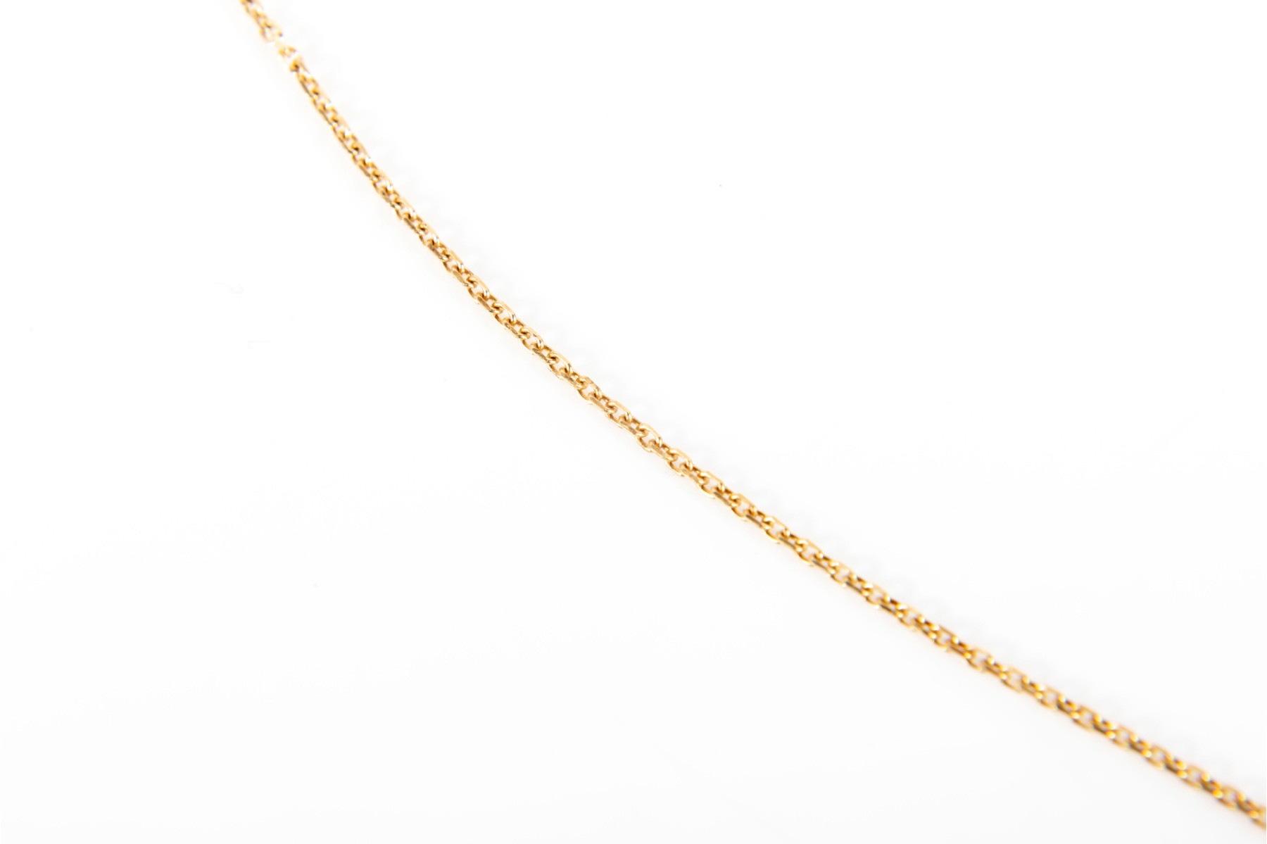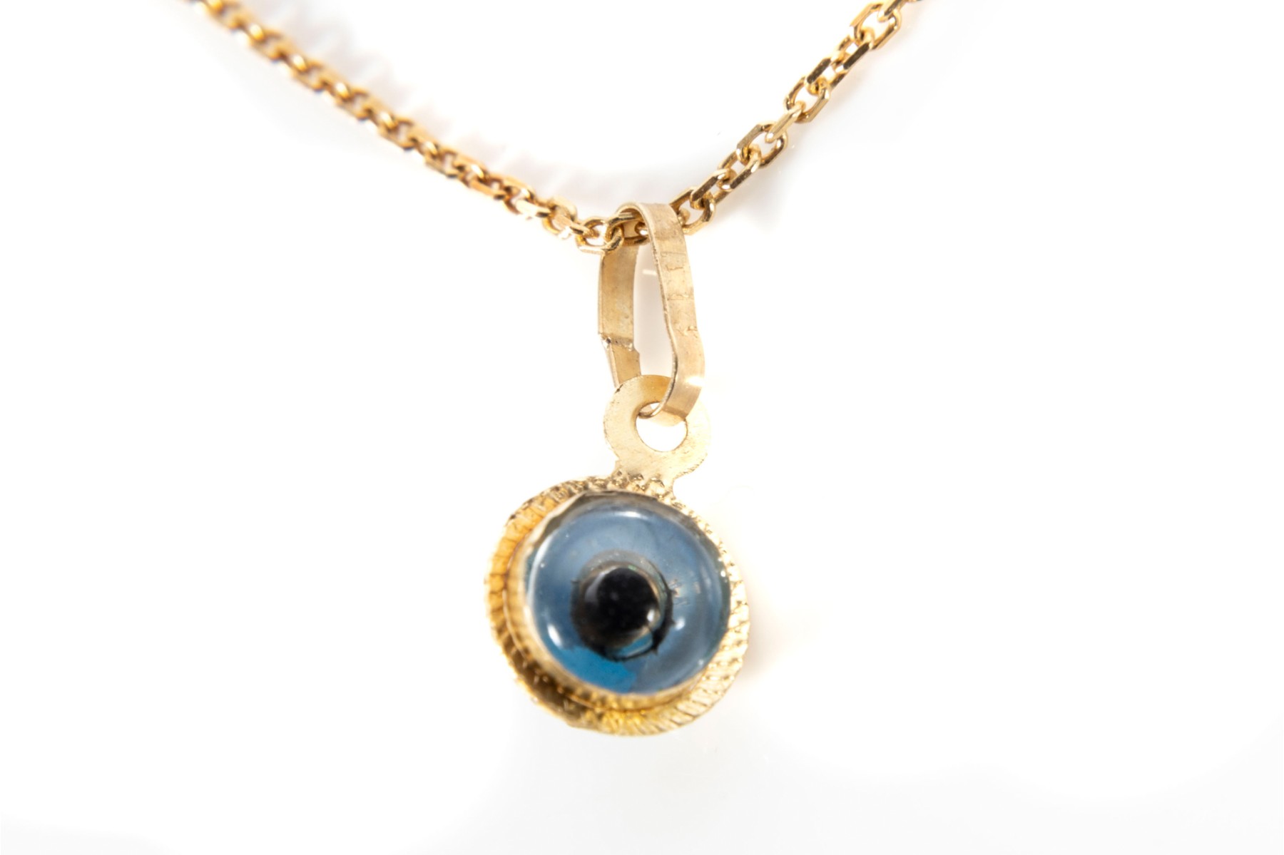 A yellow gold necklace displaying a dainty, diminutive glass evil eye in blue, hanging from a fine link chain with a spring ring style clasp.