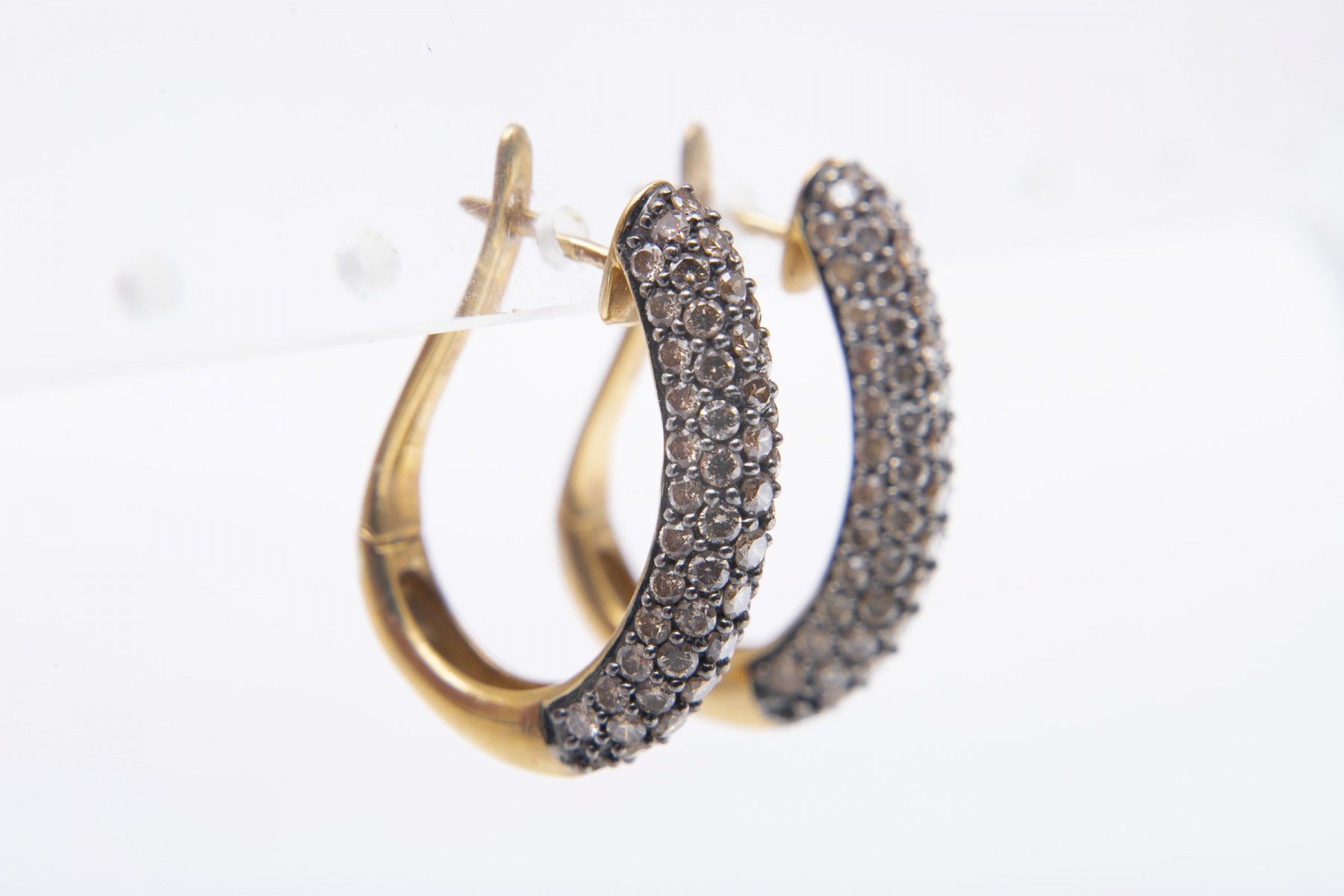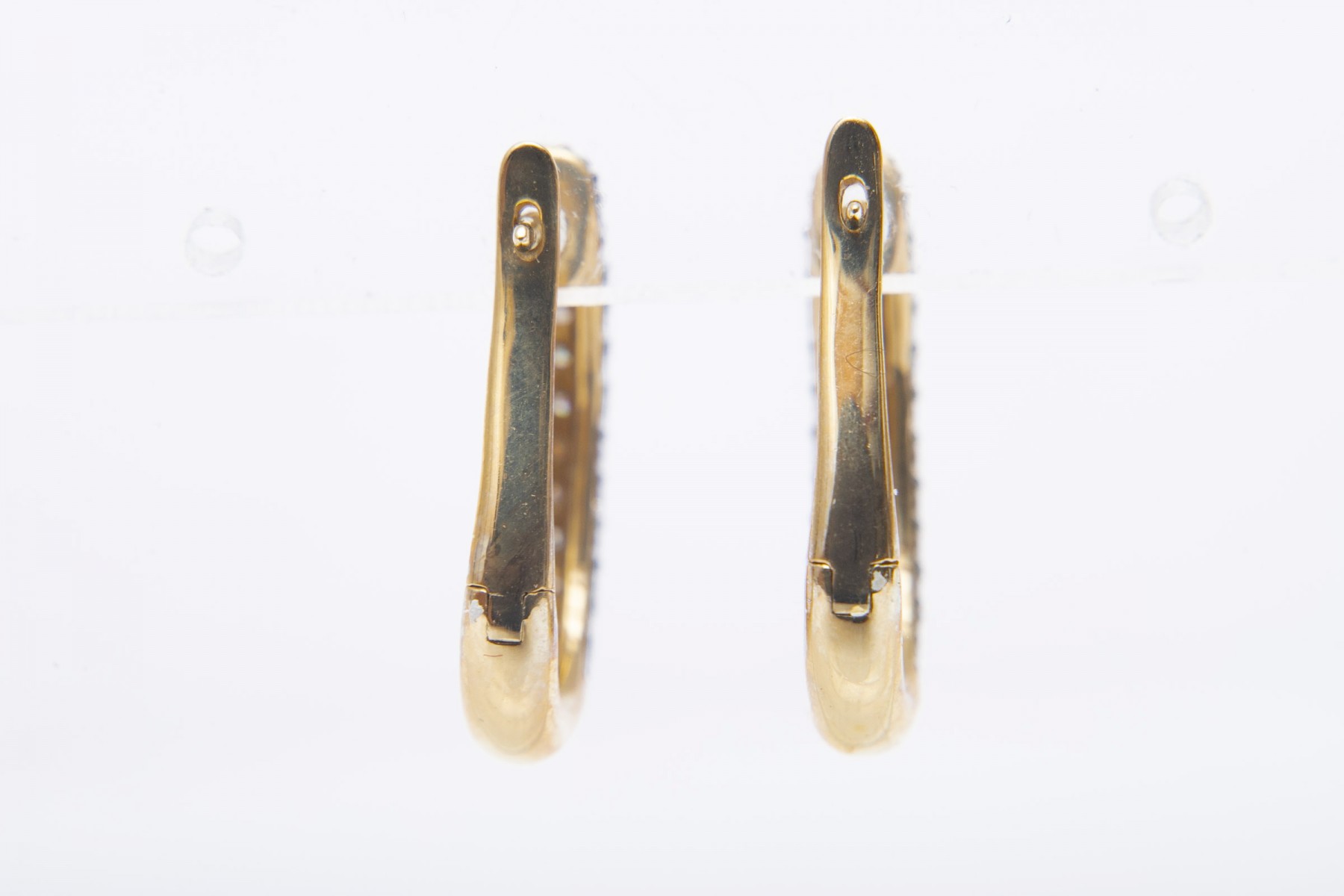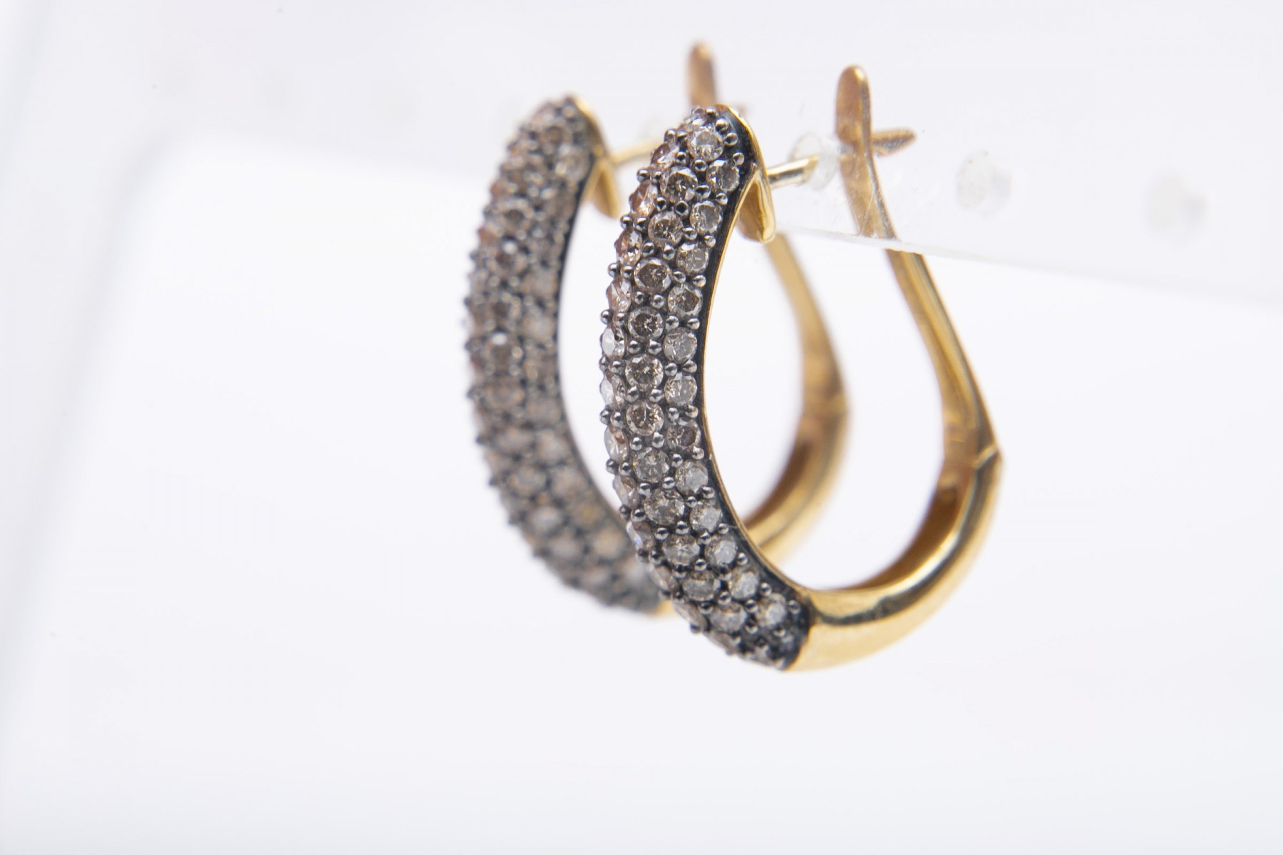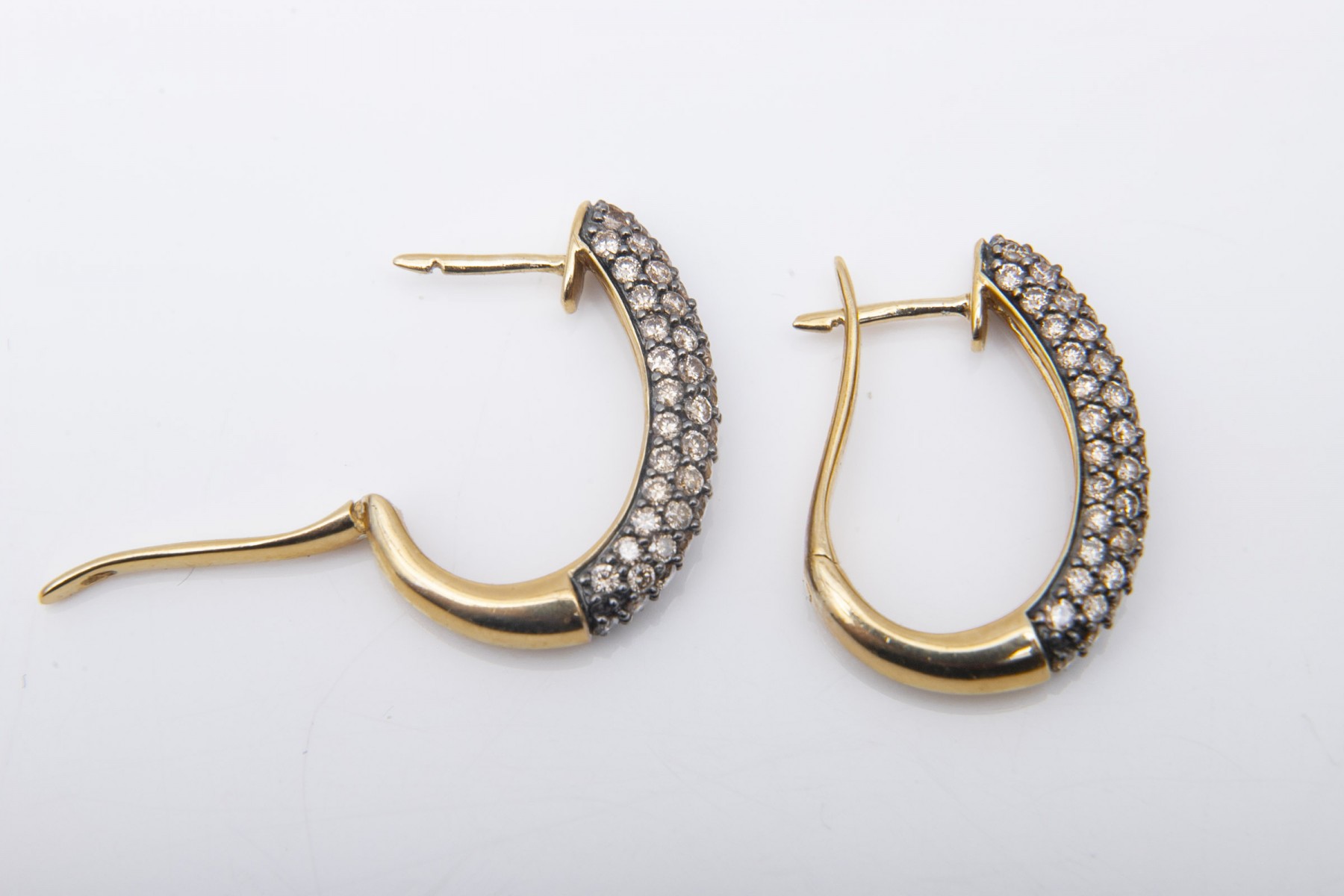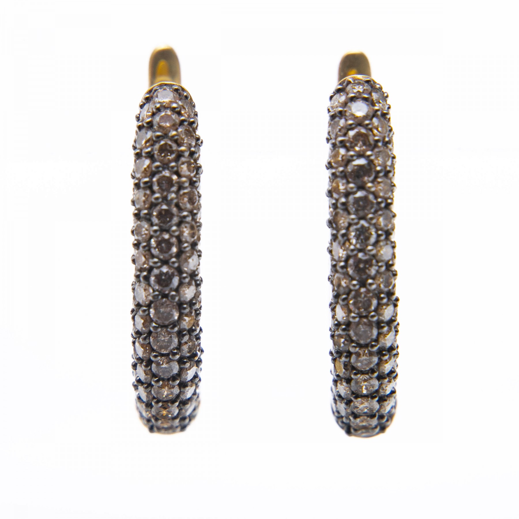 An elegant pair of yellow gold U-shaped hoop earrings displaying clusters of round diamonds against black channels for excellent contrast and visual interest.