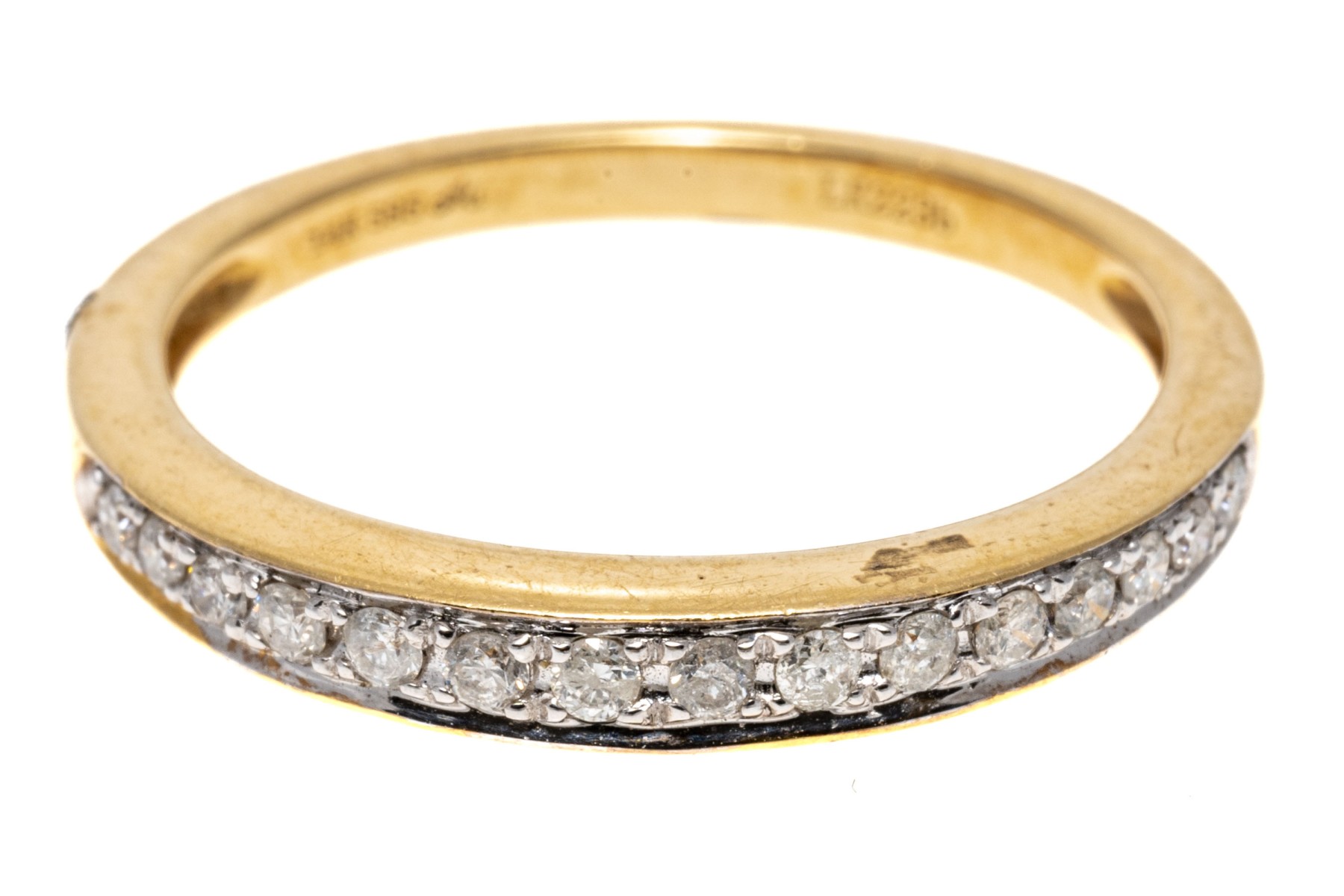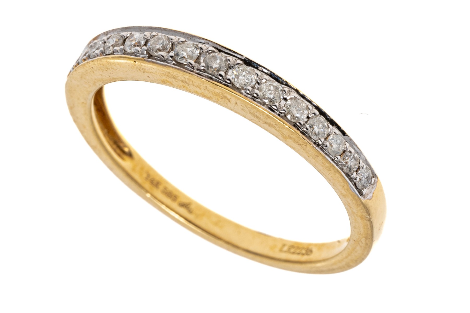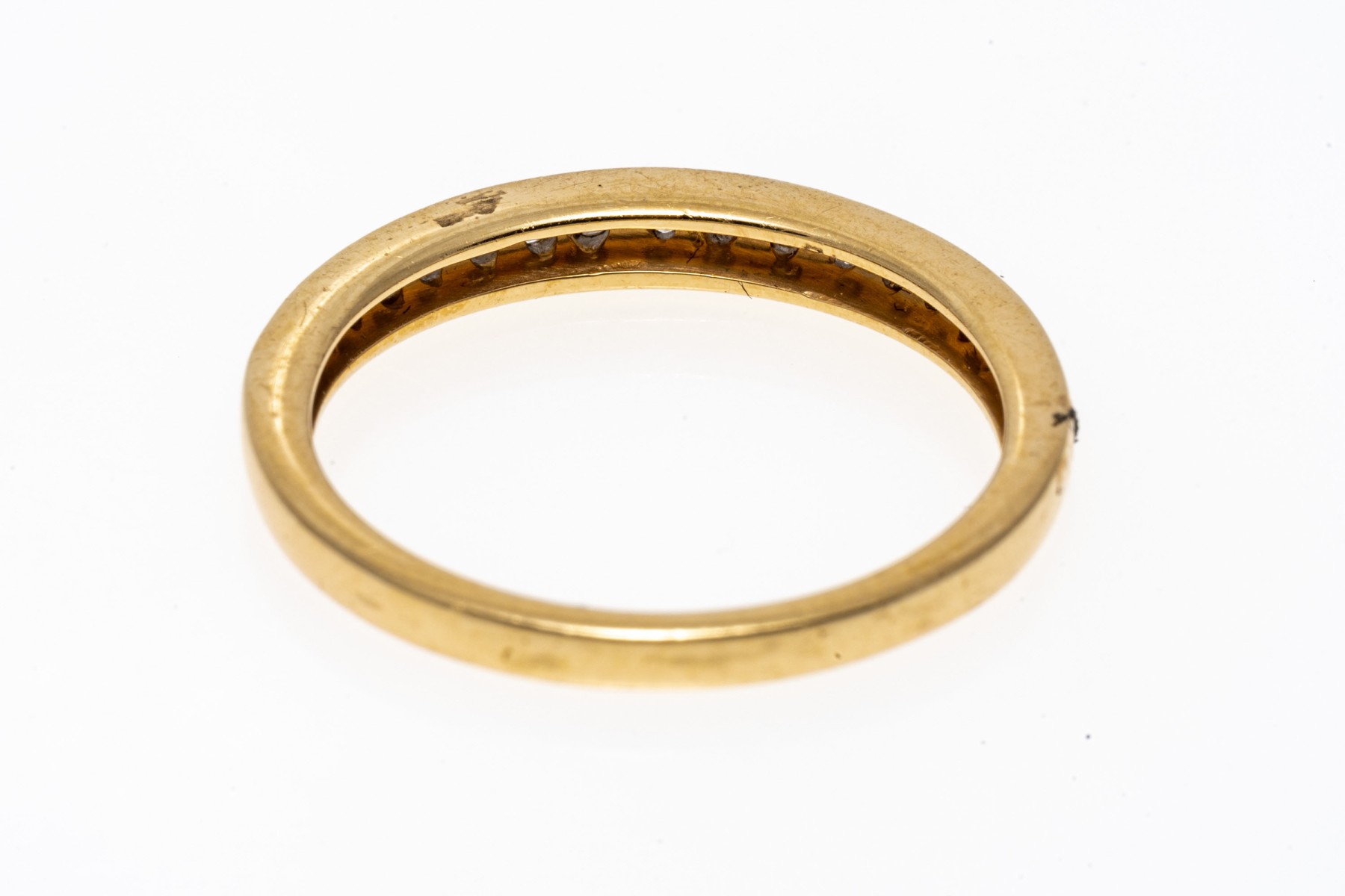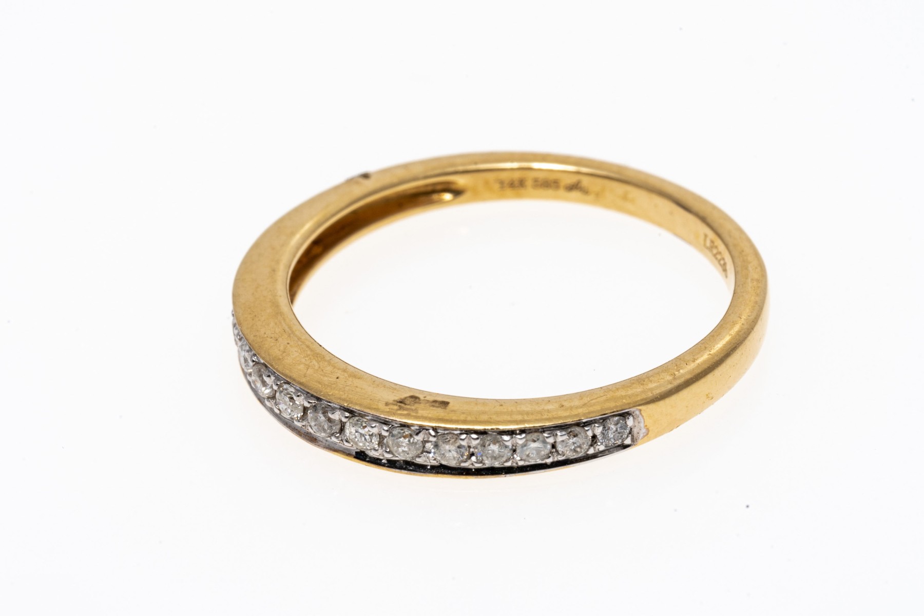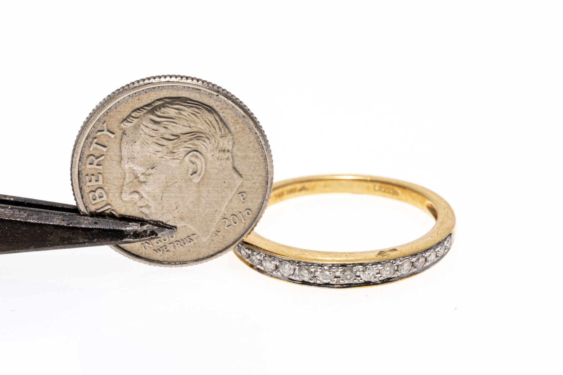 A classy and understated yellow gold band displaying a row of brilliant cut diamonds, approximately 1.39 TCW.