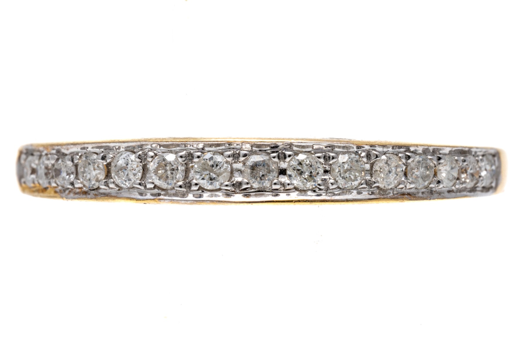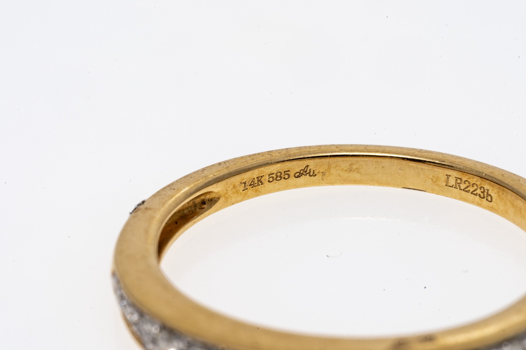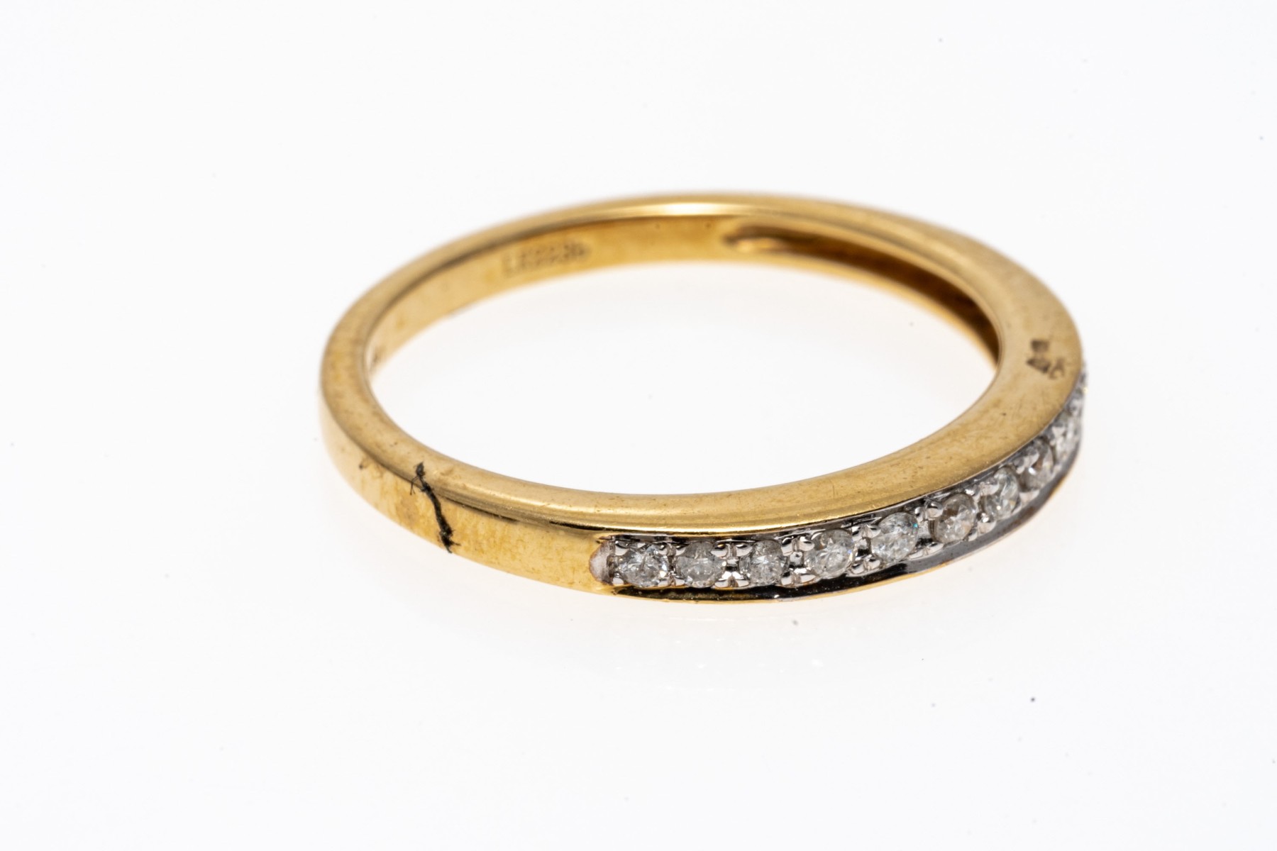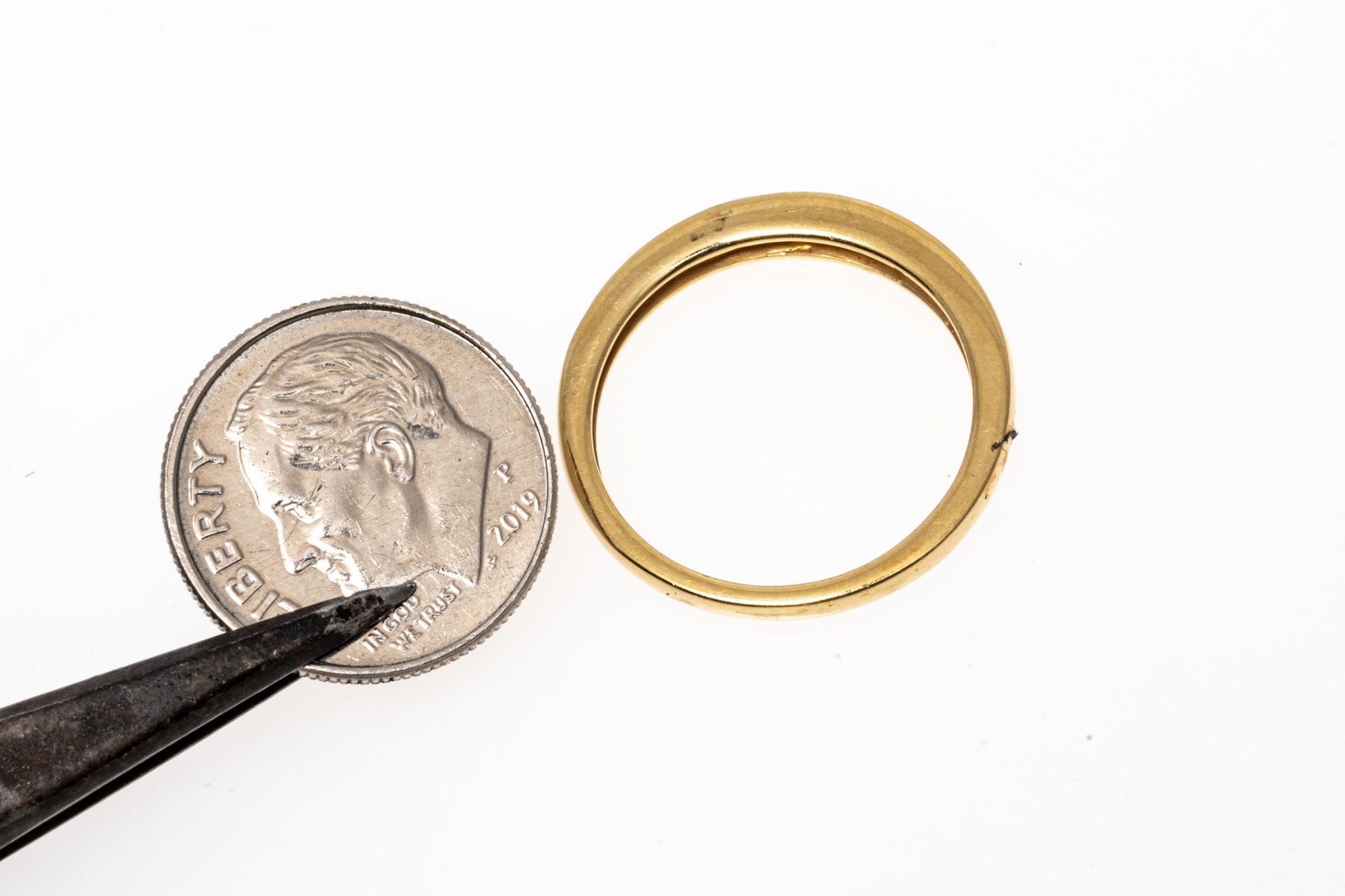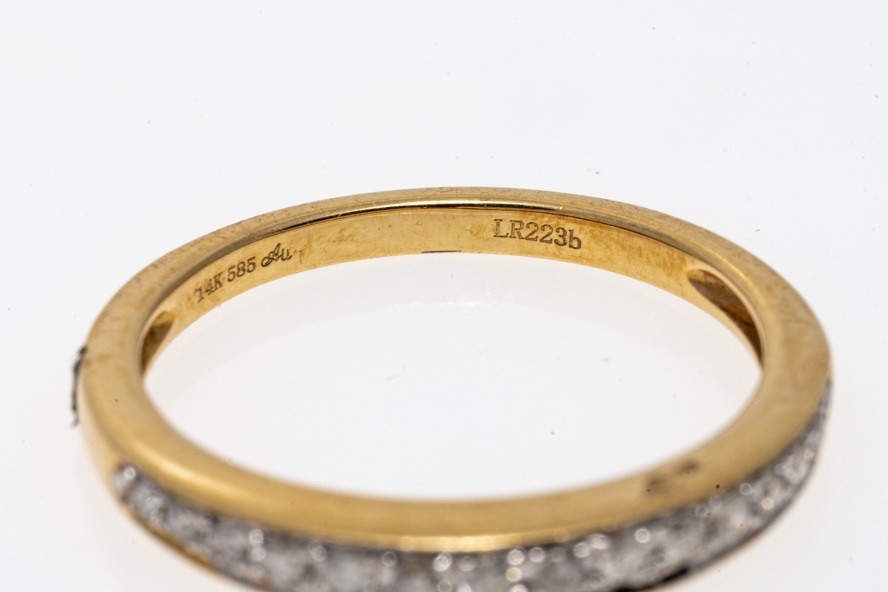 A classy and understated yellow gold band displaying a row of brilliant cut diamonds, approximately 1.39 TCW.