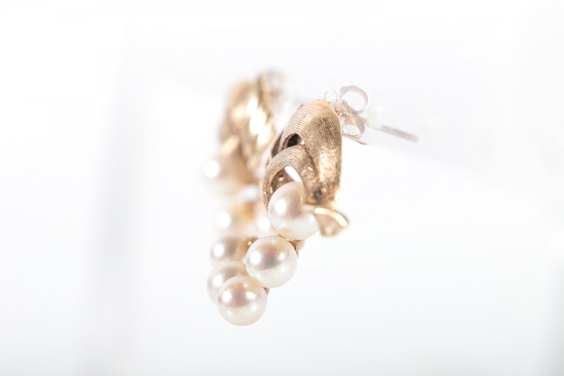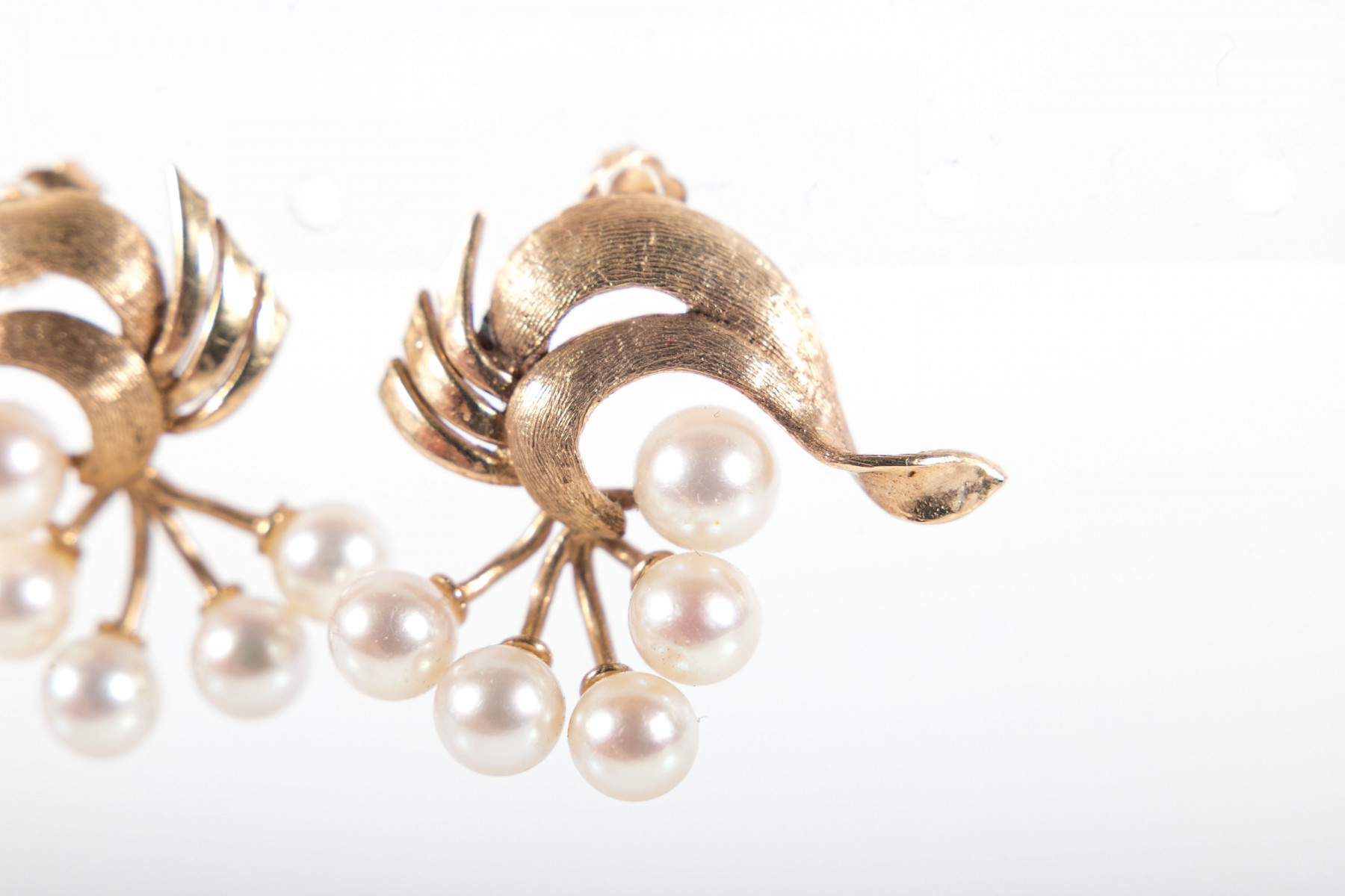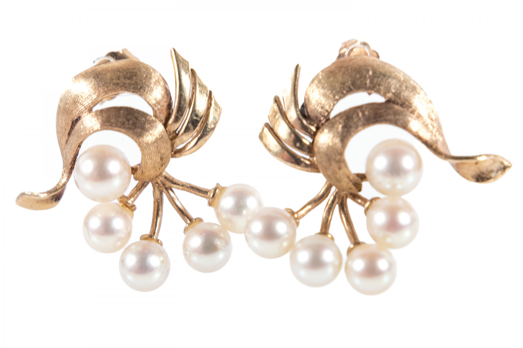 An elegant pair of yellow gold earrings displaying two dramatic curves with brushed textures and three short striations in a smooth finish, heralding flourishes of warm-toned white cultured pearls on stems of graduating length.