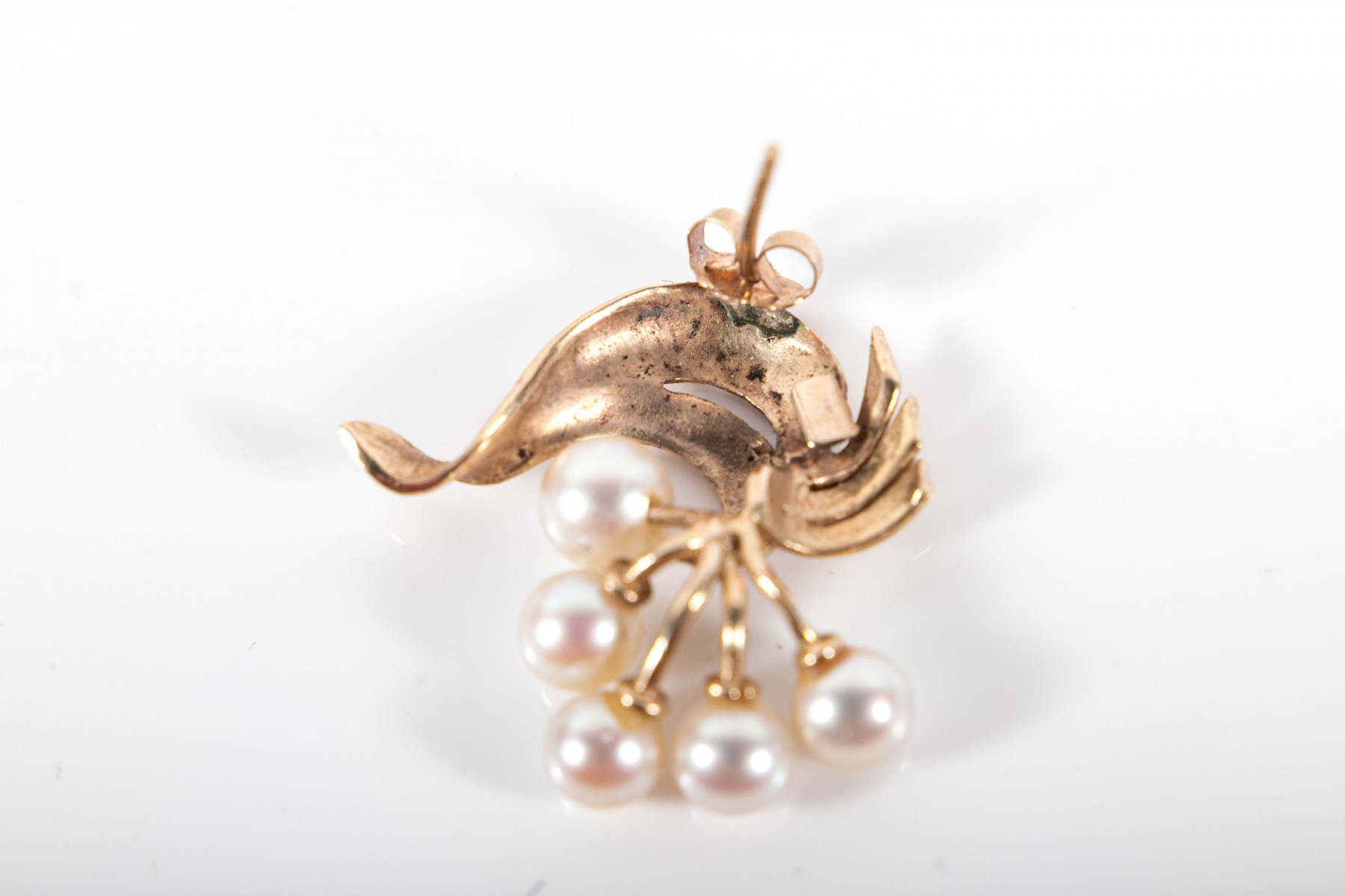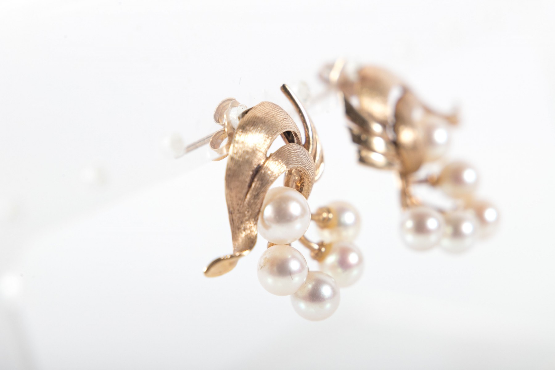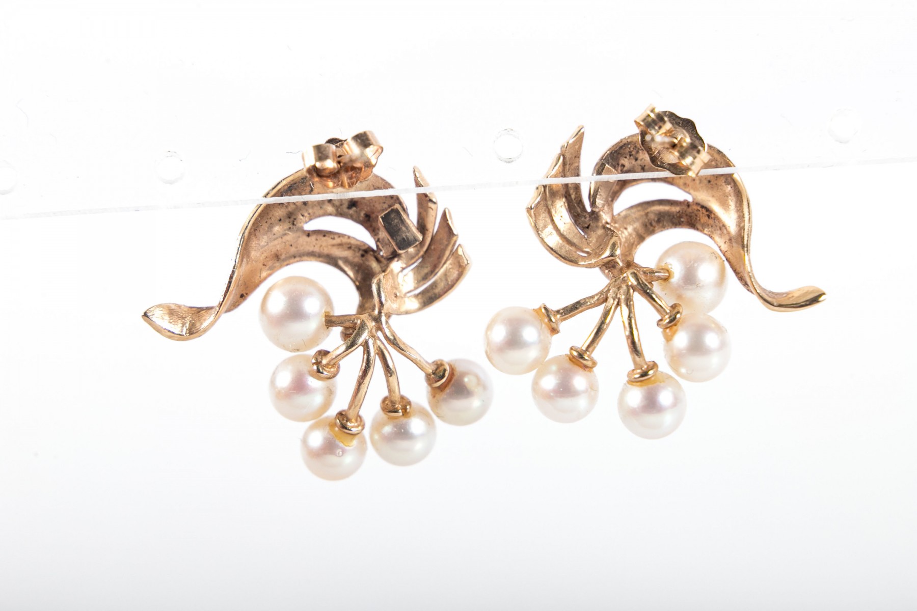 An elegant pair of yellow gold earrings displaying two dramatic curves with brushed textures and three short striations in a smooth finish, heralding flourishes of warm-toned white cultured pearls on stems of graduating length.