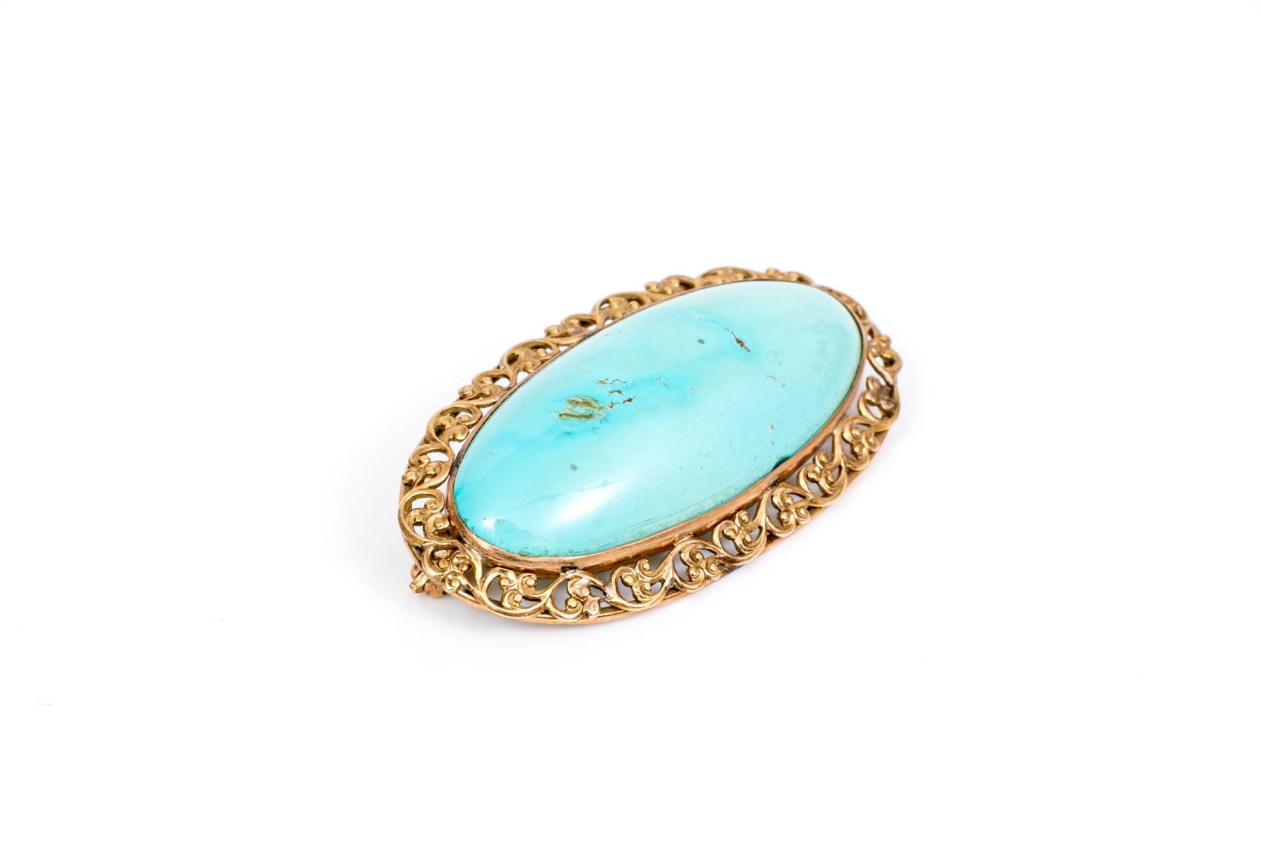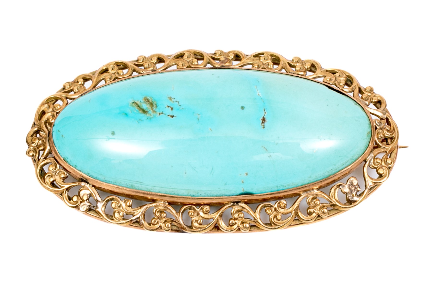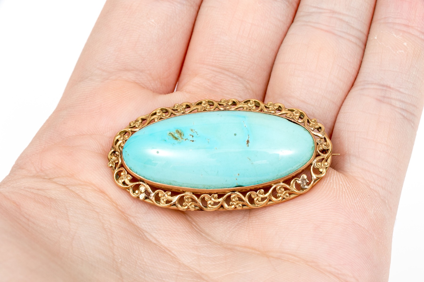 14k yellow gold elongated oval cabachon ornate bordered turquoise brooch