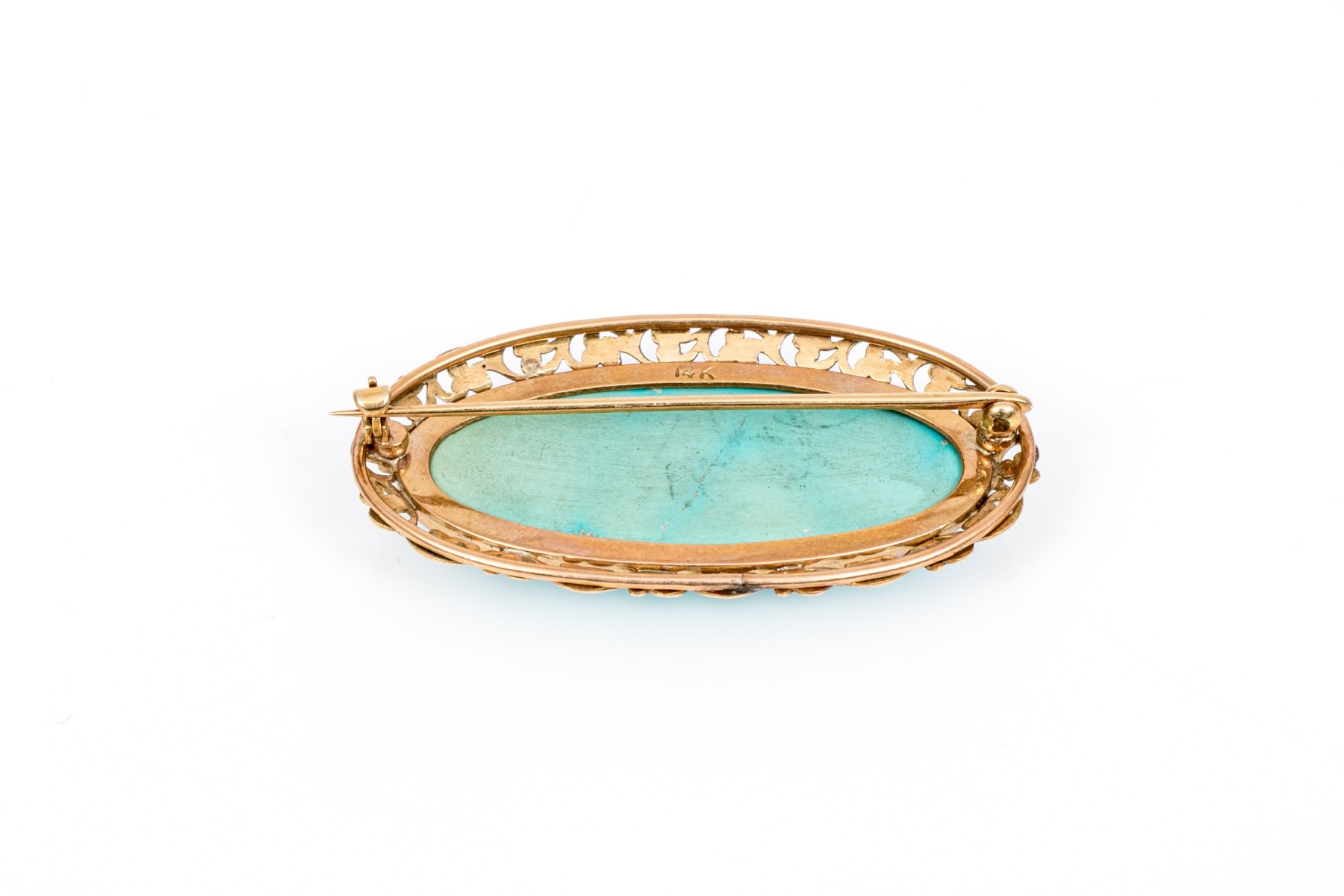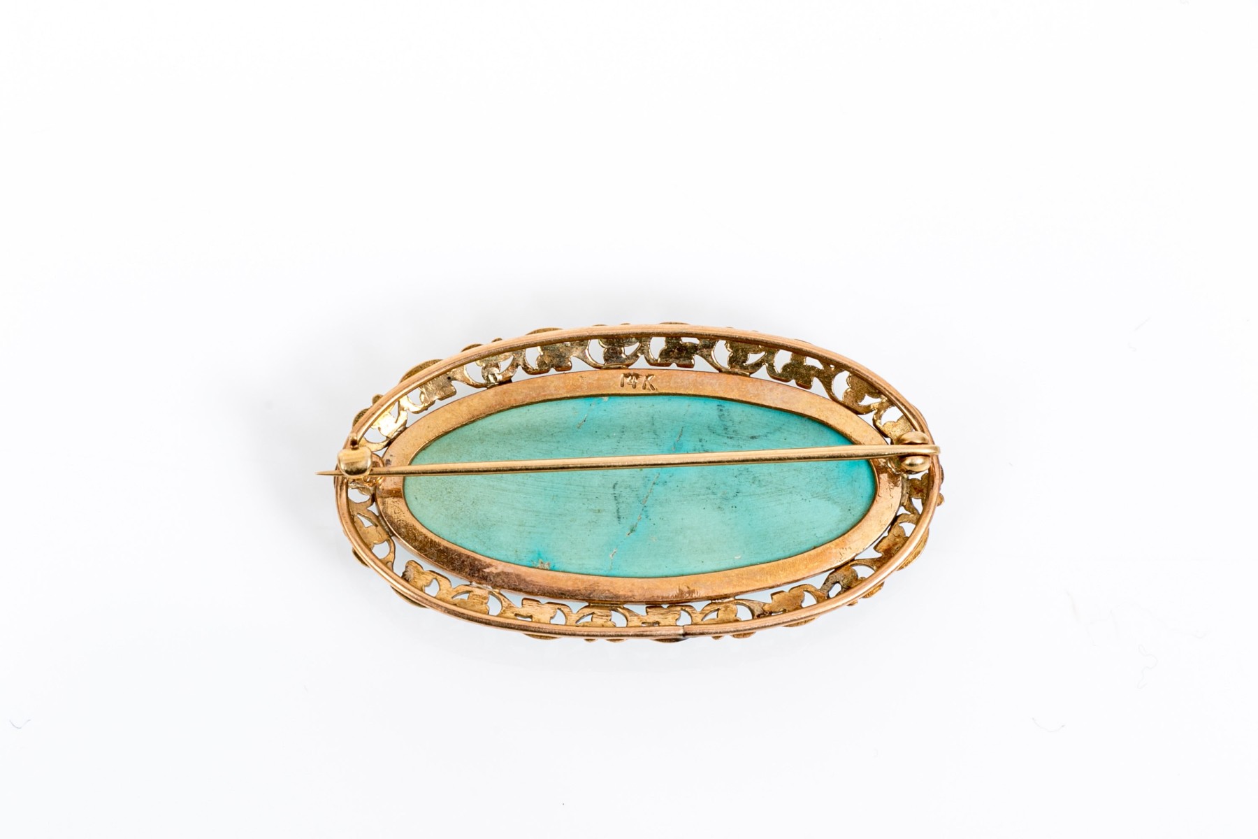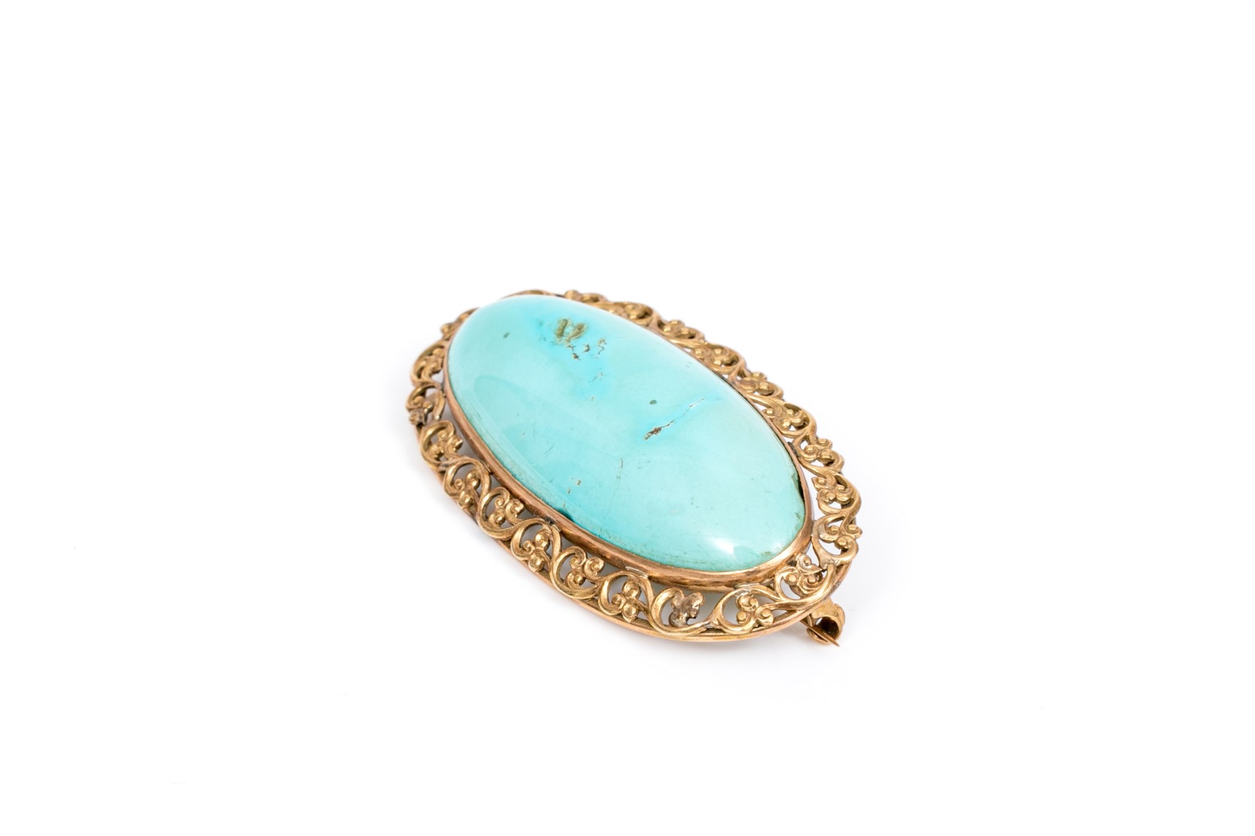 14k yellow gold elongated oval cabachon ornate bordered turquoise brooch