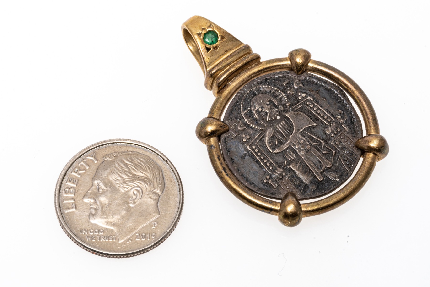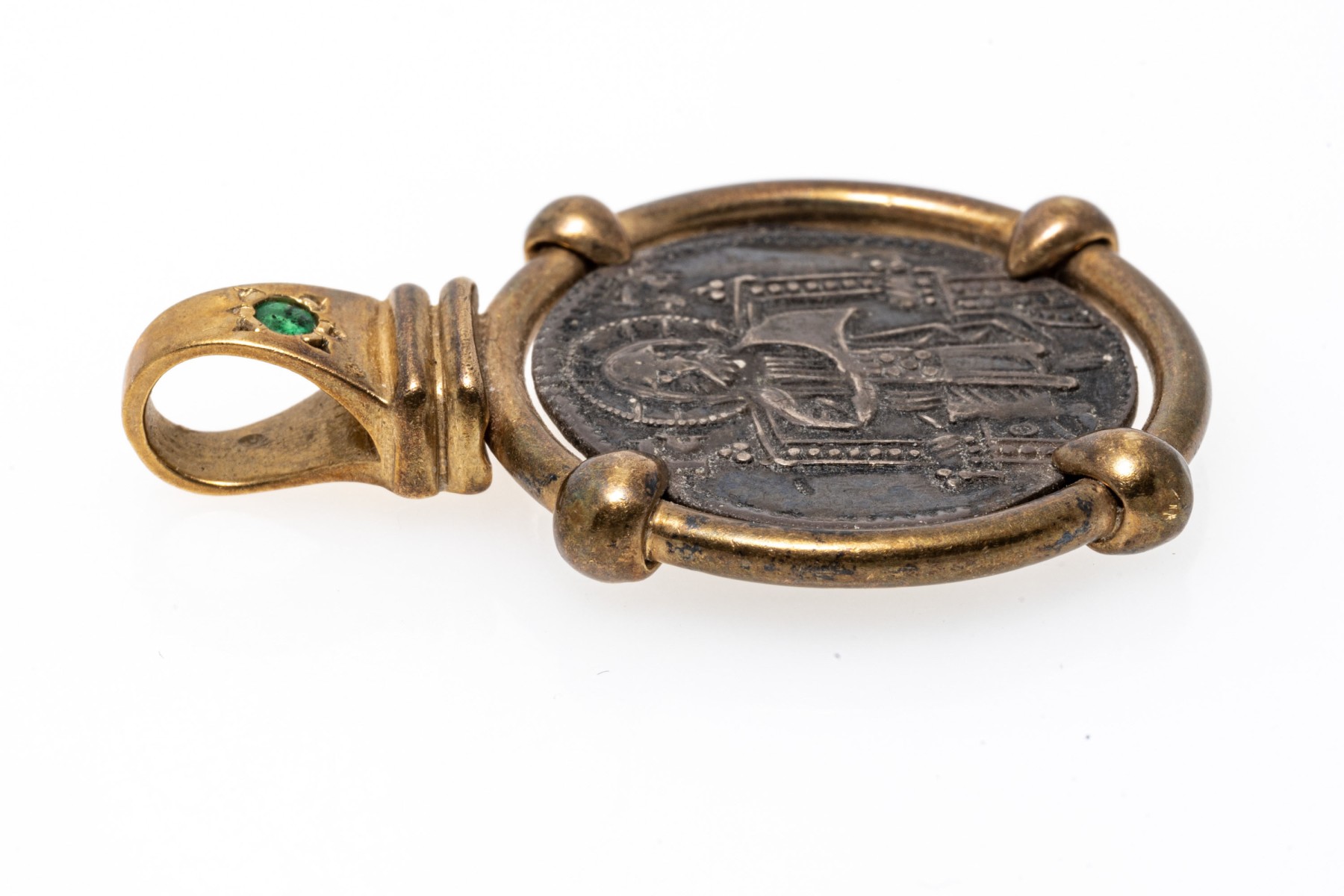 14k yellow gold handsome coin motif pendant, featuring a gold border and bale, topped with a round faceted emerald, approximately 0.06 CTS, finished with a solid bale