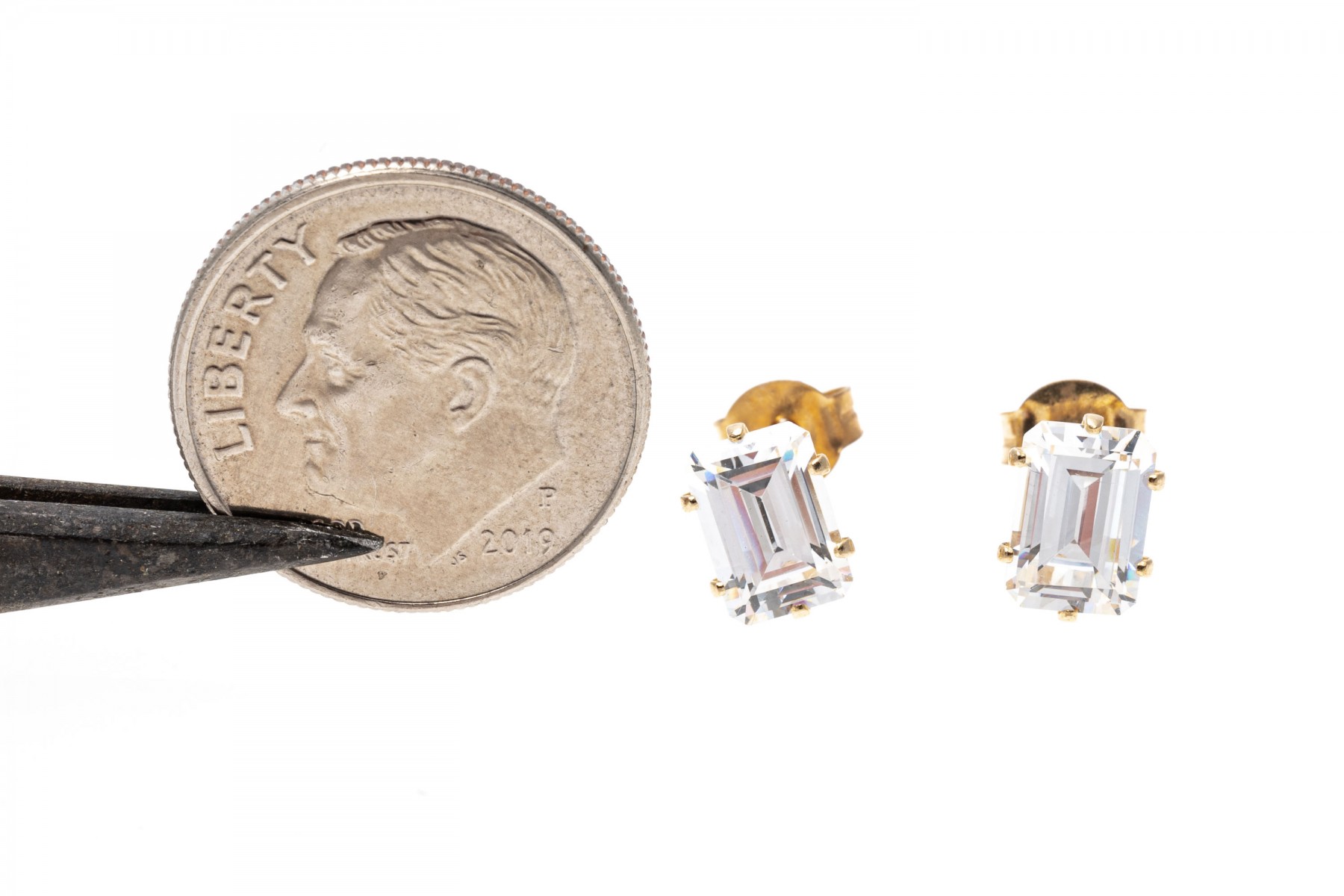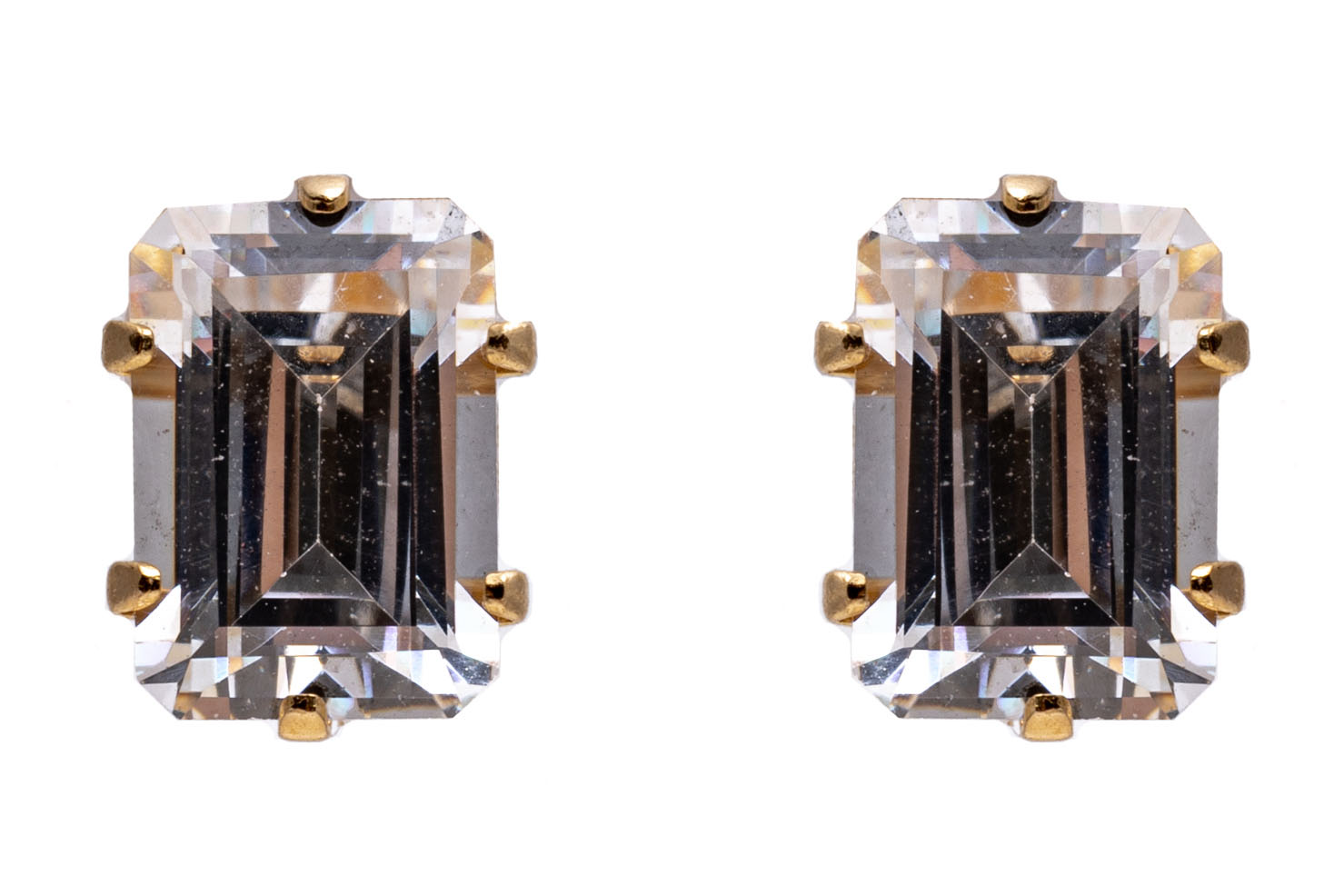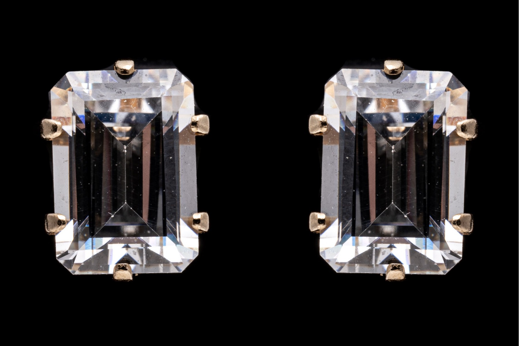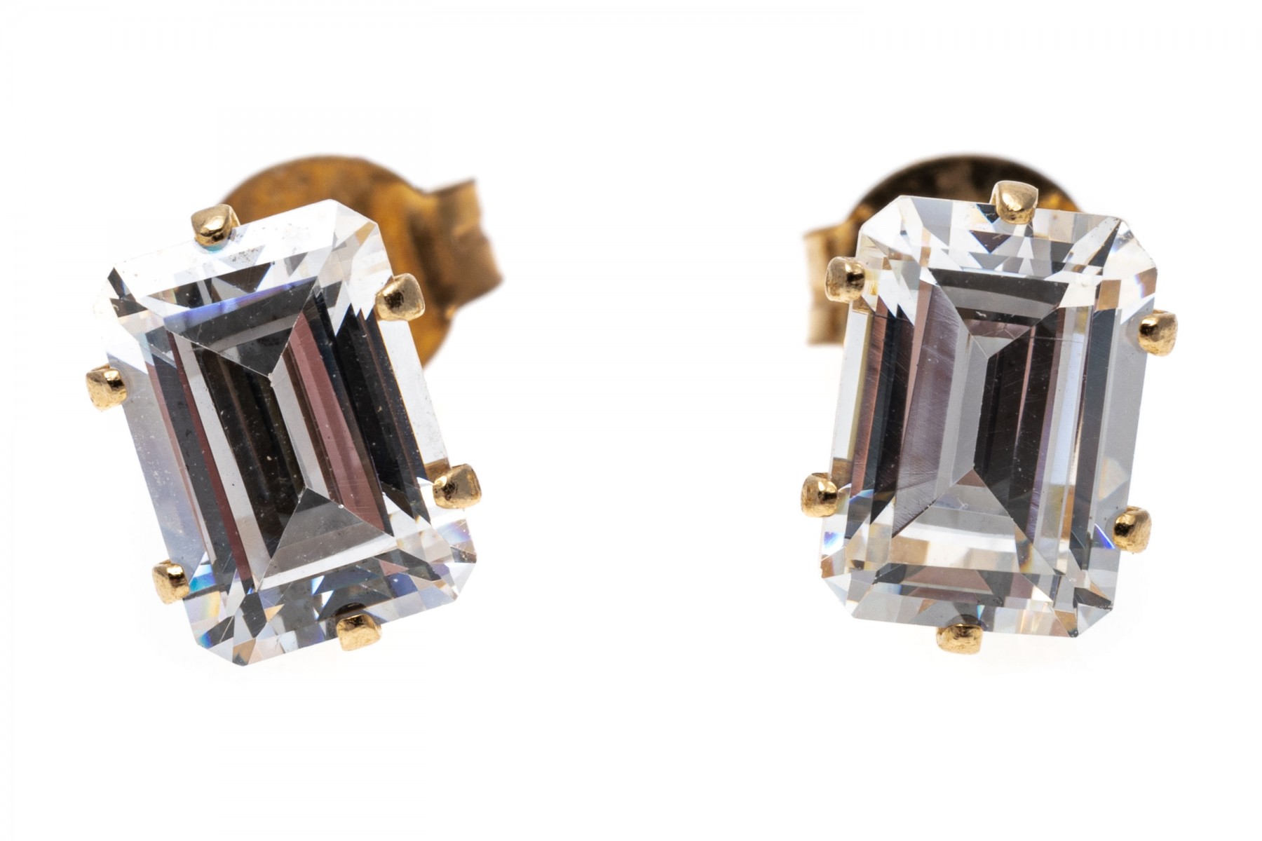 14k yellow gold earrings. These classic stud earrings contain an emerald cut cz stone, set in a six prong mounting. The earrings have posts with clutch style backs.