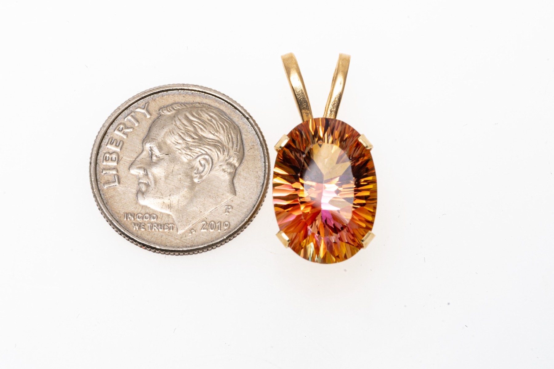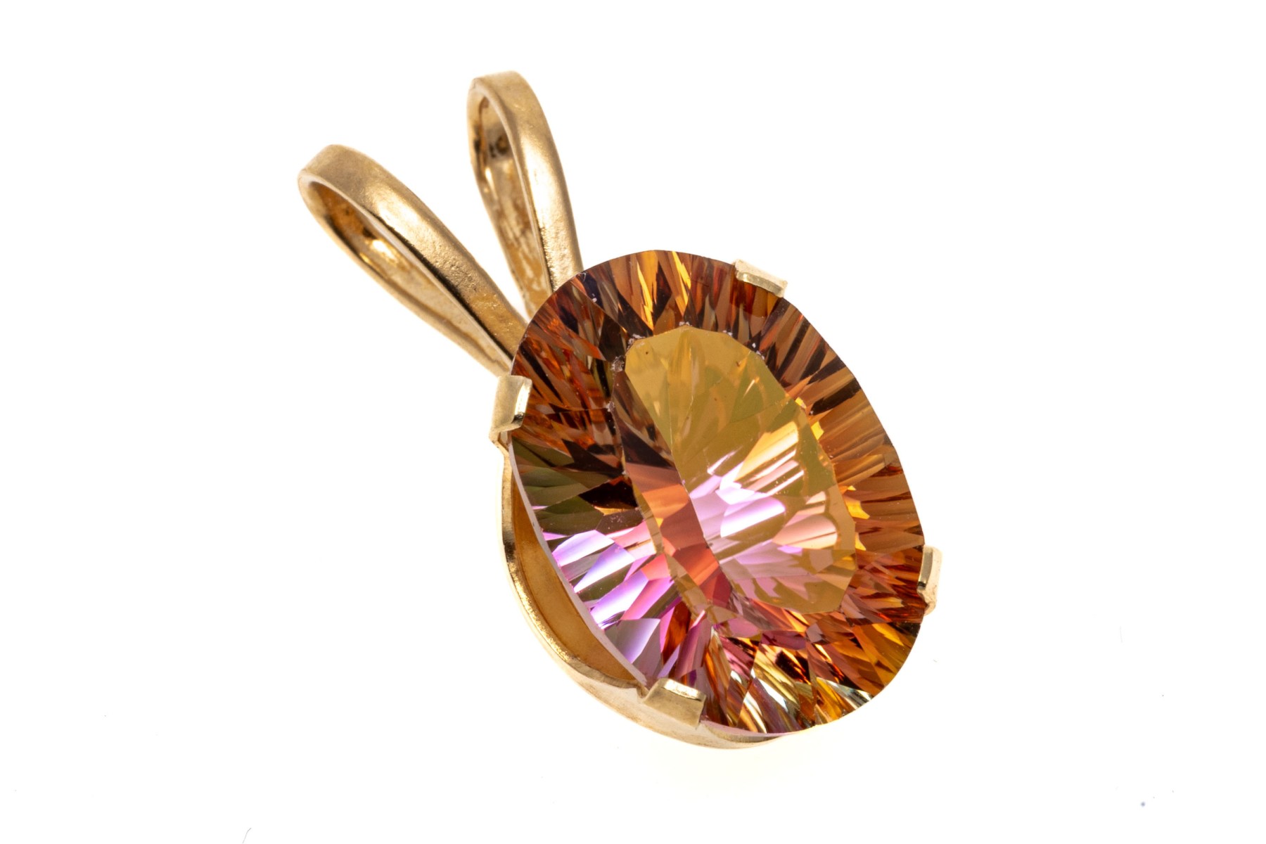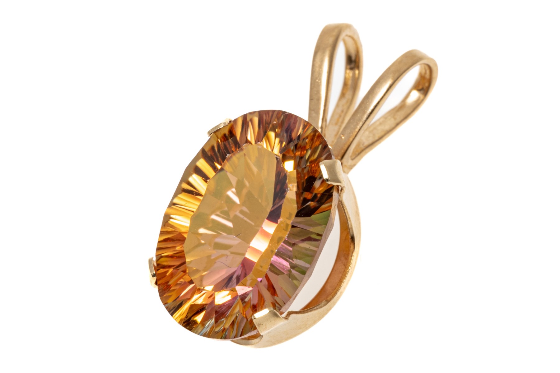 14k yellow gold eye-catching pendant featuring a large oval faceted, fantasy cut sunrise mystic topaz, prong set in a basket style mounting, and finished by a split style bale