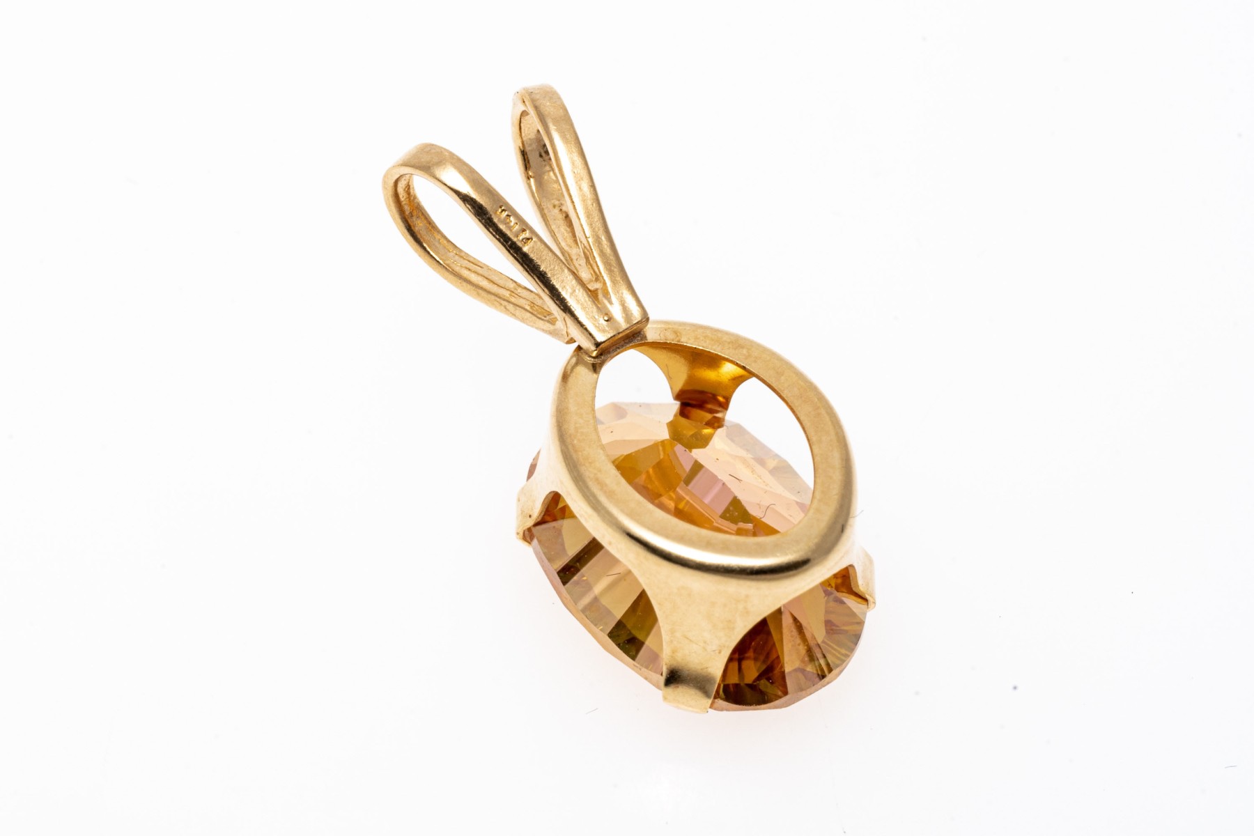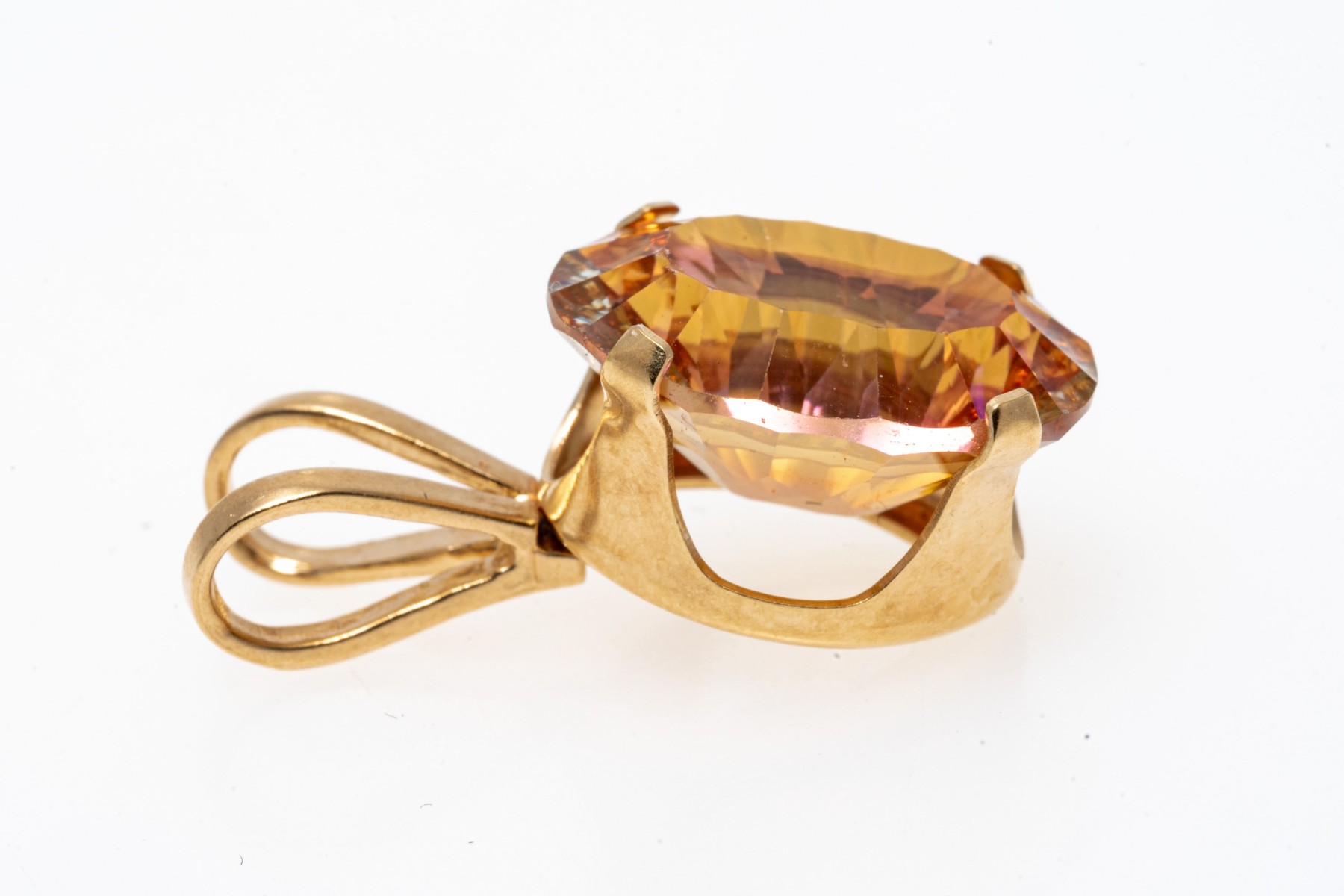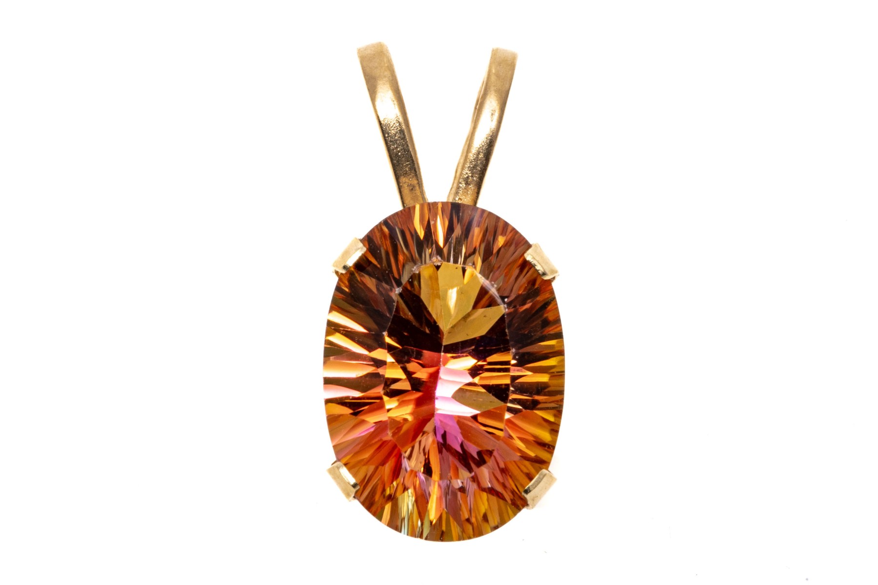 14k yellow gold eye-catching pendant featuring a large oval faceted, fantasy cut sunrise mystic topaz, prong set in a basket style mounting, and finished by a split style bale