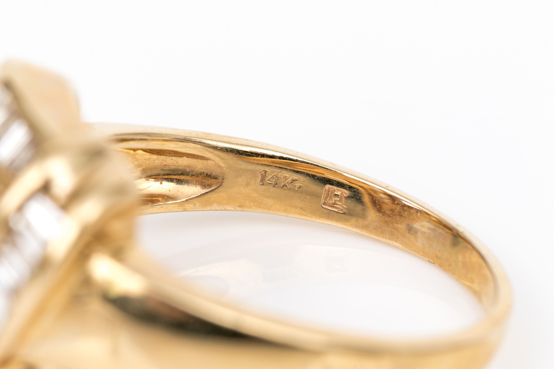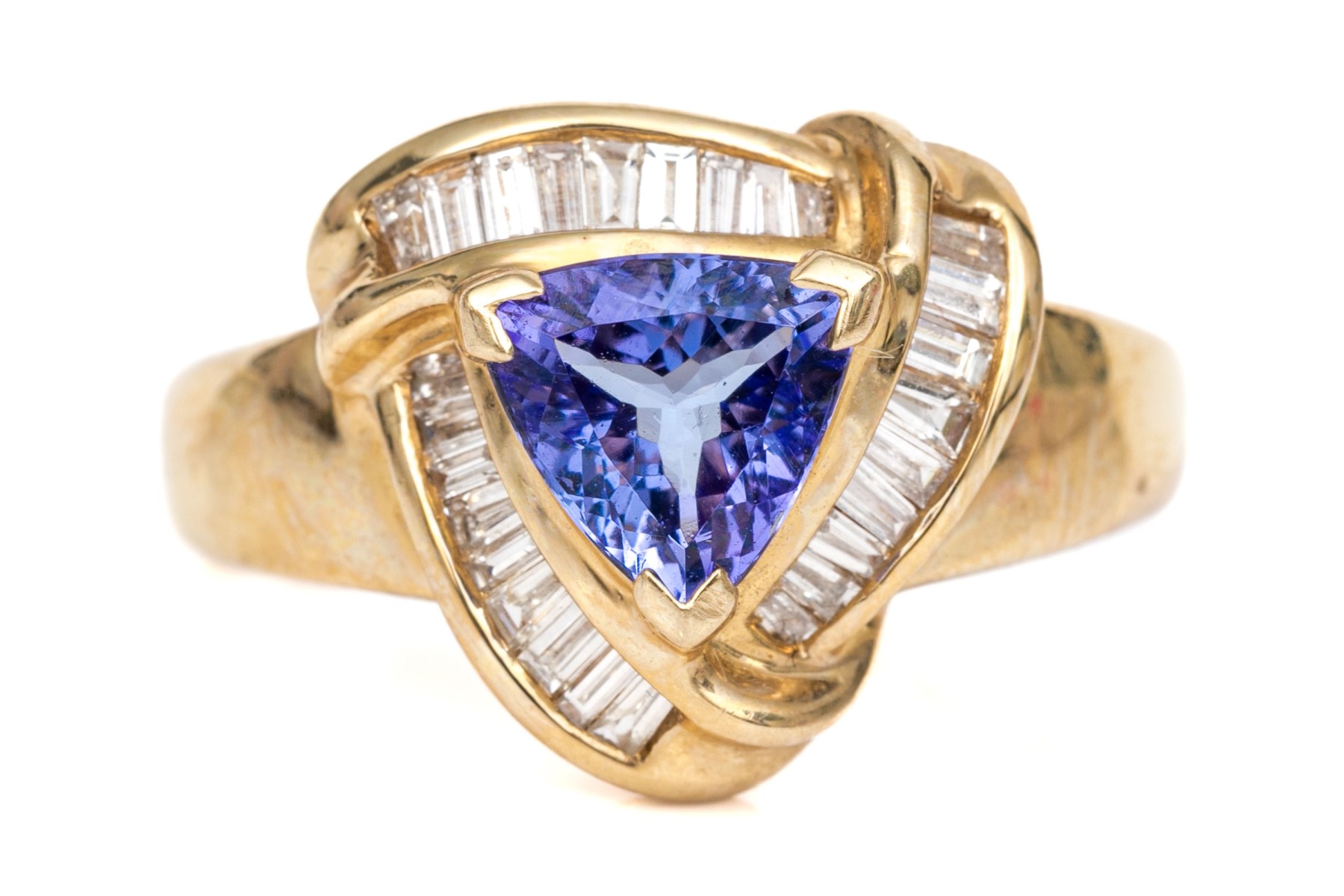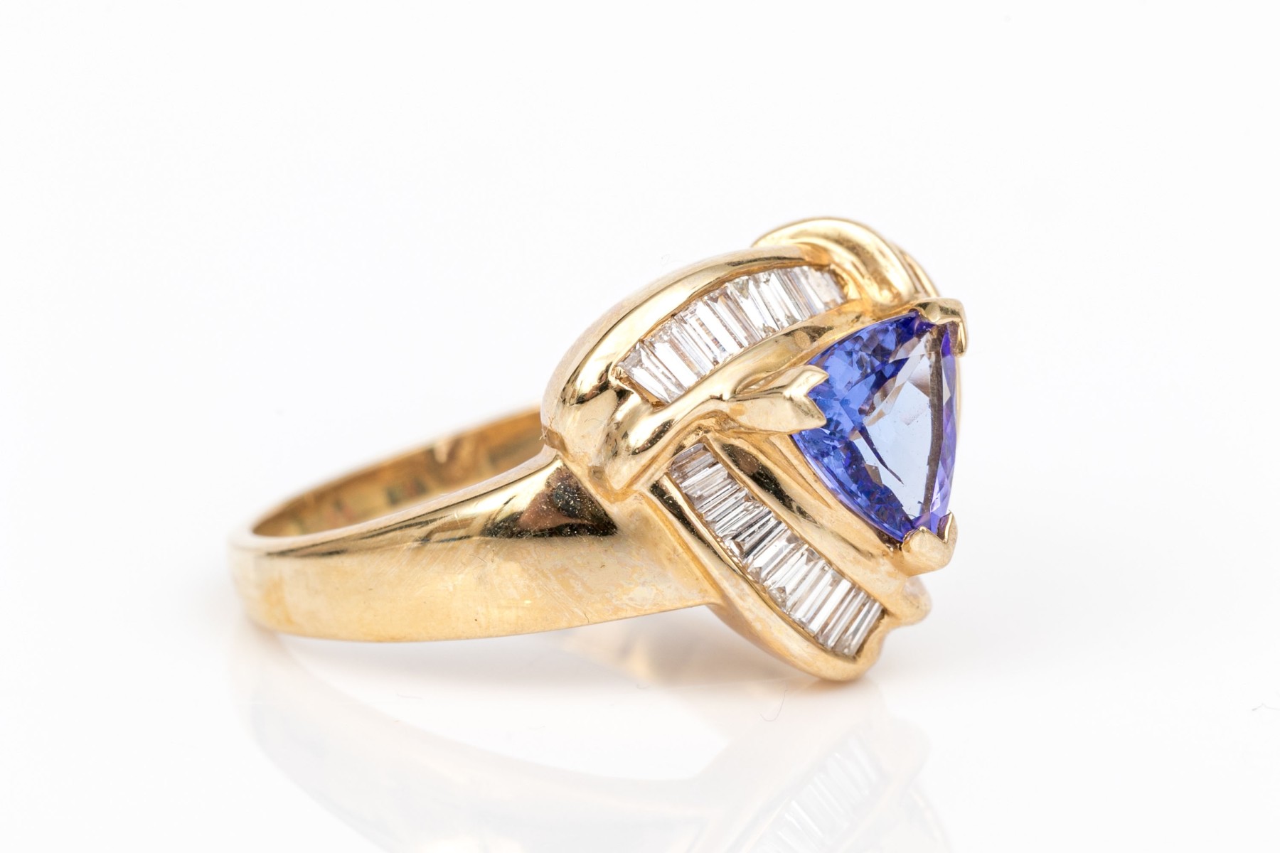 14k yellow gold fabulous contemporary tanzanite and baguette diamond halo ring, size 8.75. This fabulous ring features a trillion shaped tanzanite, app. 0.87 CTS, surrounded by a halo of baguette cut diamonds, app. 0.54 TCW.