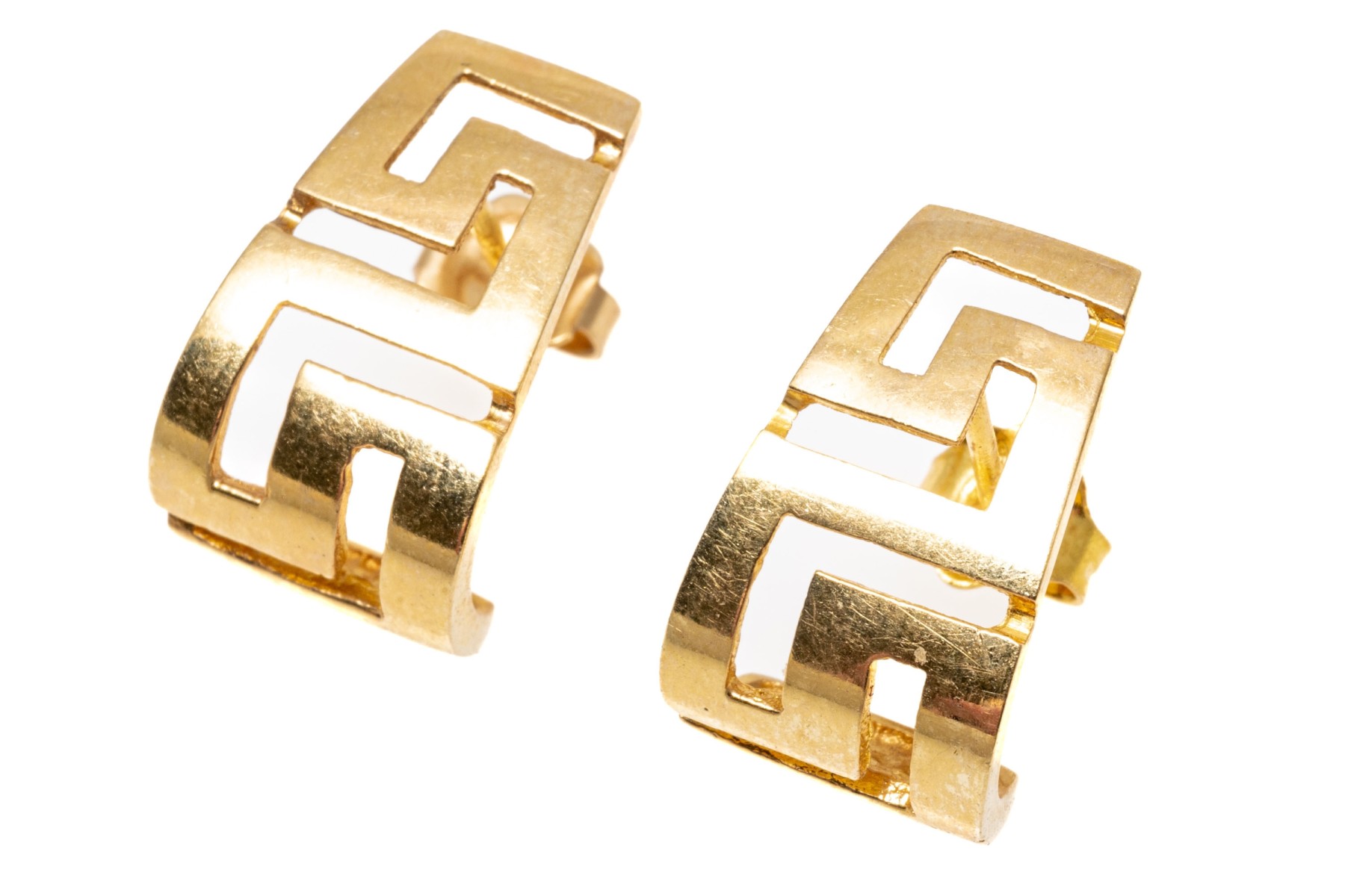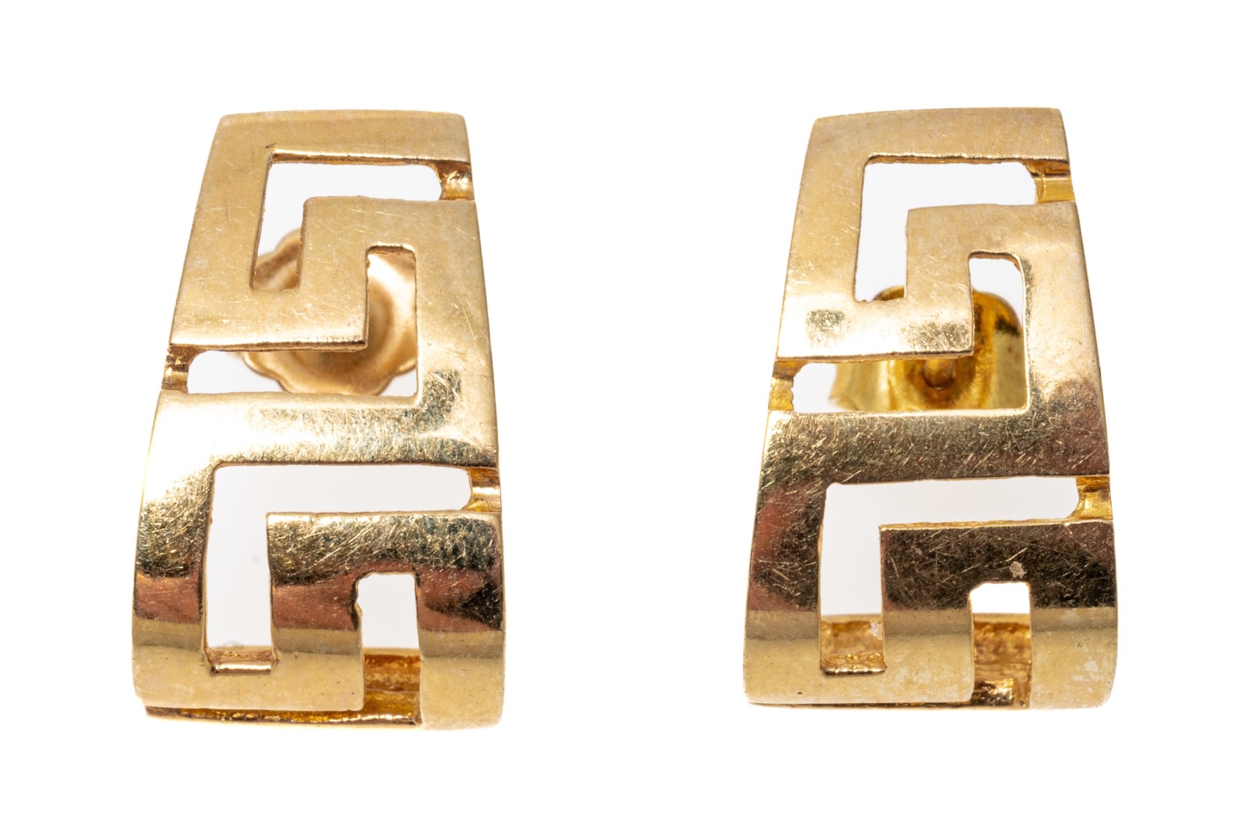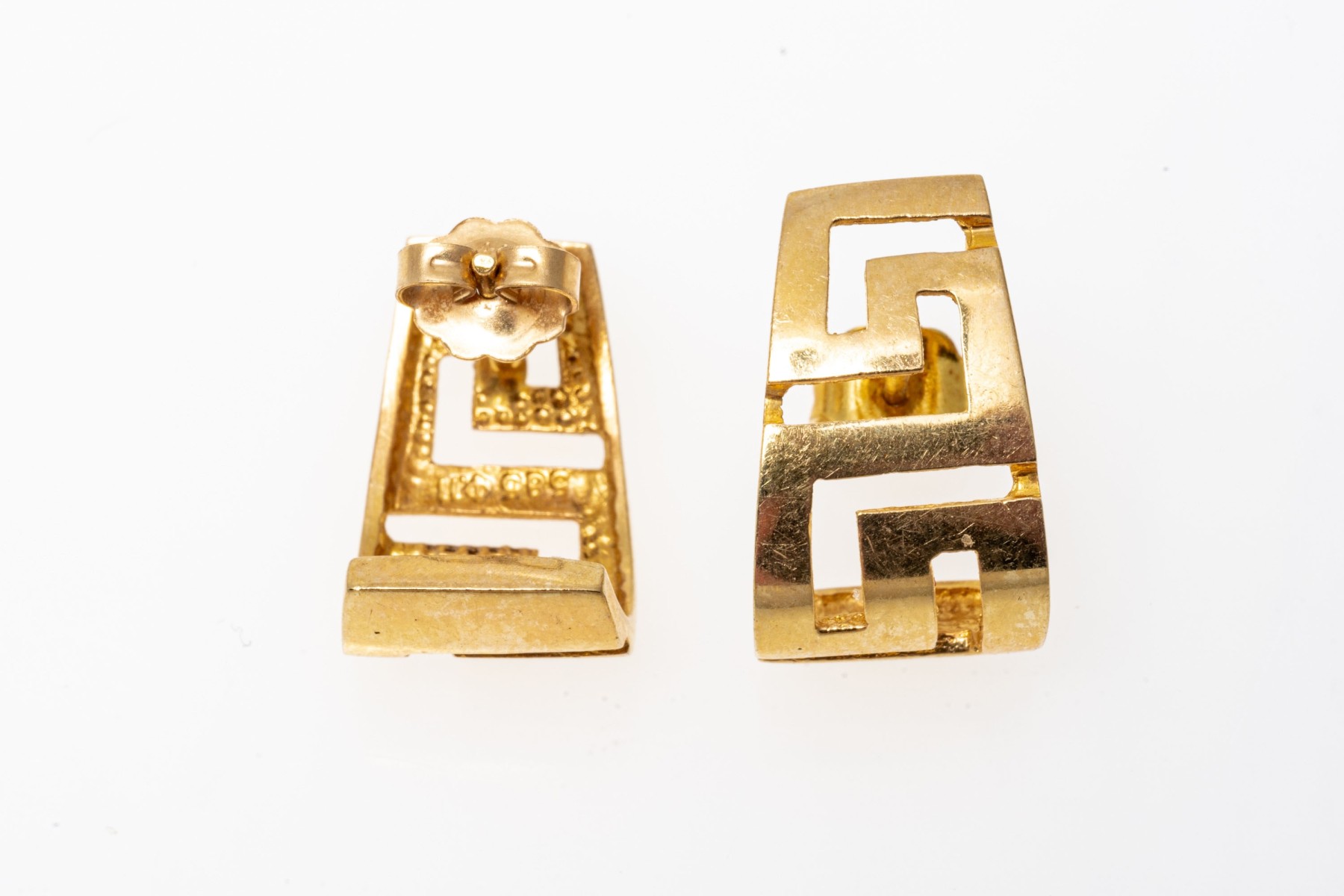 14k yellow gold fabulous Greek key patterned "J" hoop earrings, finished with posts and gold filled clutch style backs