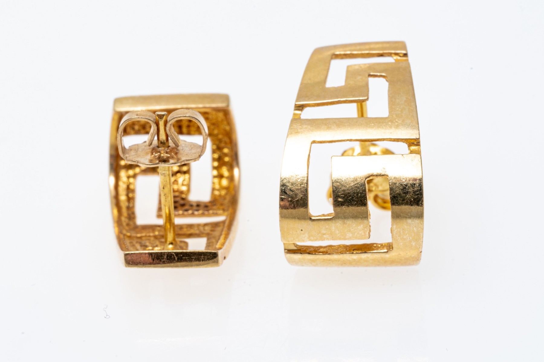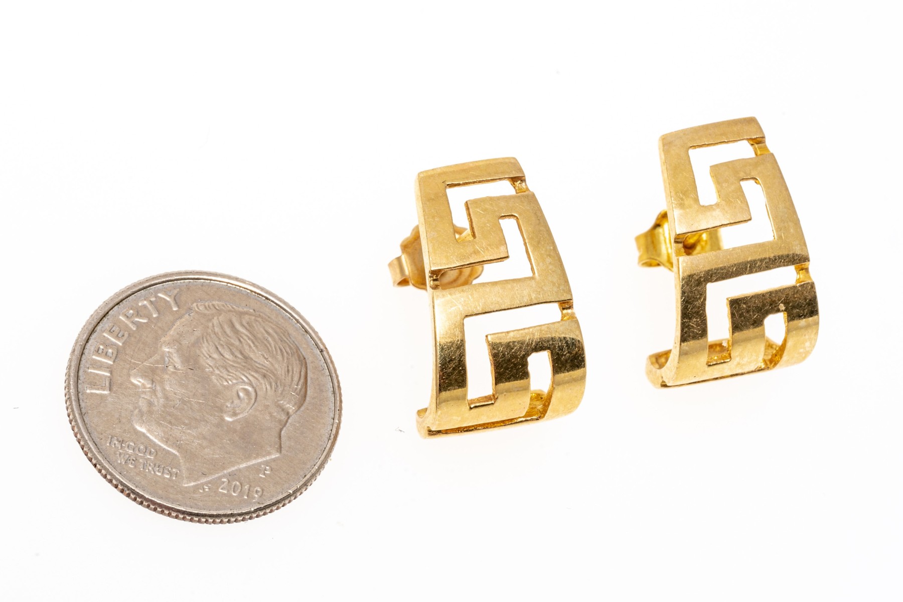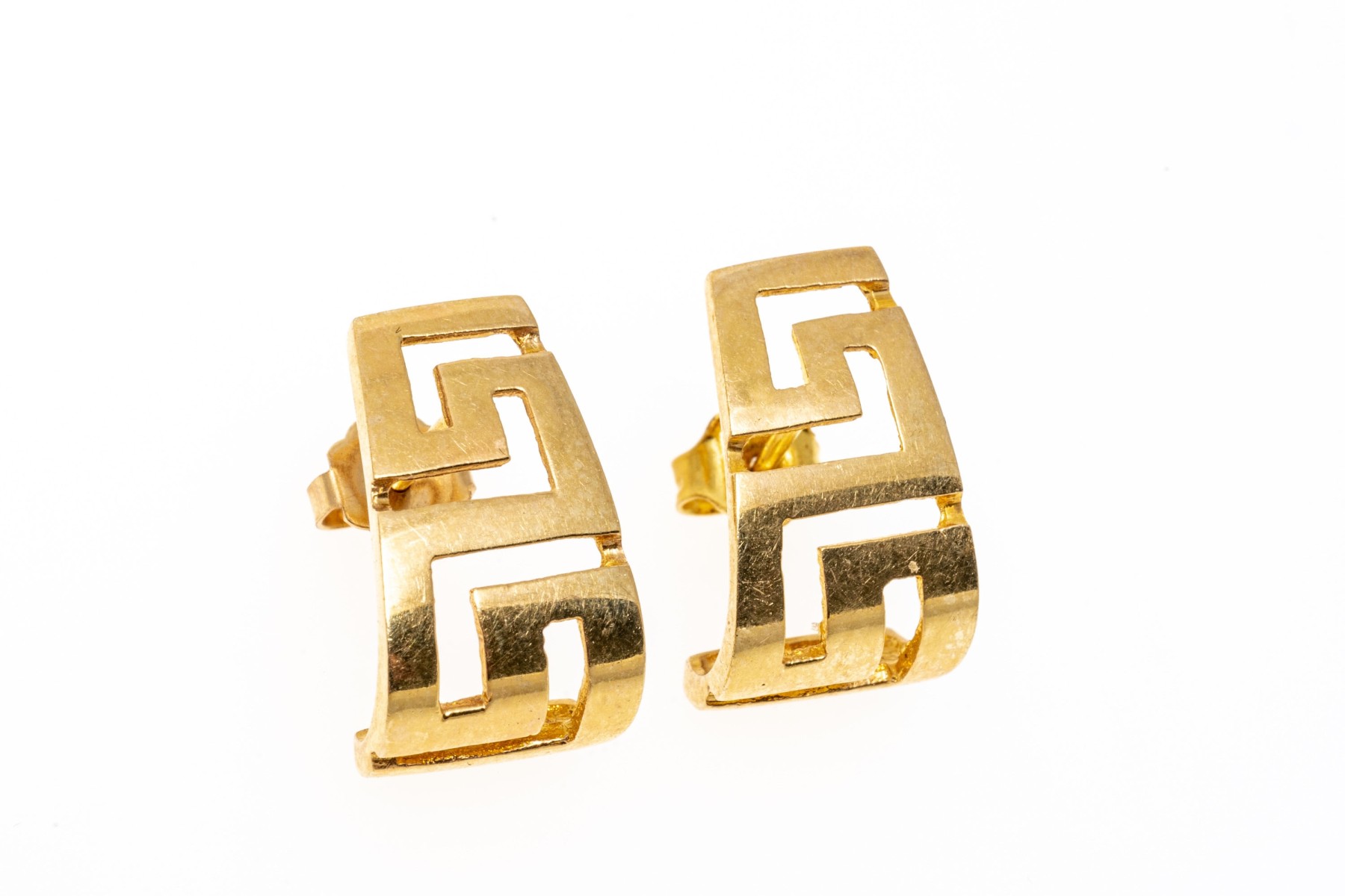 14k yellow gold fabulous Greek key patterned "J" hoop earrings, finished with posts and gold filled clutch style backs