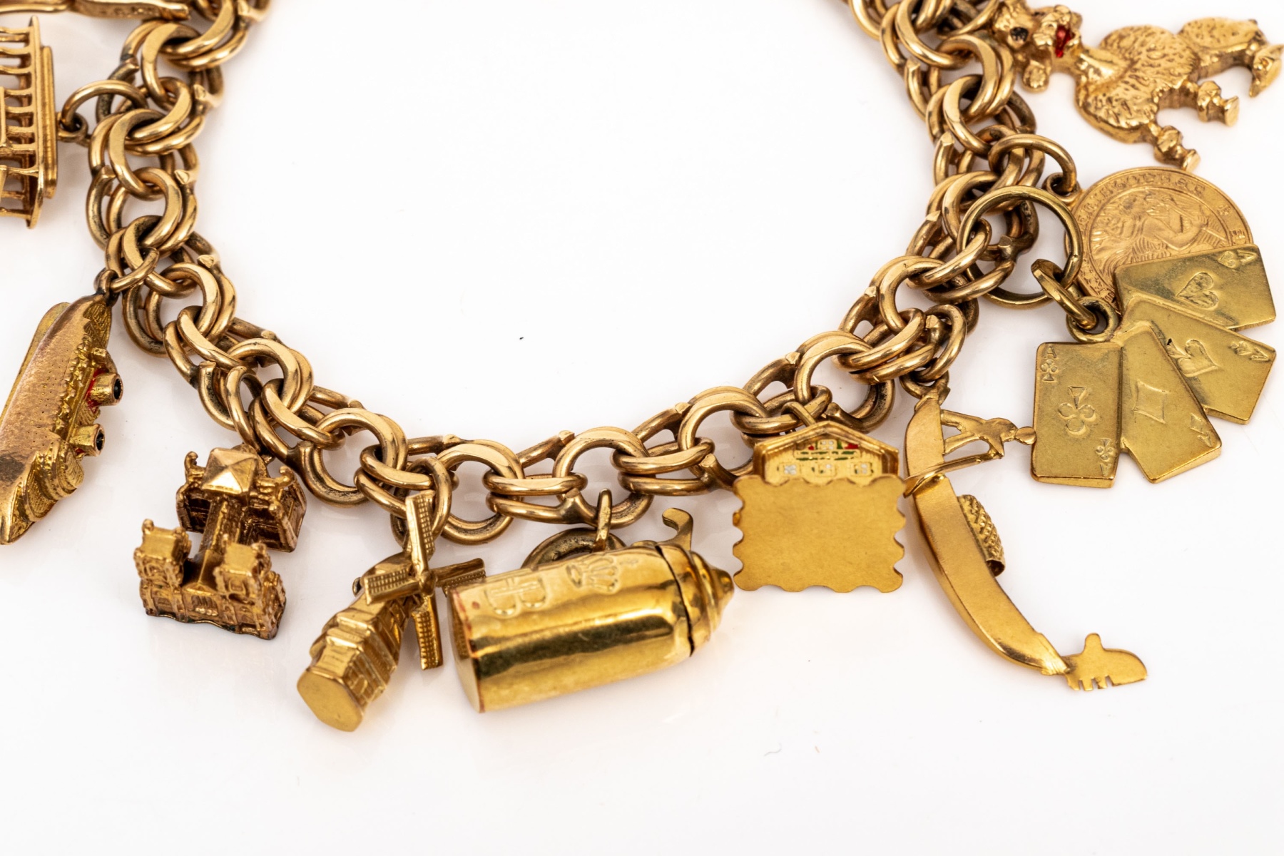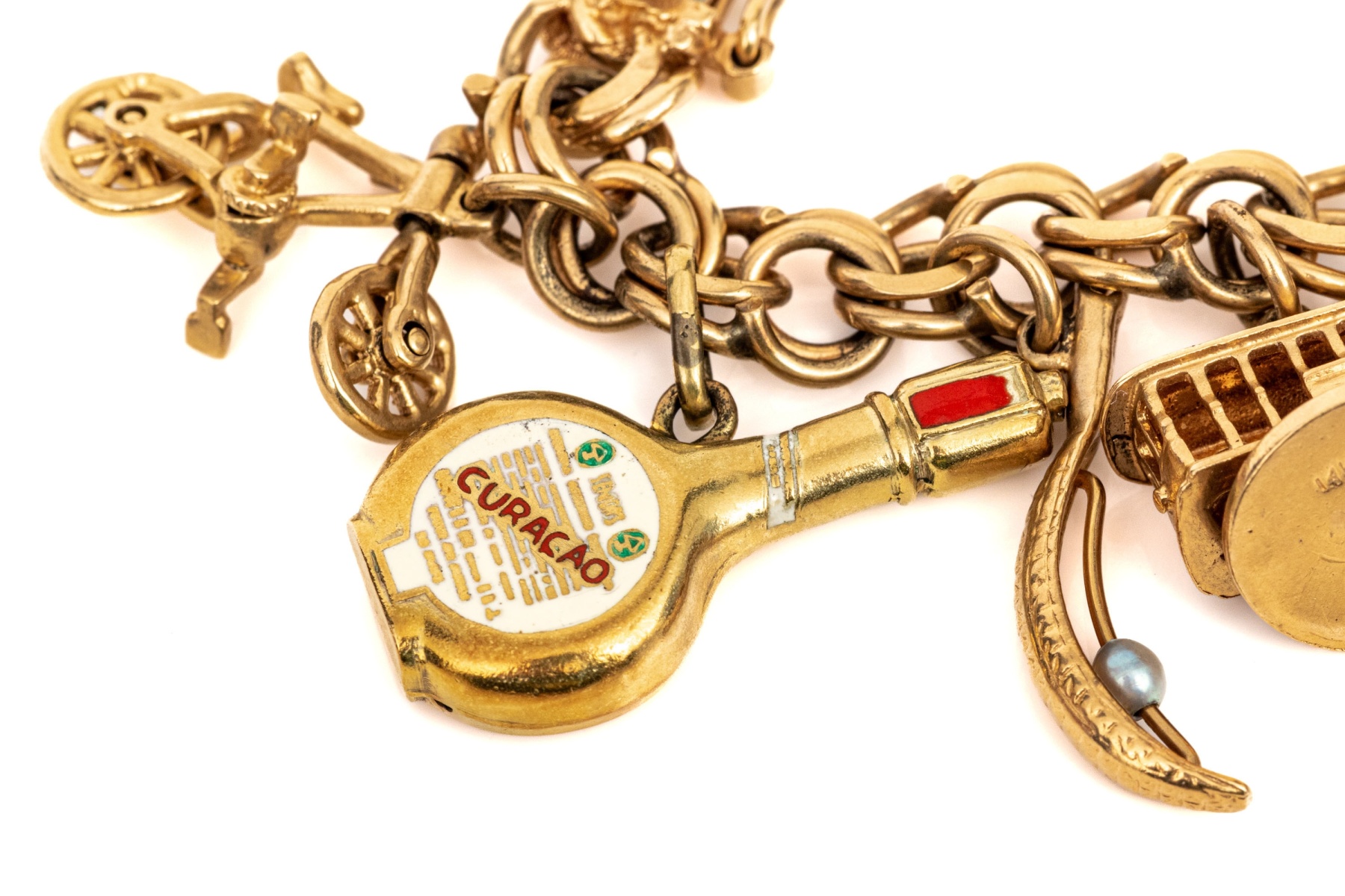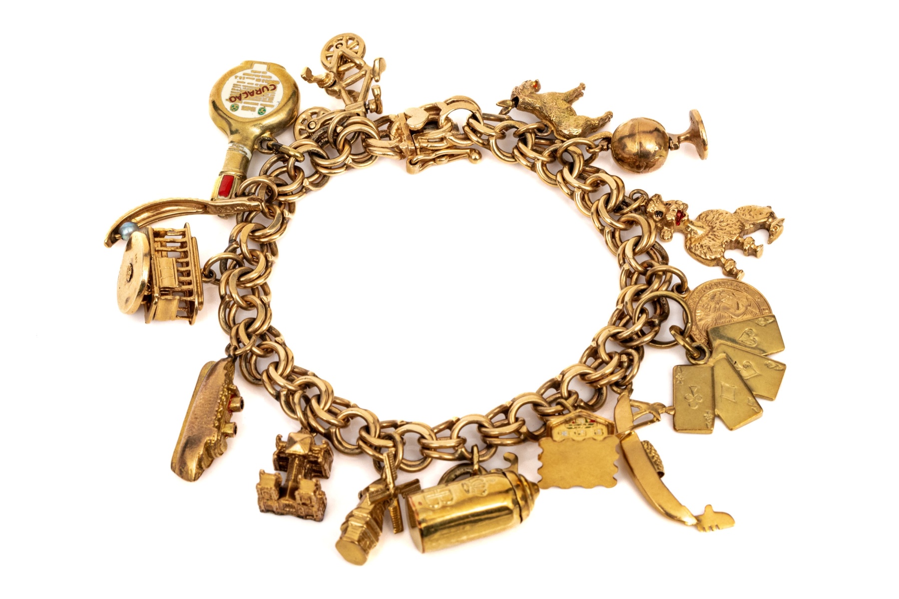 14k yellow gold fabulous vintage travel motif charm bracelet, with 14k, 10k and 9k assorted charms, finished with a hidden box style clasp and a figure eight safety