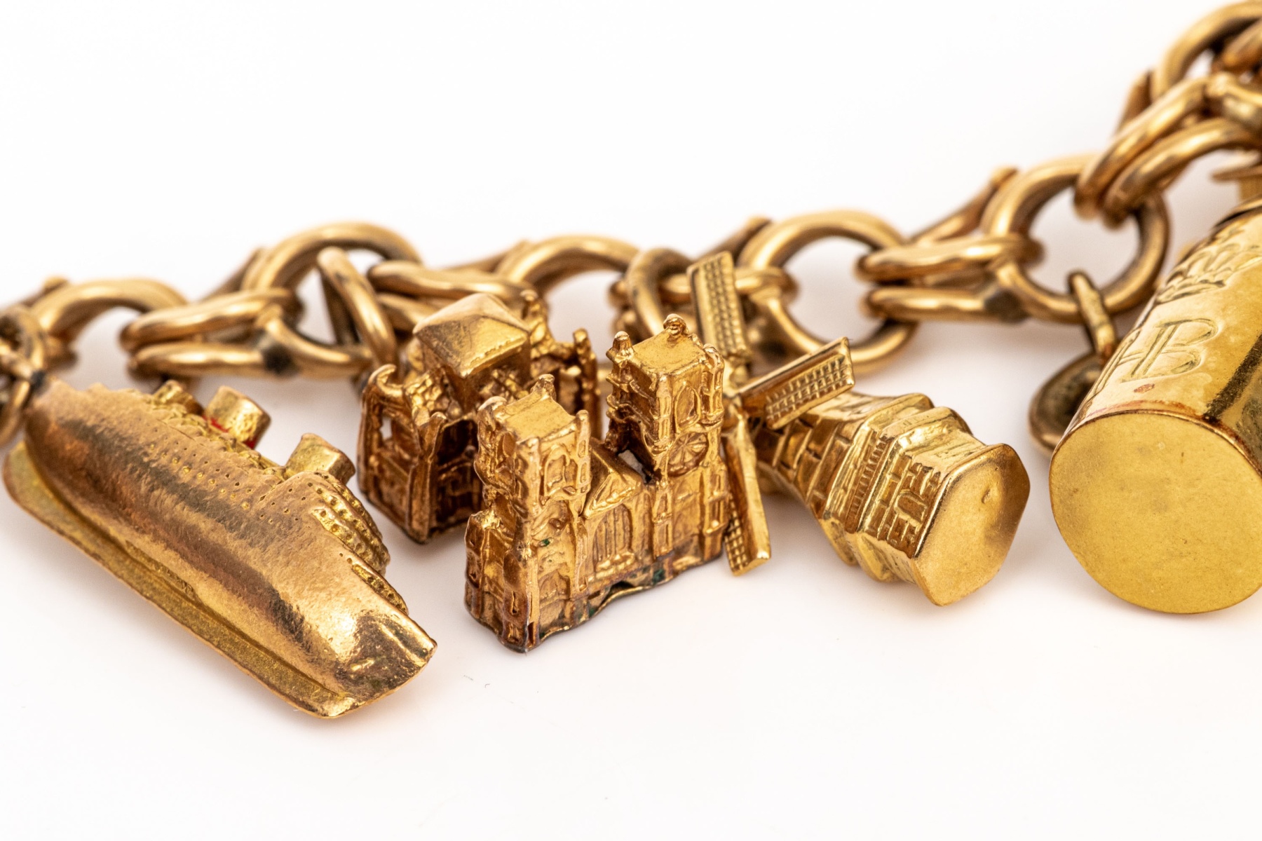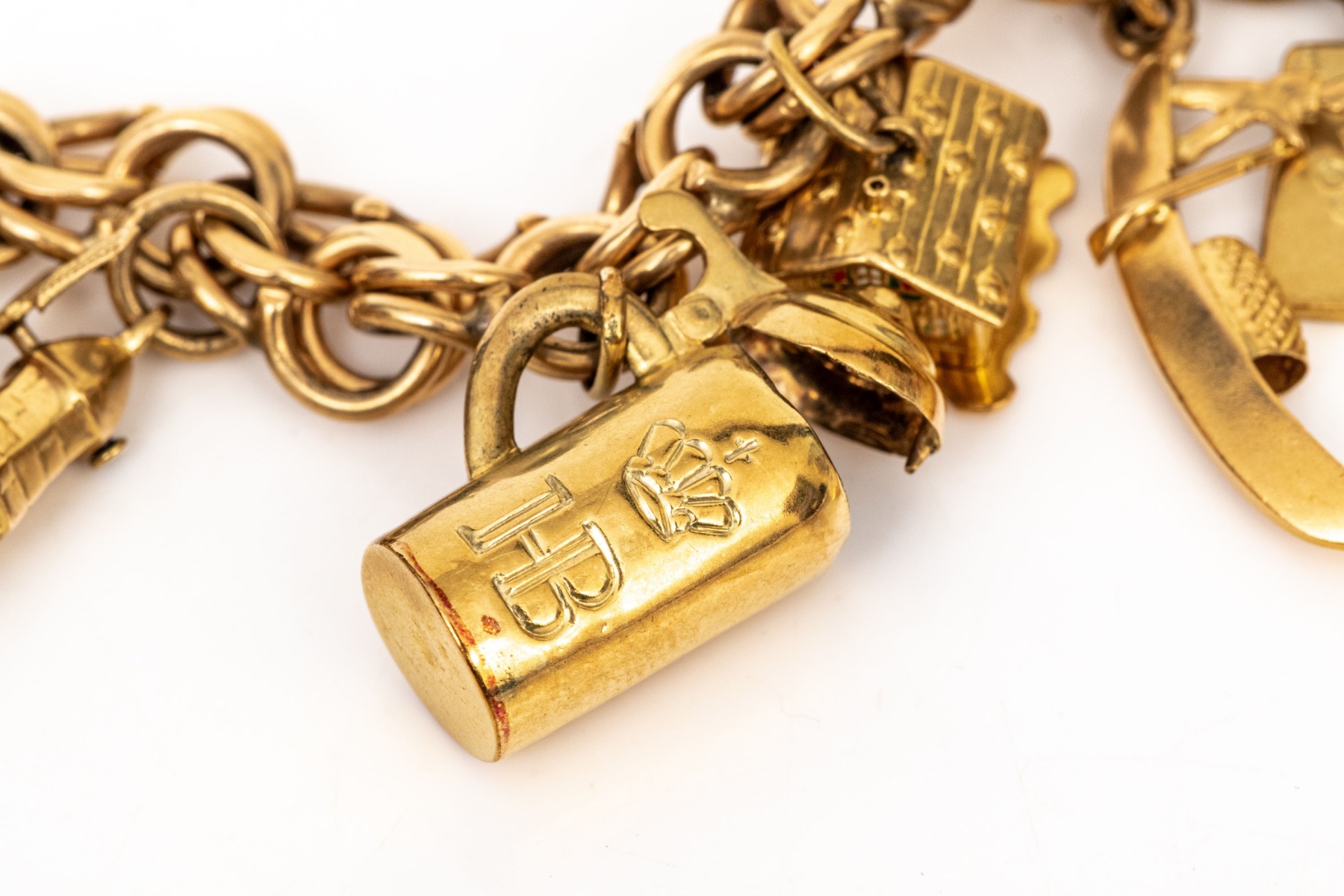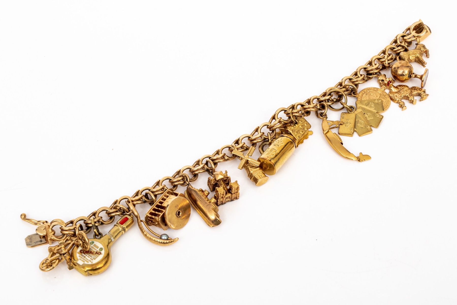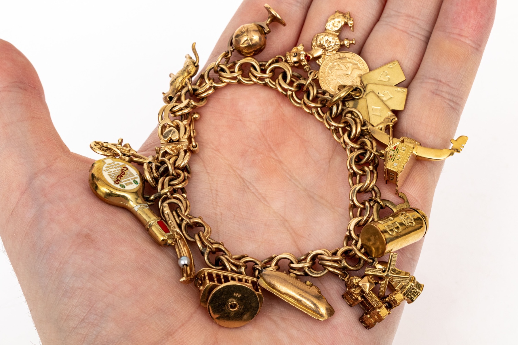 14k yellow gold fabulous vintage travel motif charm bracelet, with 14k, 10k and 9k assorted charms, finished with a hidden box style clasp and a figure eight safety