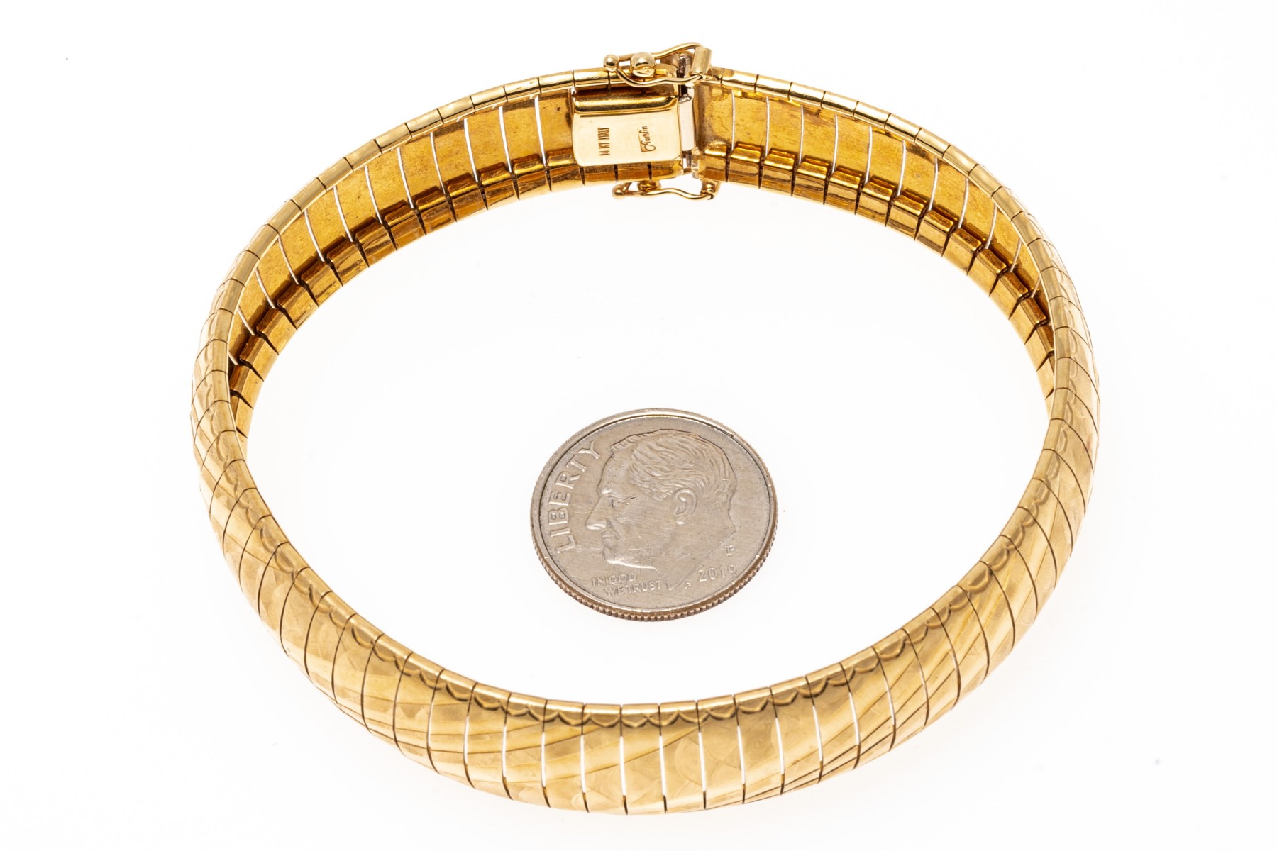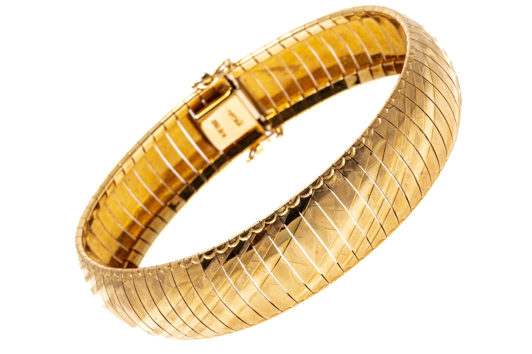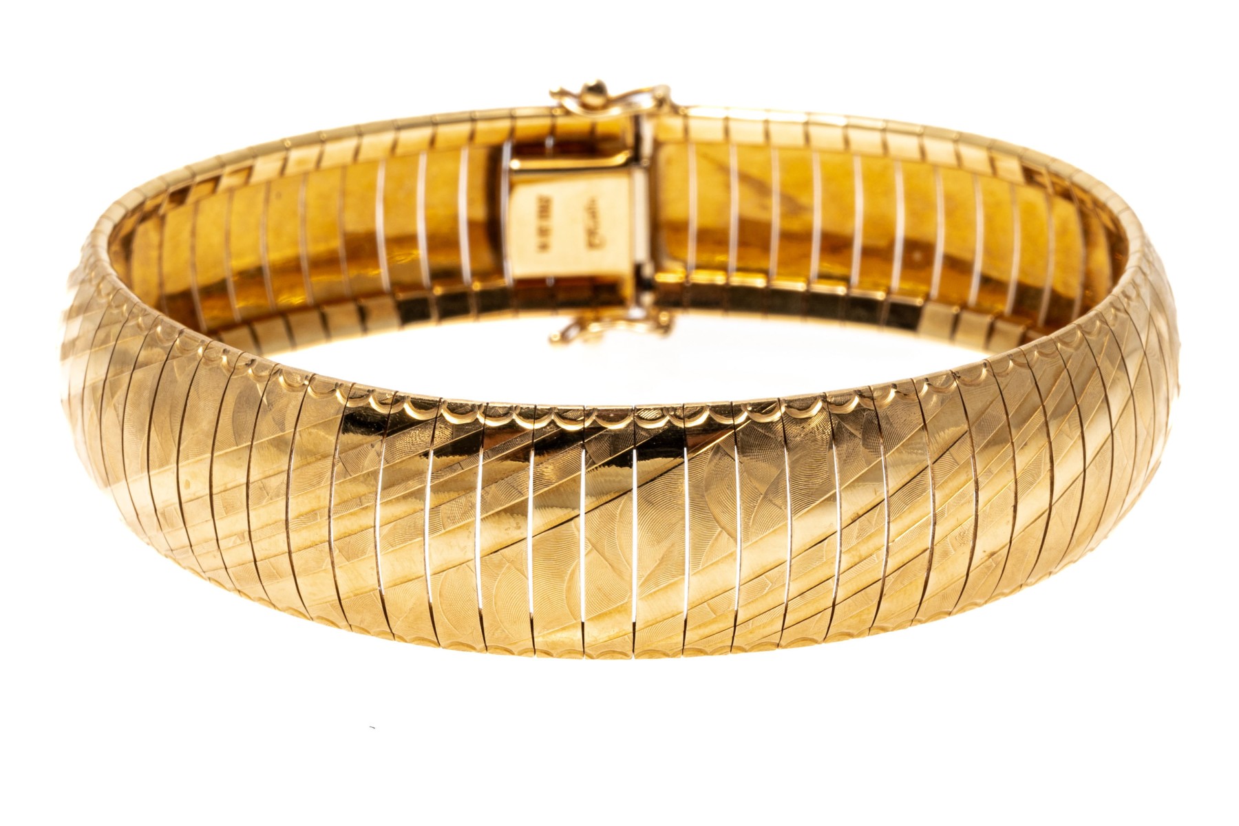 14k yellow gold fabulous wide brushed and polished domed omega style bracelet. The bracelet is finished with a hidden box clasp with two figure eight safety clasps