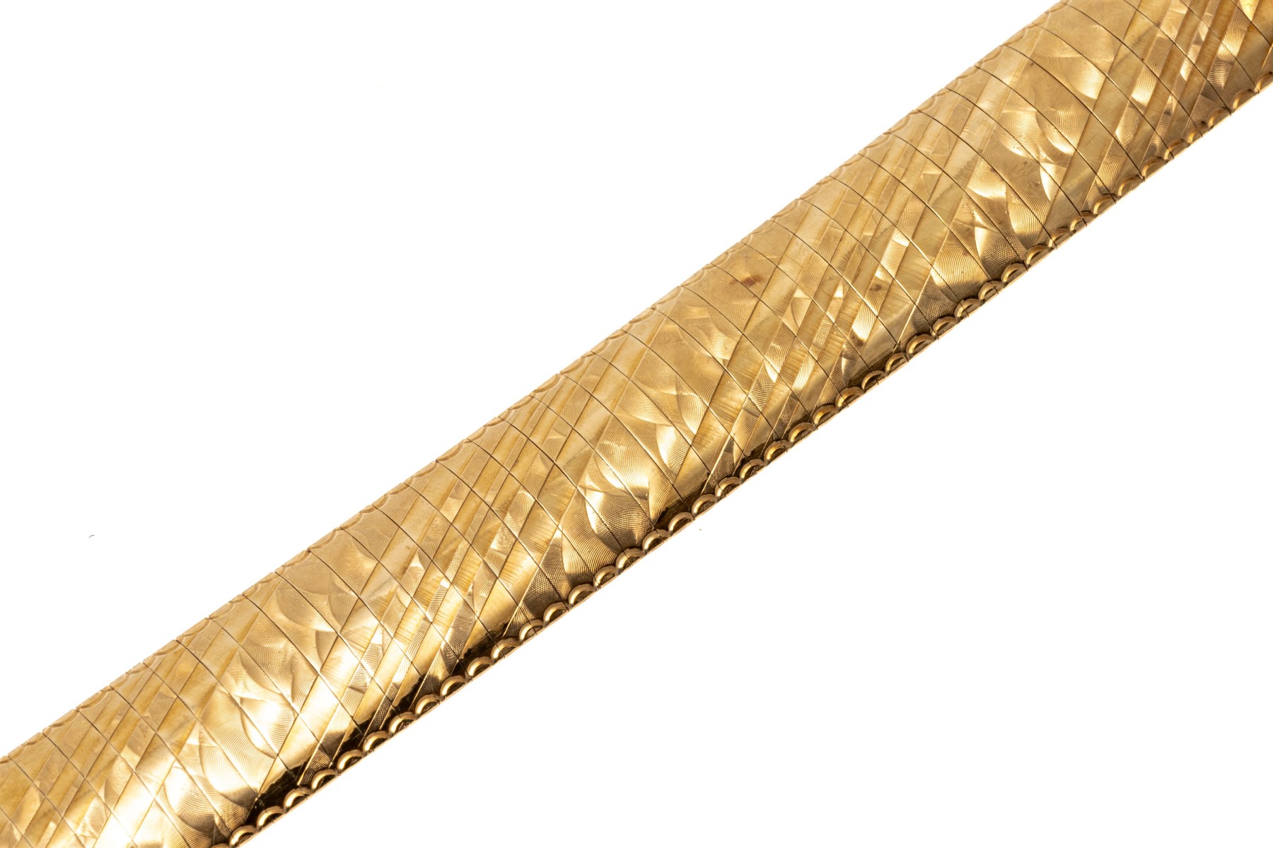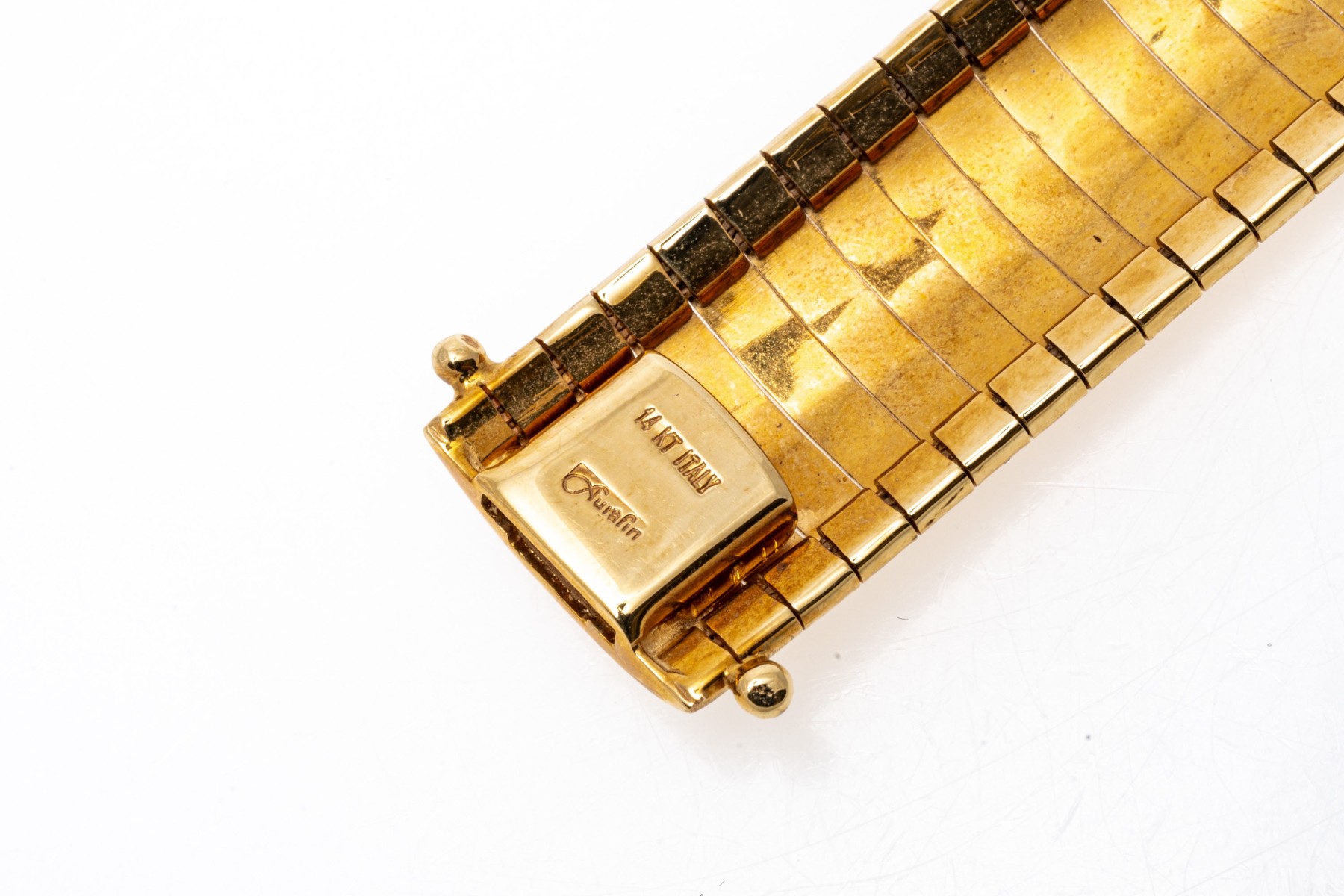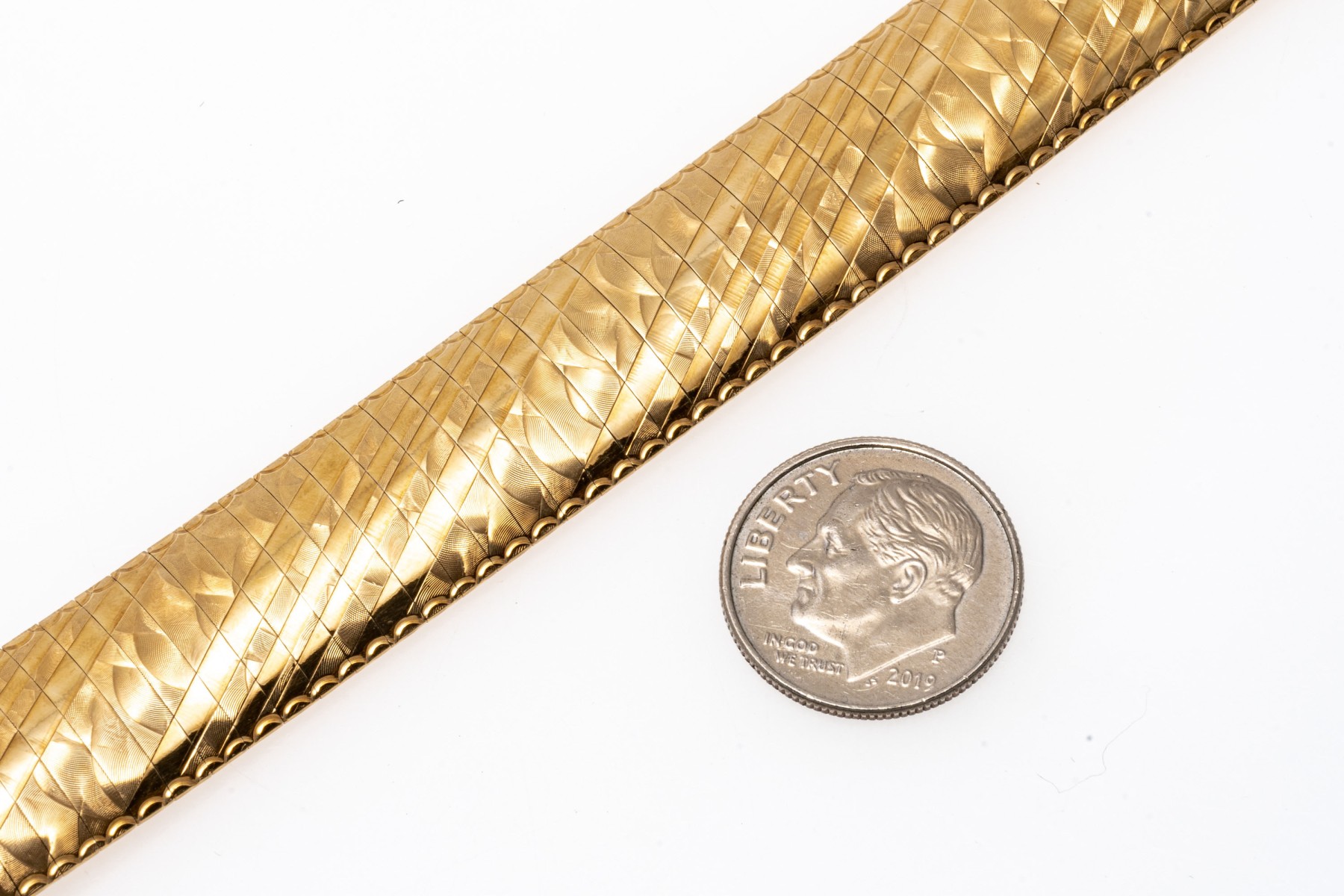 14k yellow gold fabulous wide brushed and polished domed omega style bracelet. The bracelet is finished with a hidden box clasp with two figure eight safety clasps