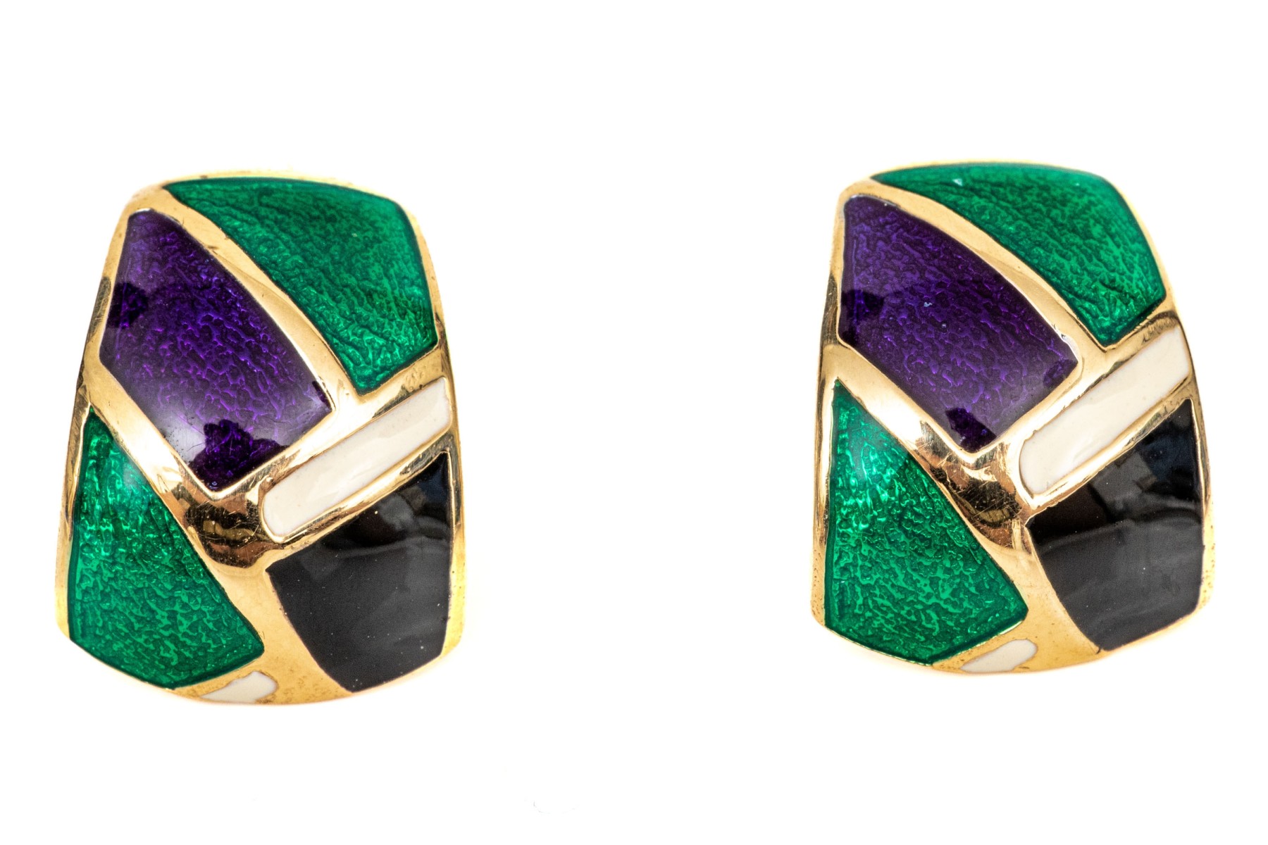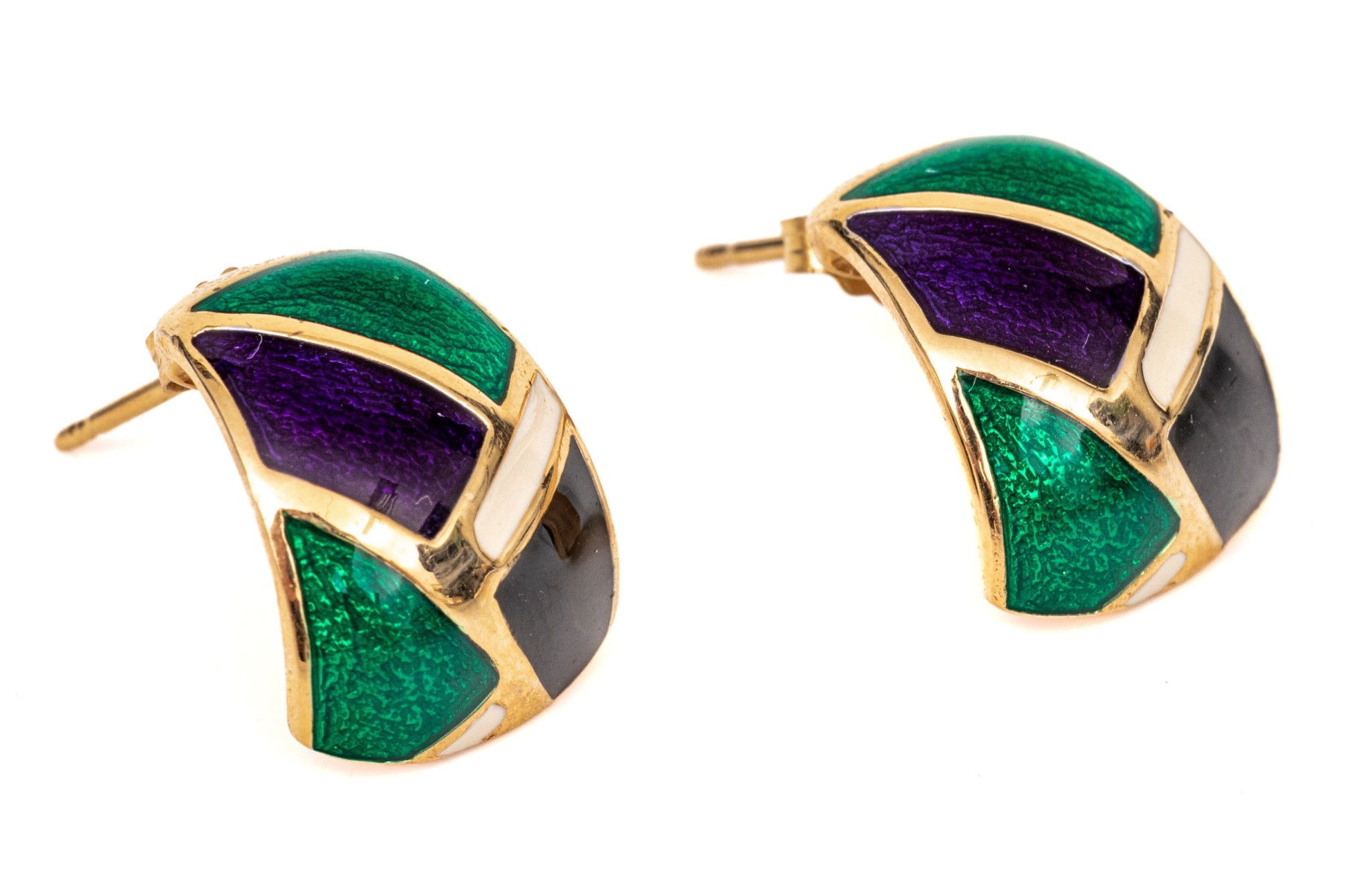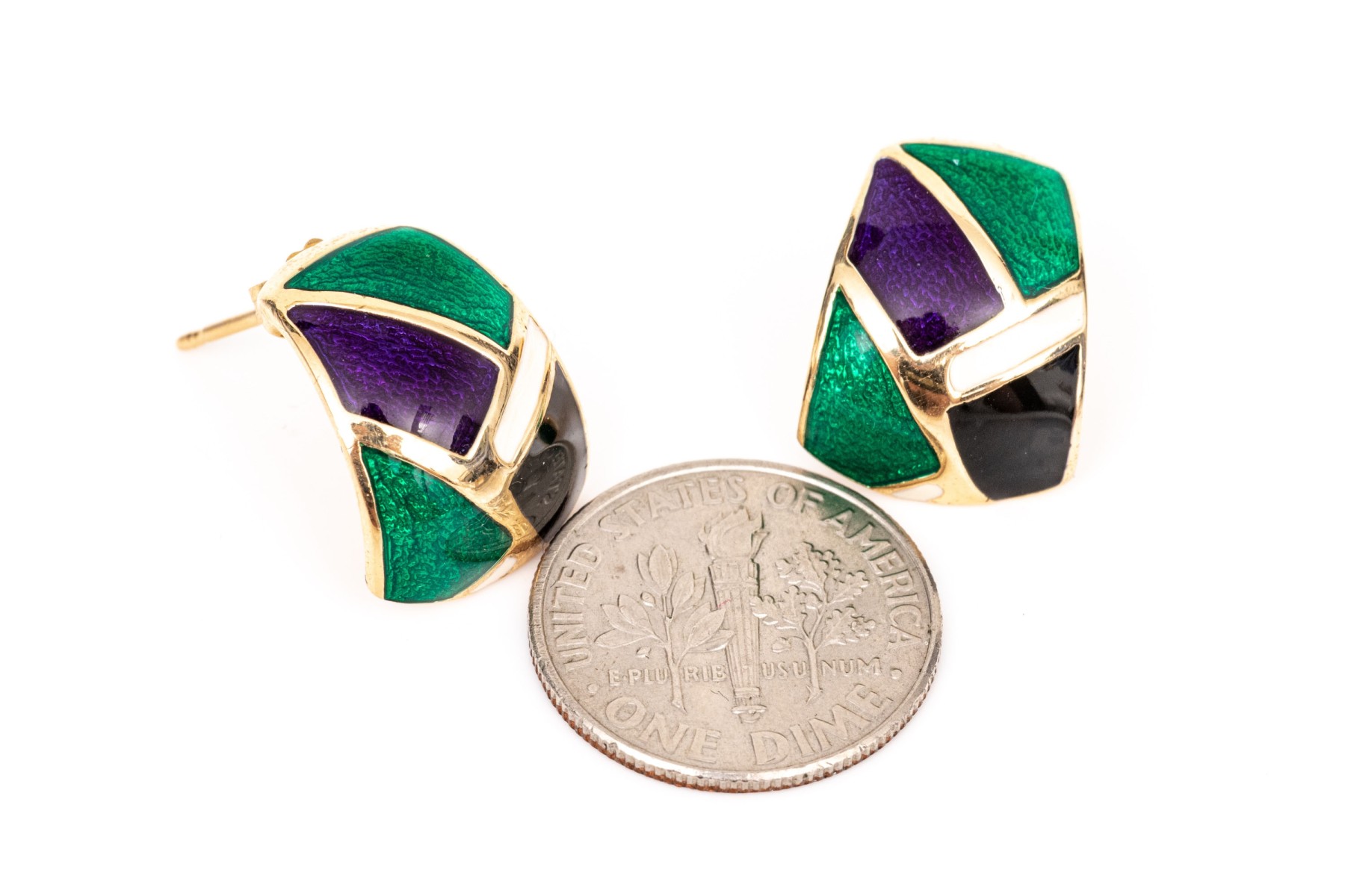 14k yellow gold fun blue and green enamel tapered domed earrings, finished with posts and clutch style backs