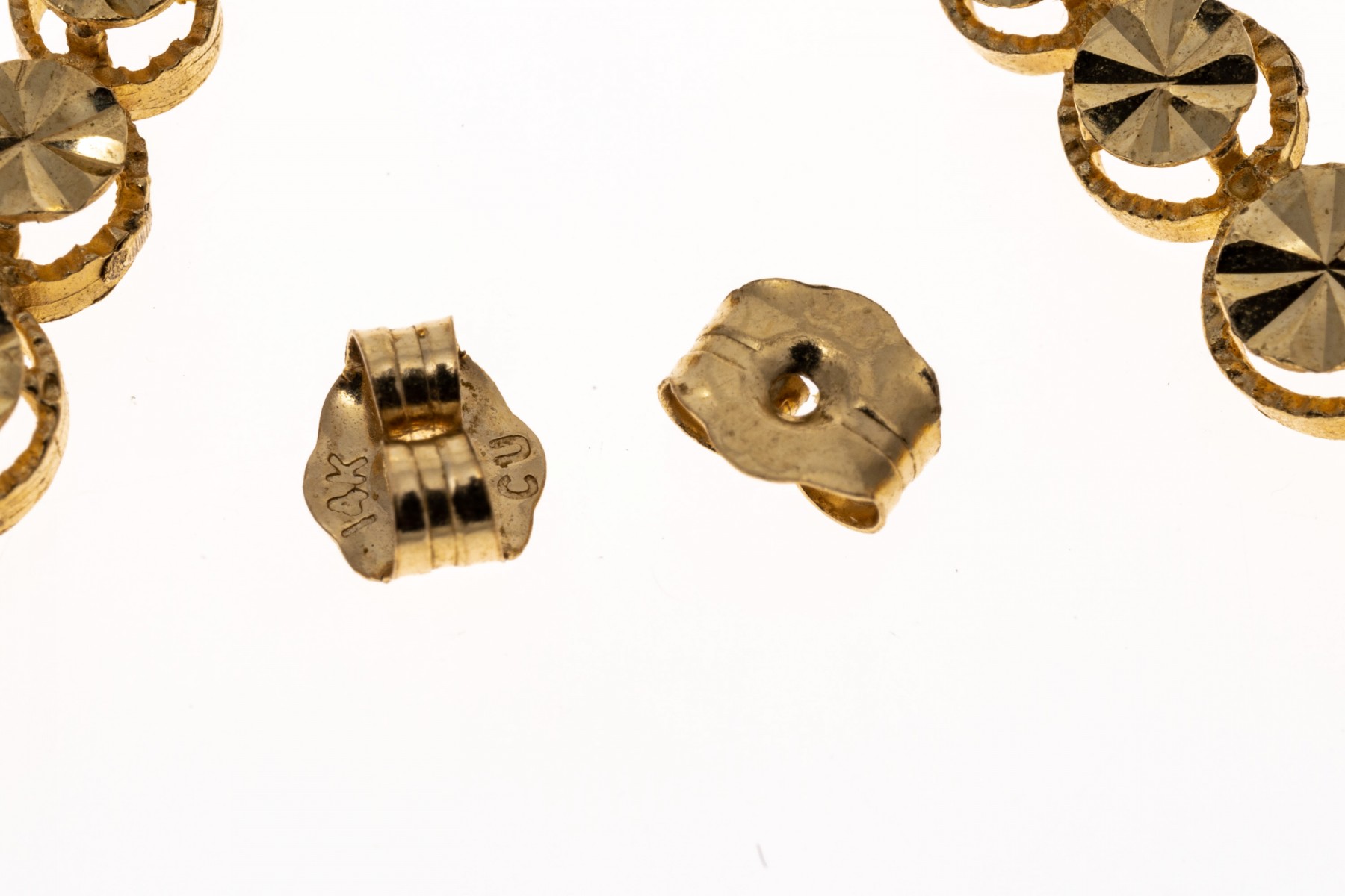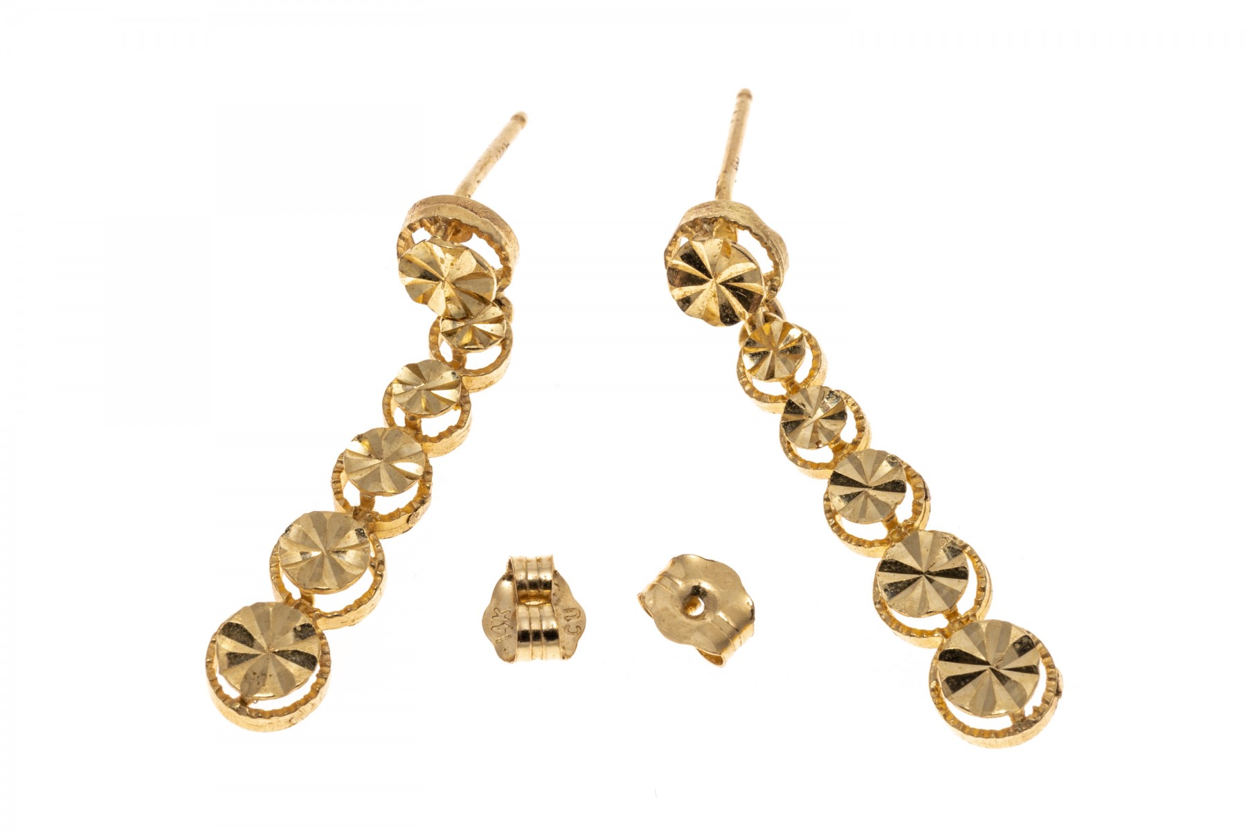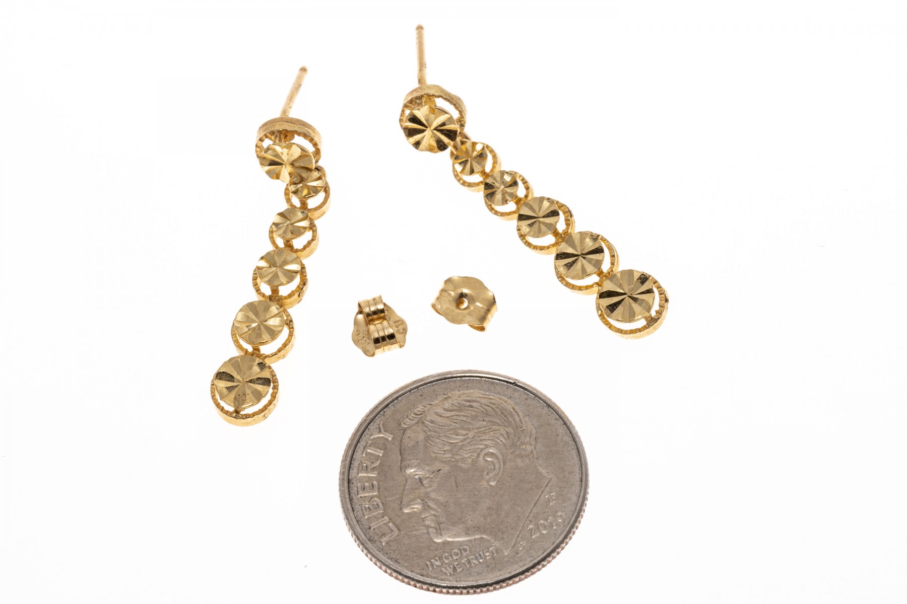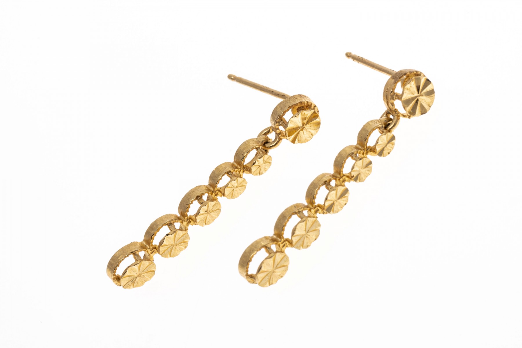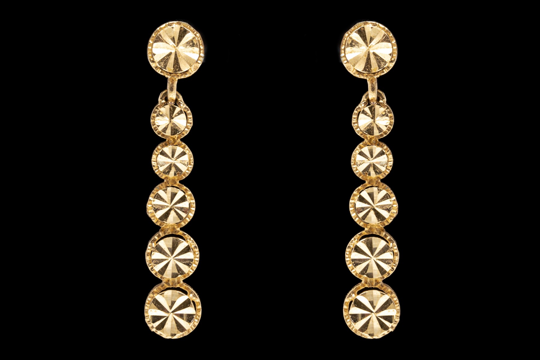 14k yellow gold earrings. These fun earrings are a pendant style, with a stack of round graduated diamond cut circles. The earrings have posts with clutch style backs.