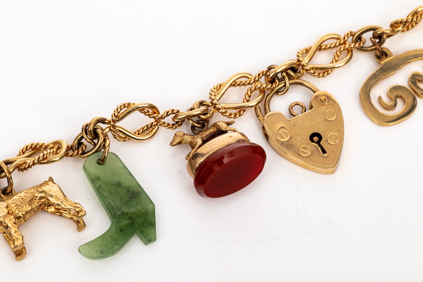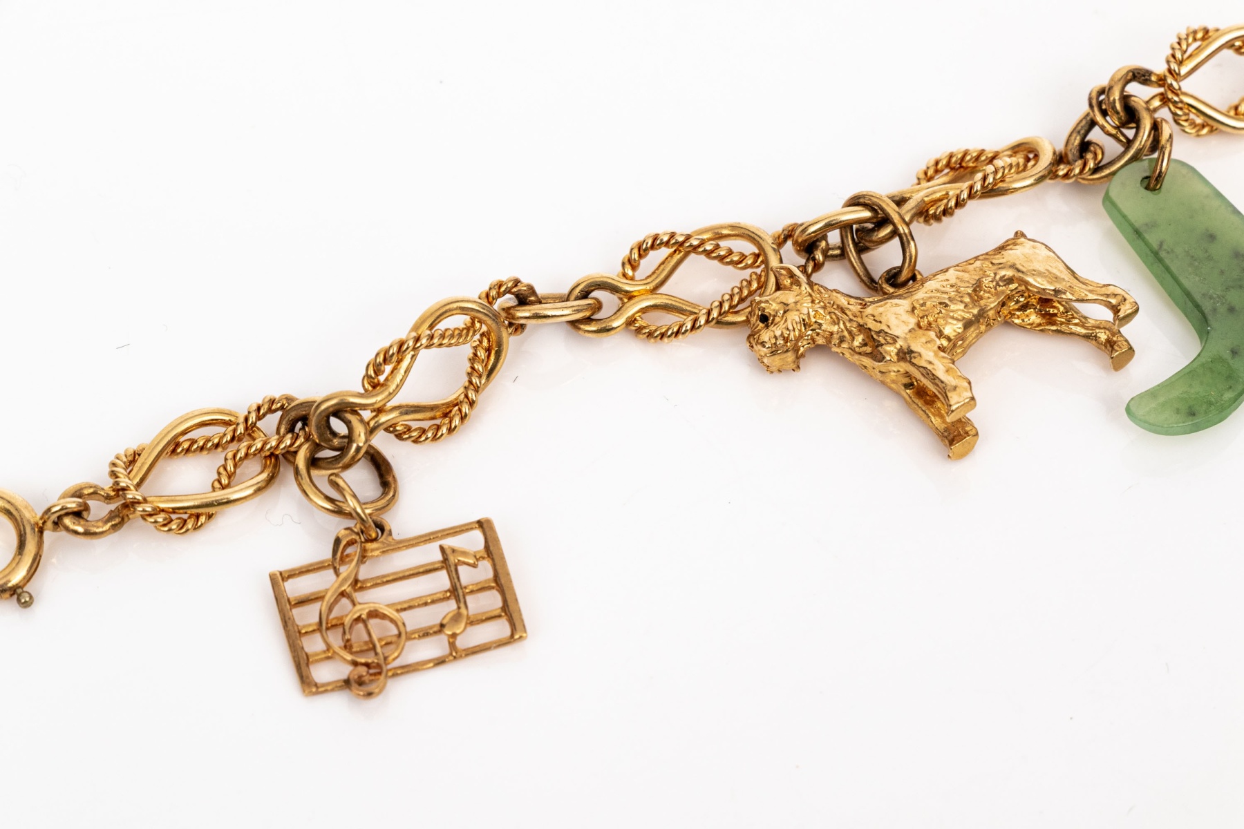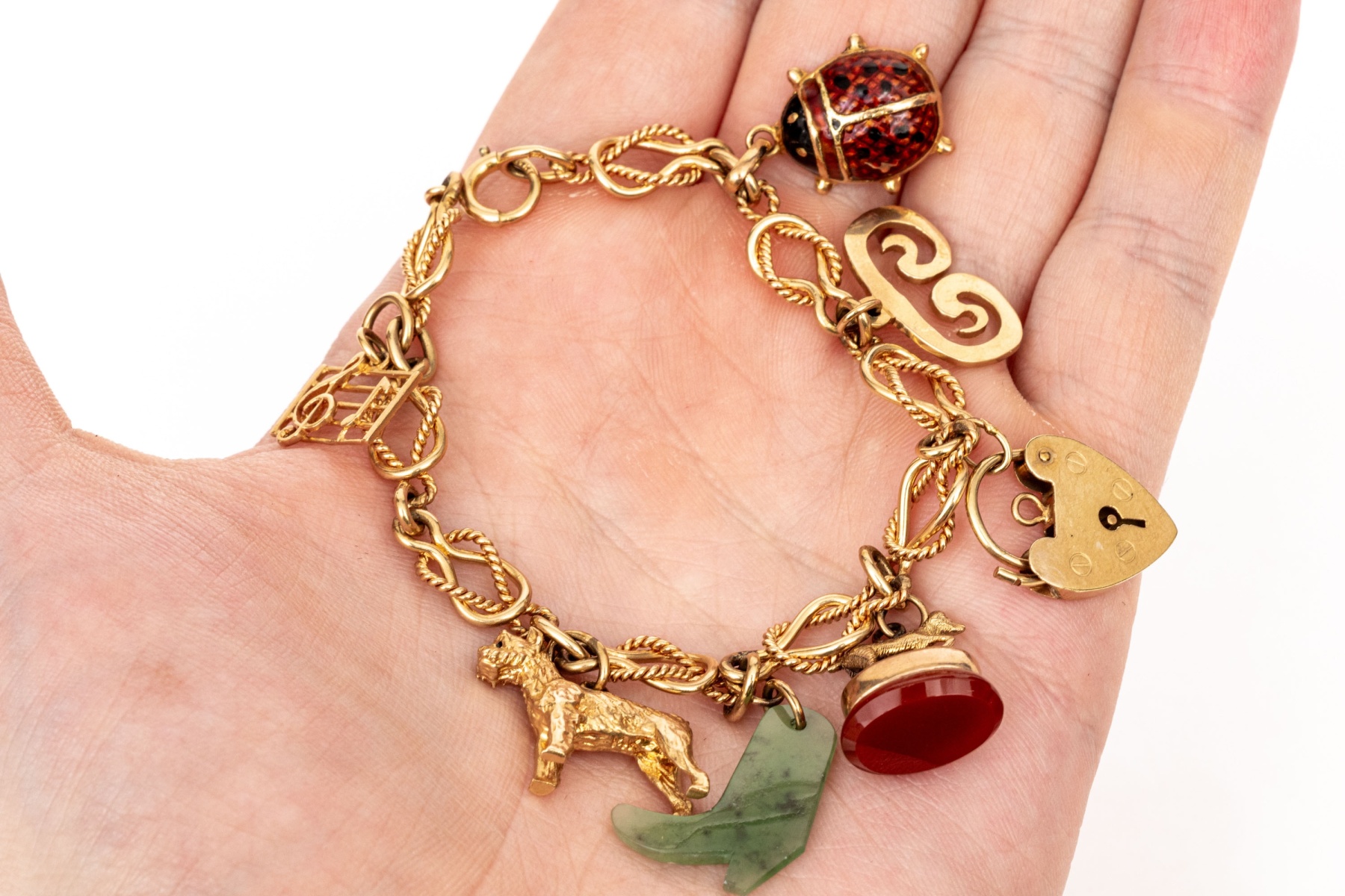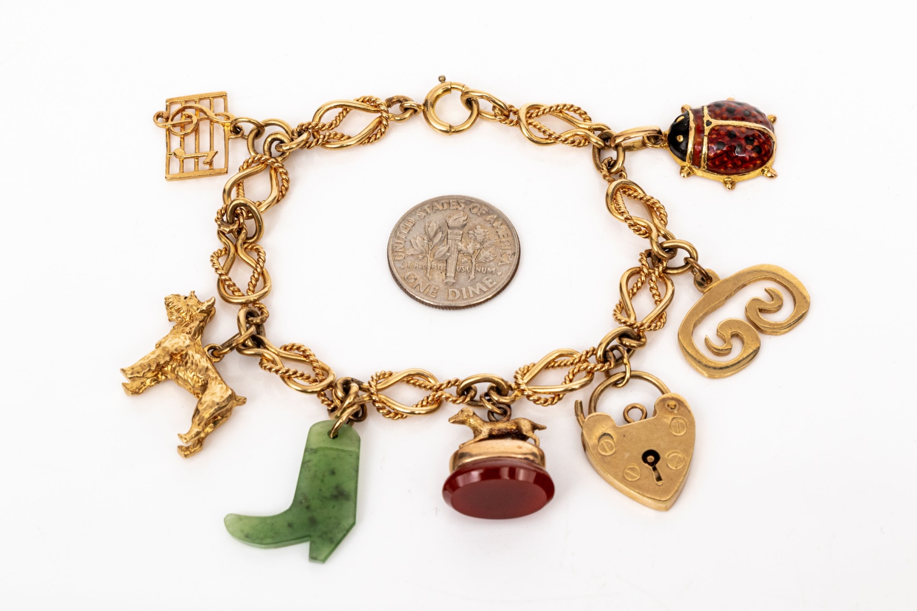 14k yellow gold fun rope motif vintage charm bracelet, with 14k and 9k assorted charms, finished with a spring ring style clasp
