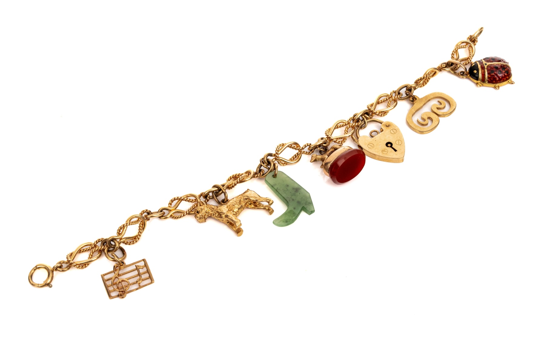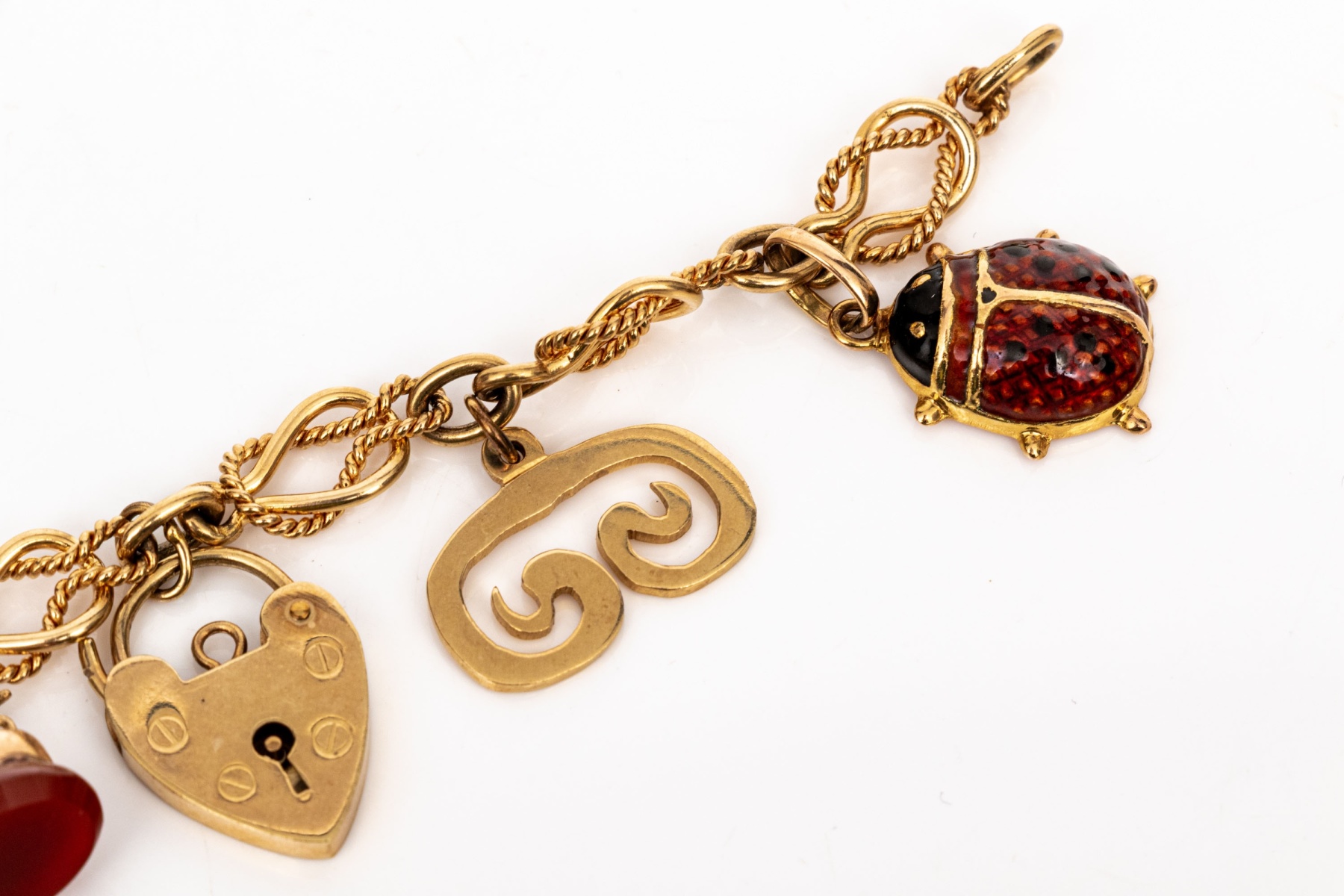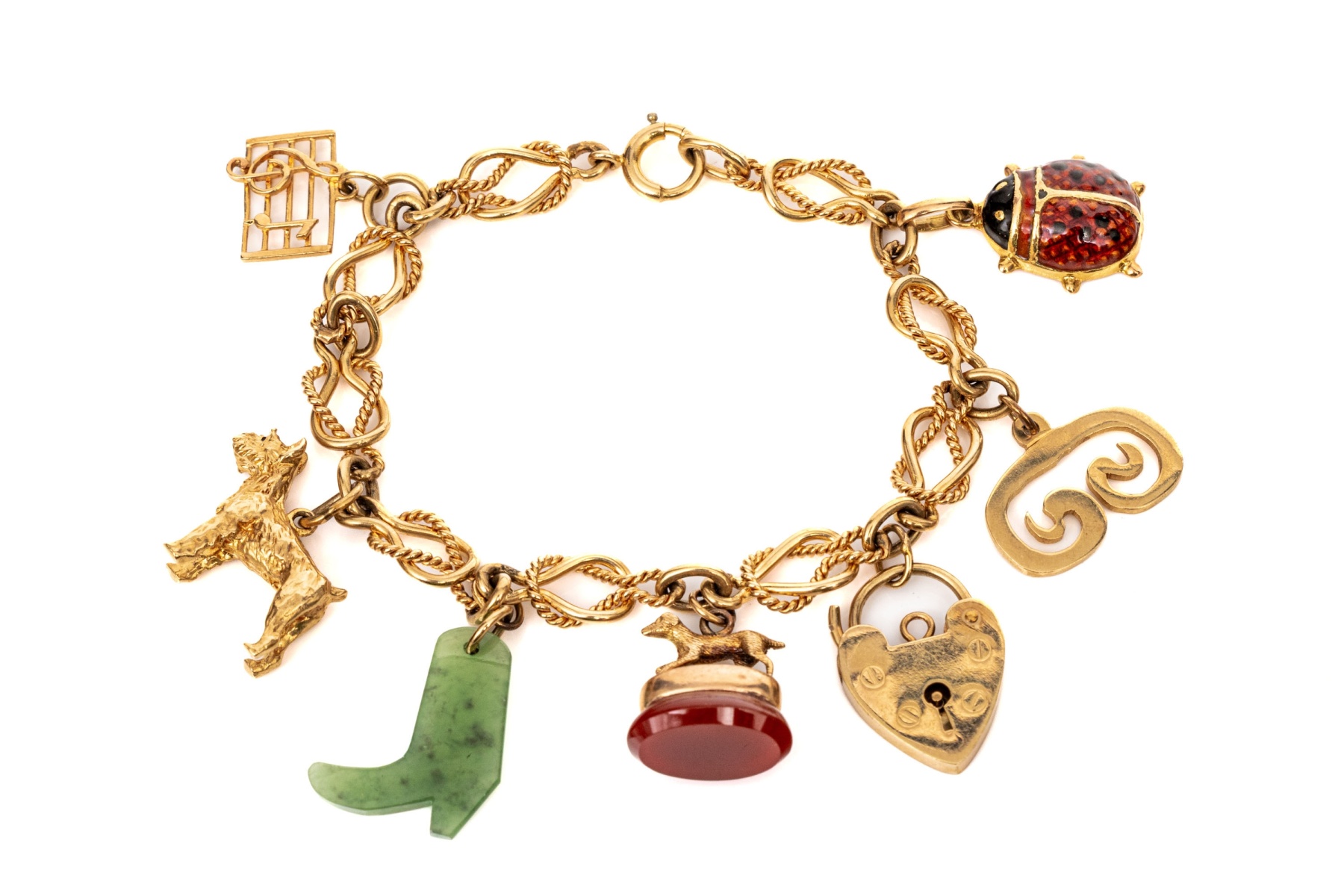 14k yellow gold fun rope motif vintage charm bracelet, with 14k and 9k assorted charms, finished with a spring ring style clasp