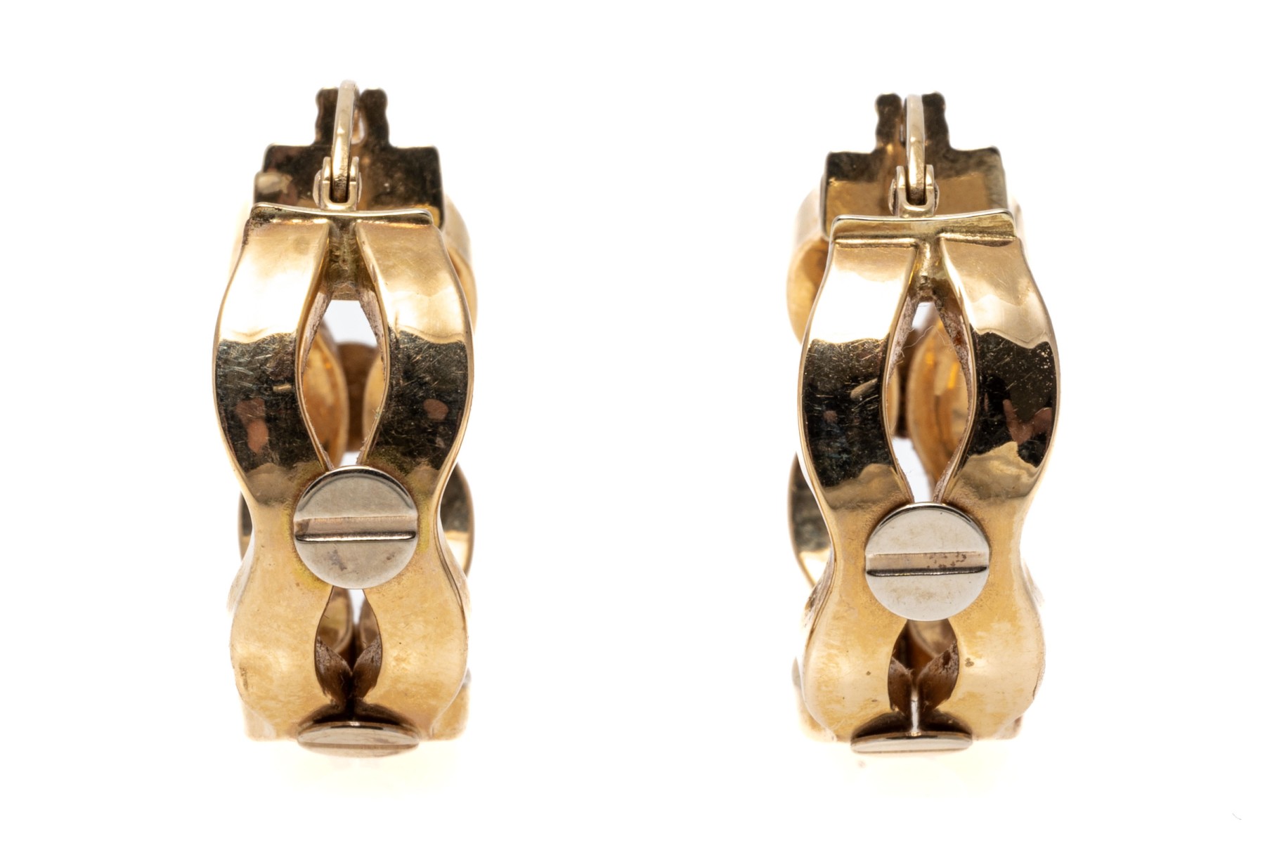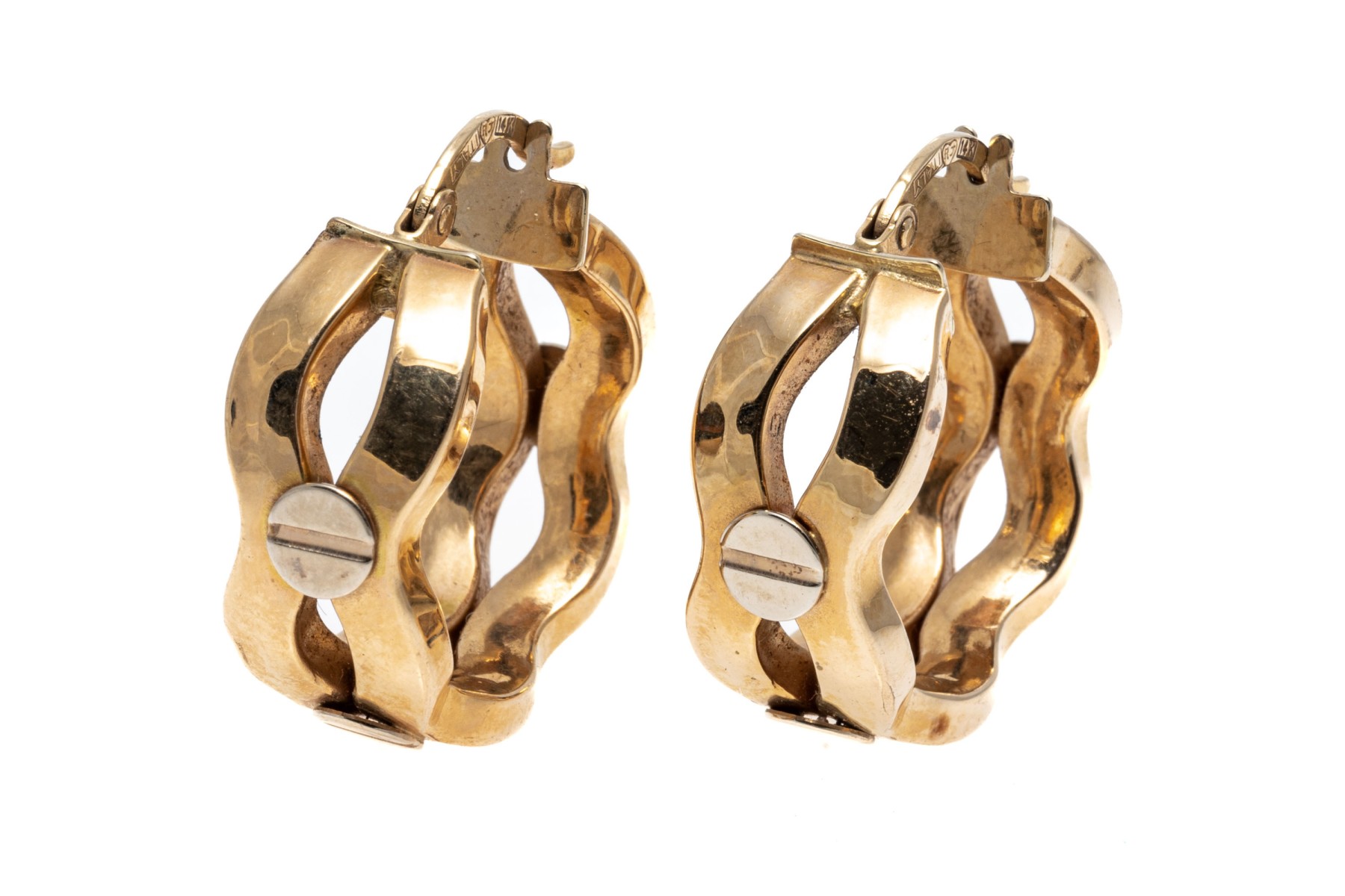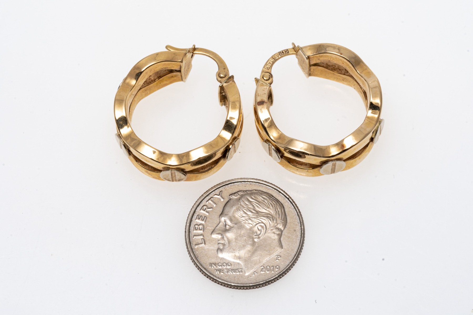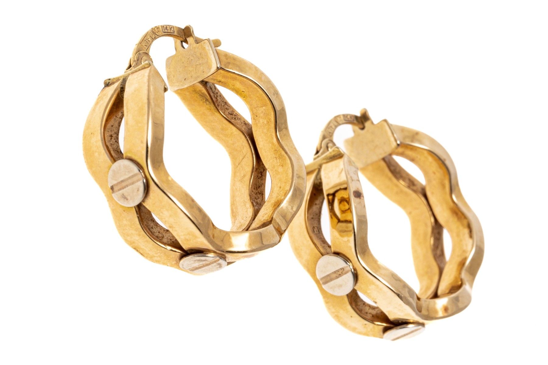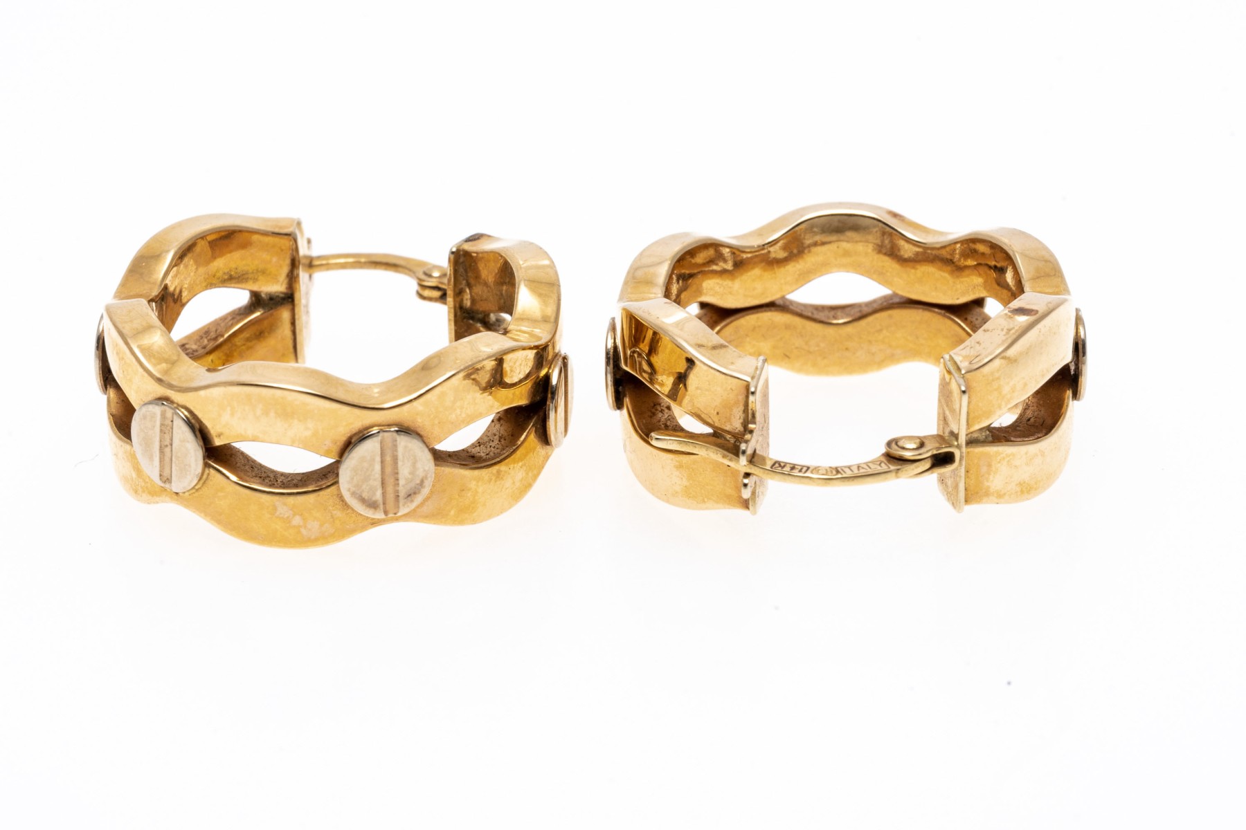 14k yellow gold fun split wavy hoop earrings, decorated with white gold screw heads. The earrings are finished with lever style posts, with "u" style backs