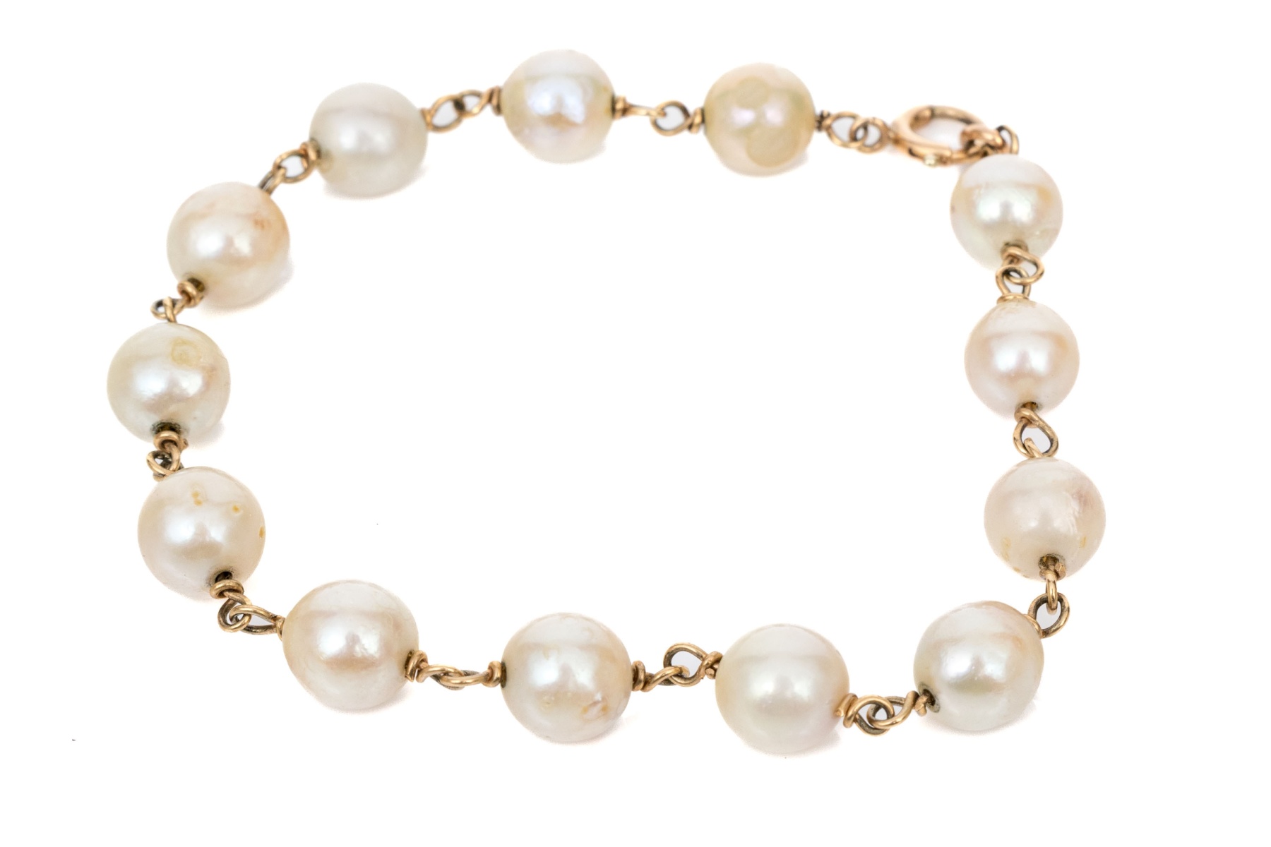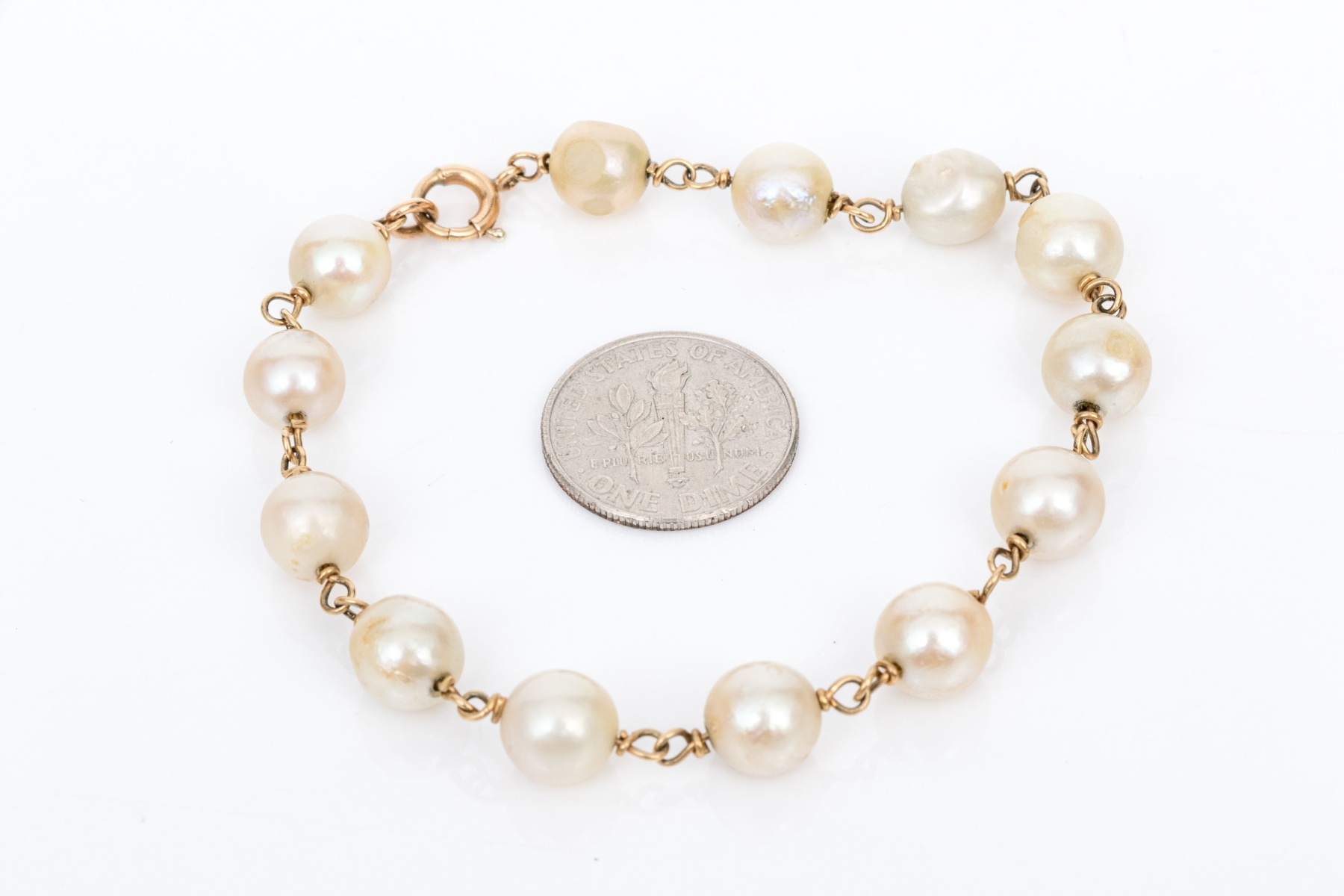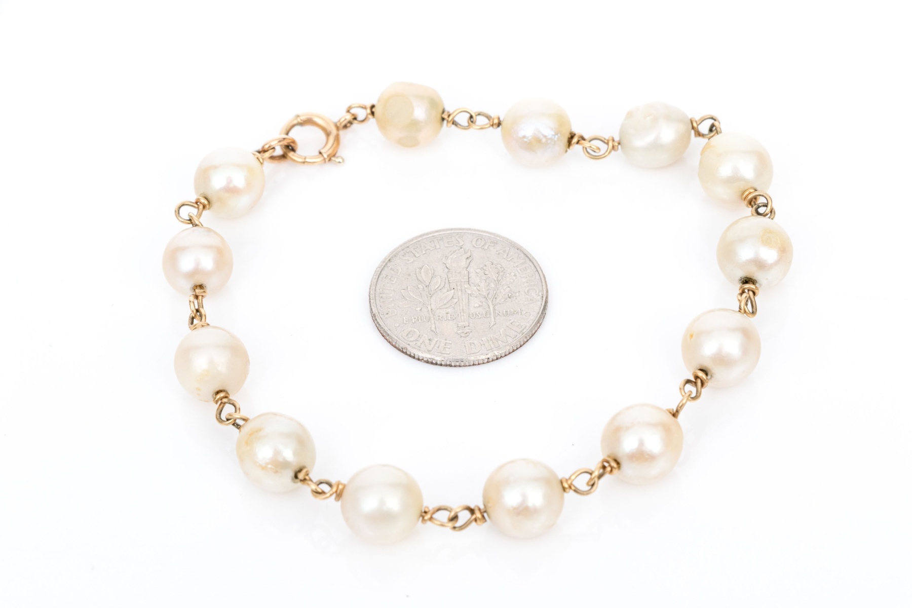 14k yellow gold handsome 7.25mm to 7.75 mm cultured baroque tin cup style bracelet, finished with a spring ring clasp