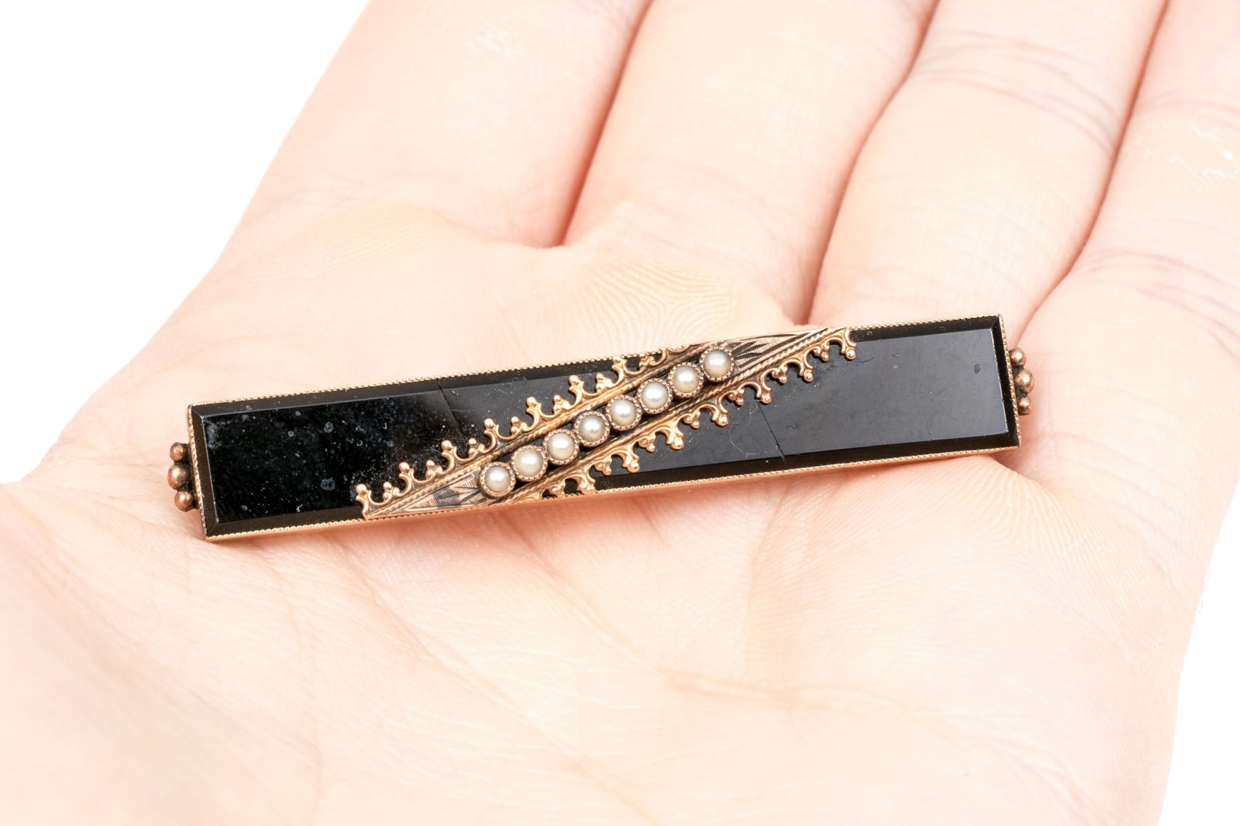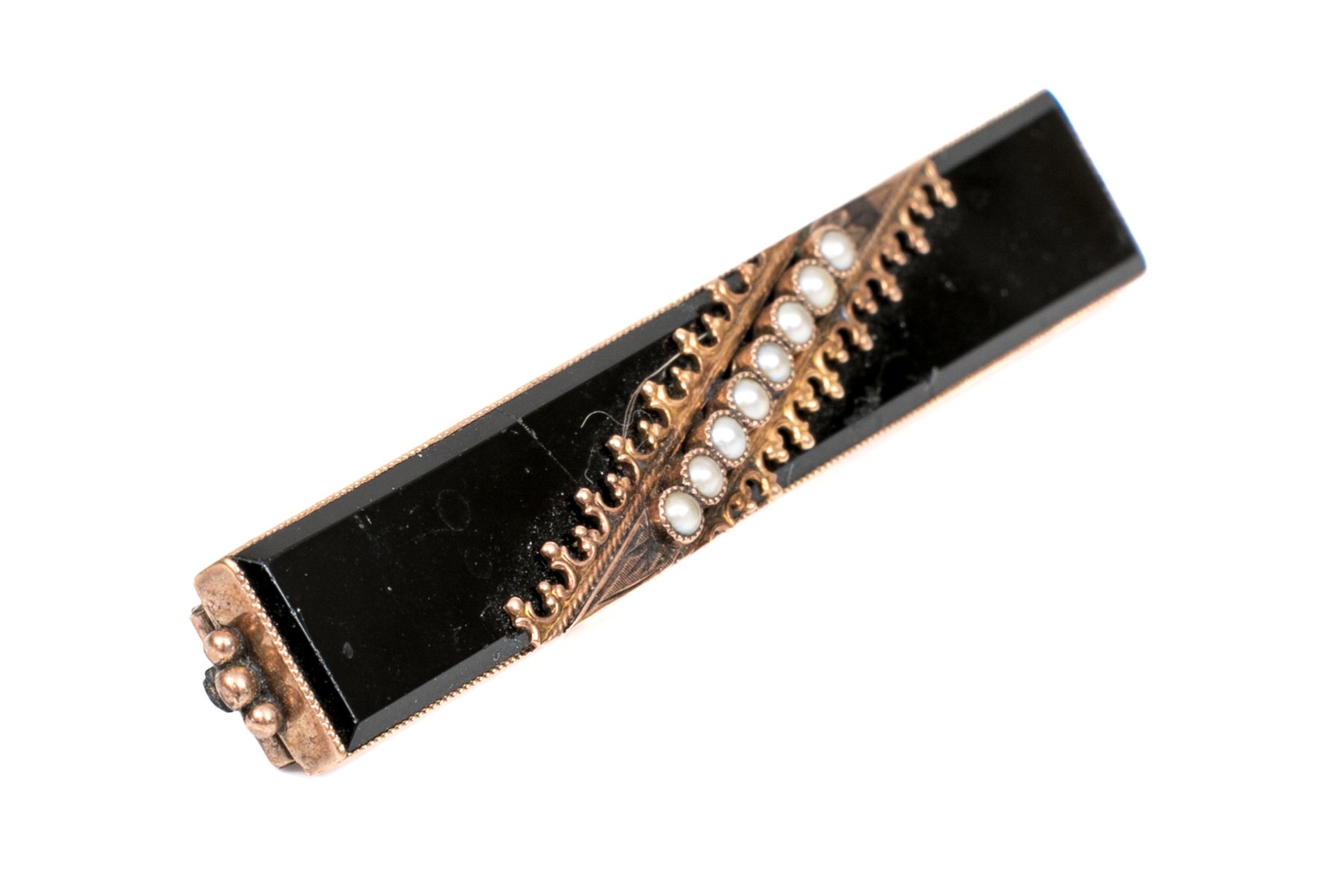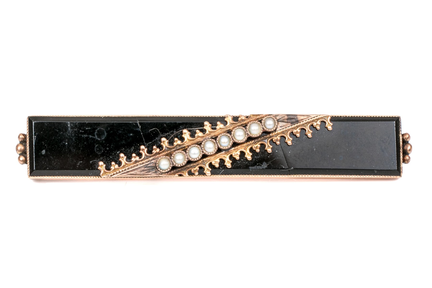 14k yellow gold handsome antique black enamel and seed pearl bar pin