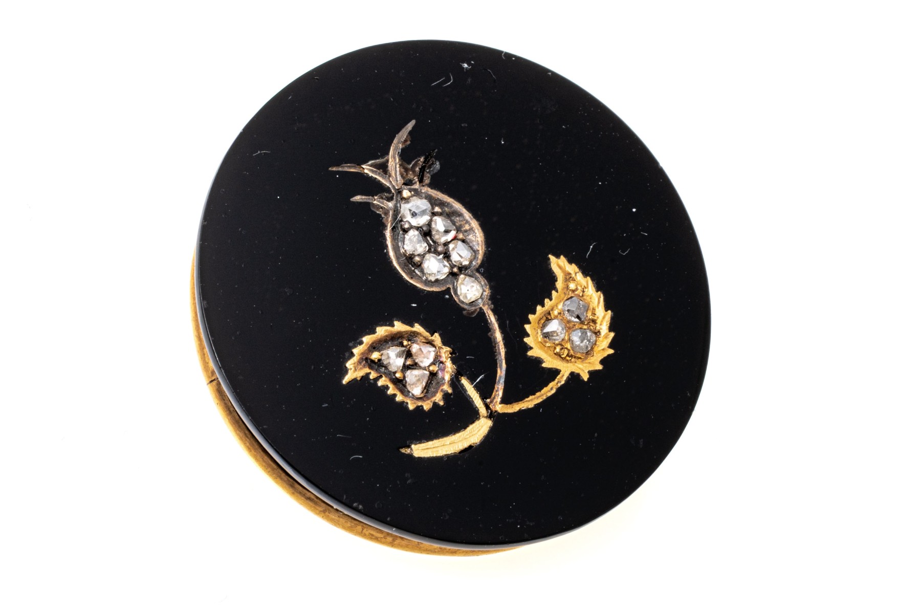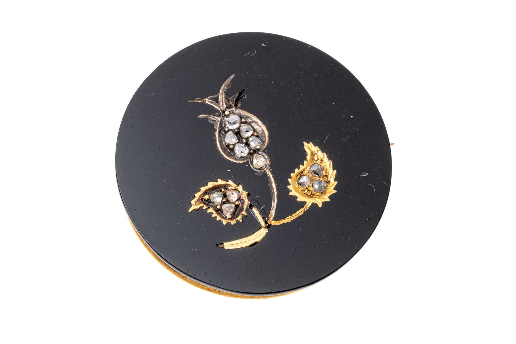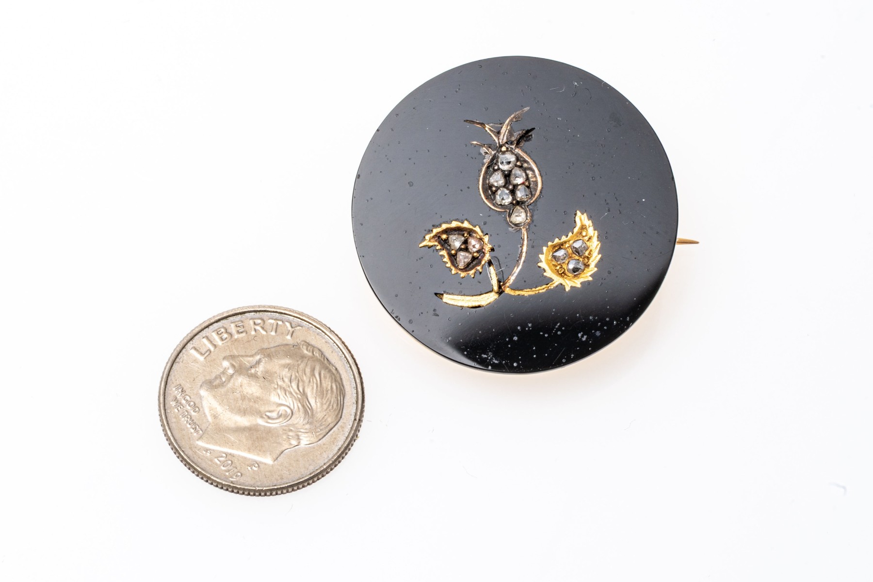 14k yellow gold handsome black onyx mourners brooch, with rose cut diamond foliate center
