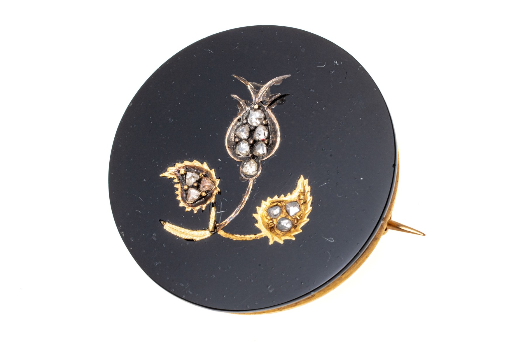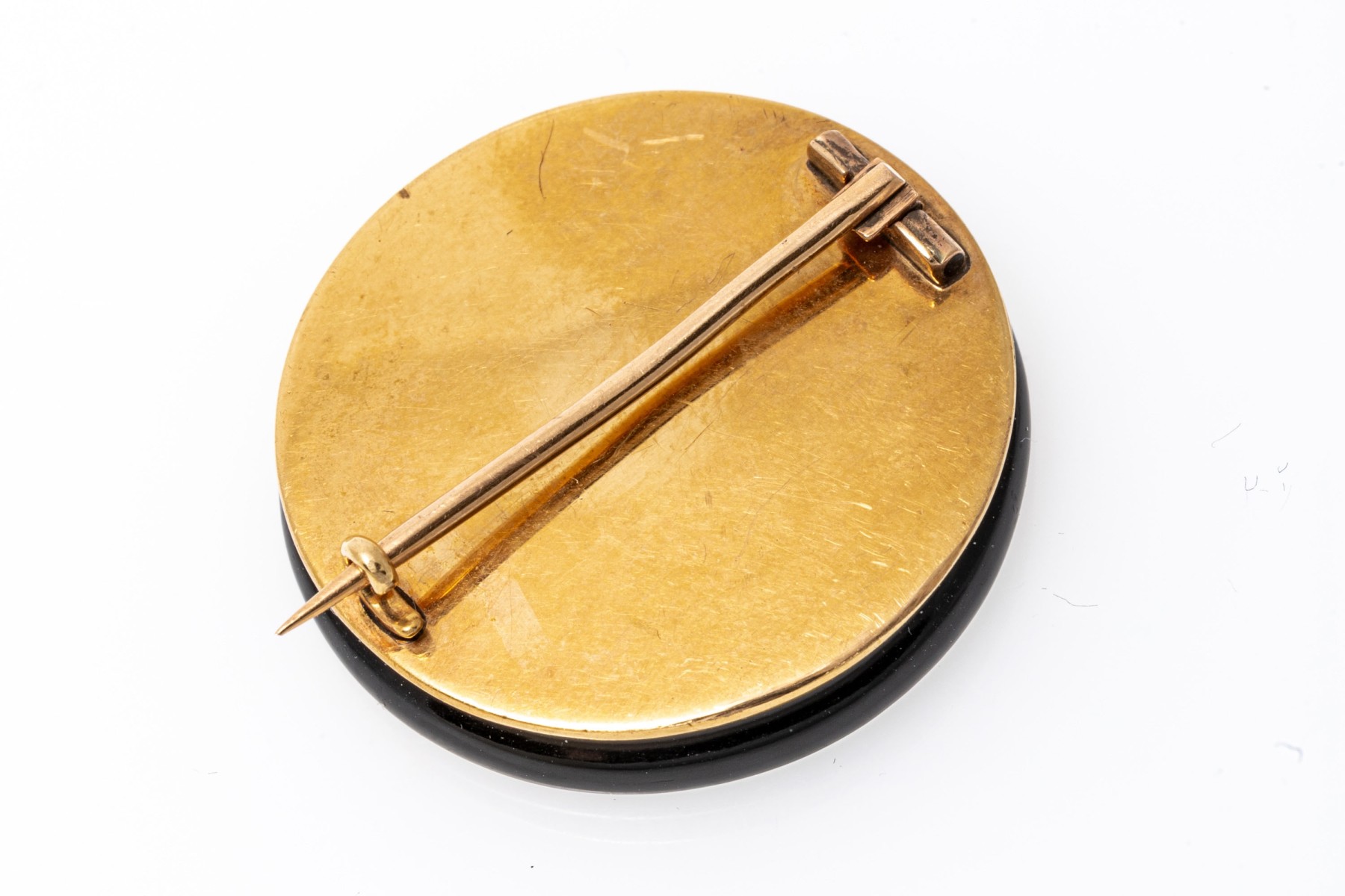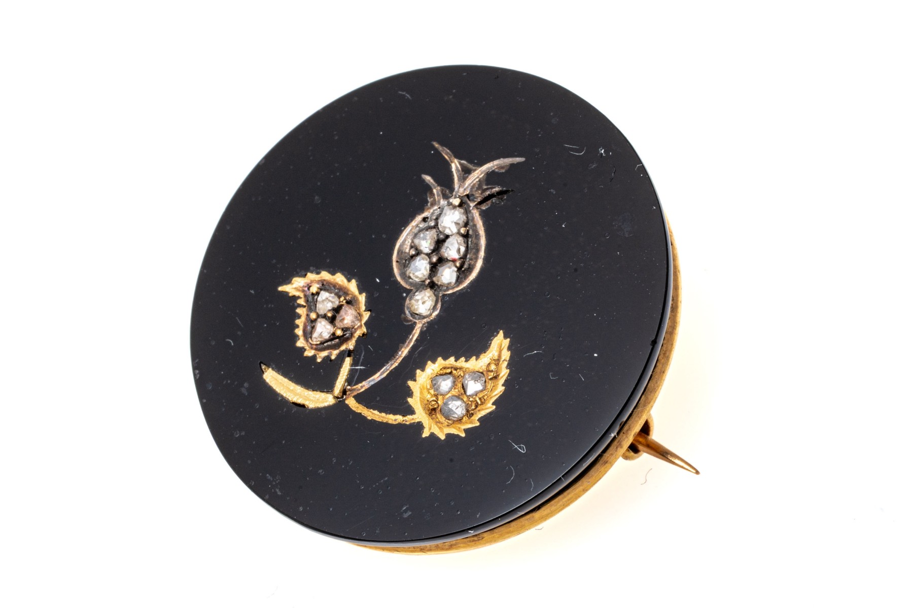 14k yellow gold handsome black onyx mourners brooch, with rose cut diamond foliate center