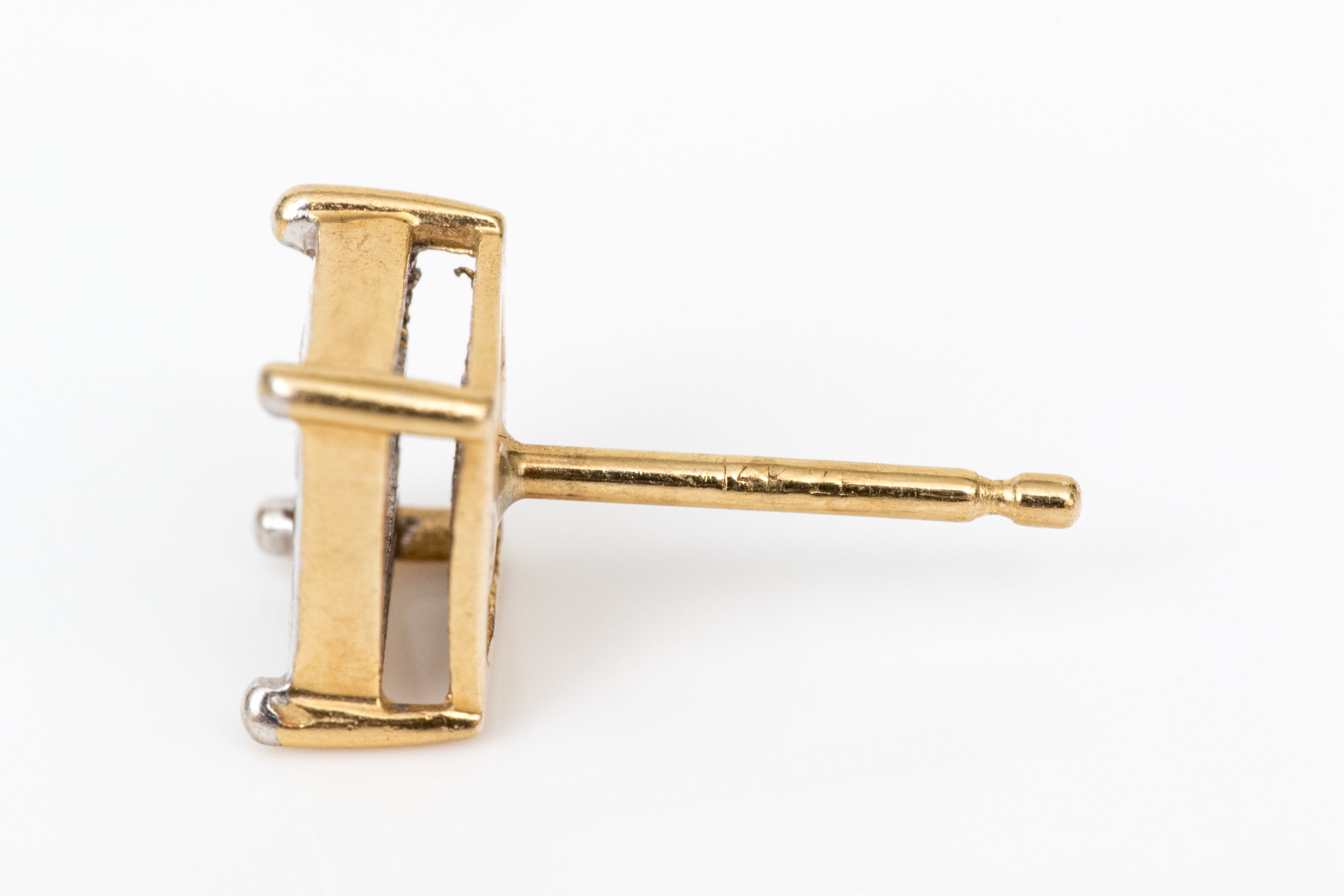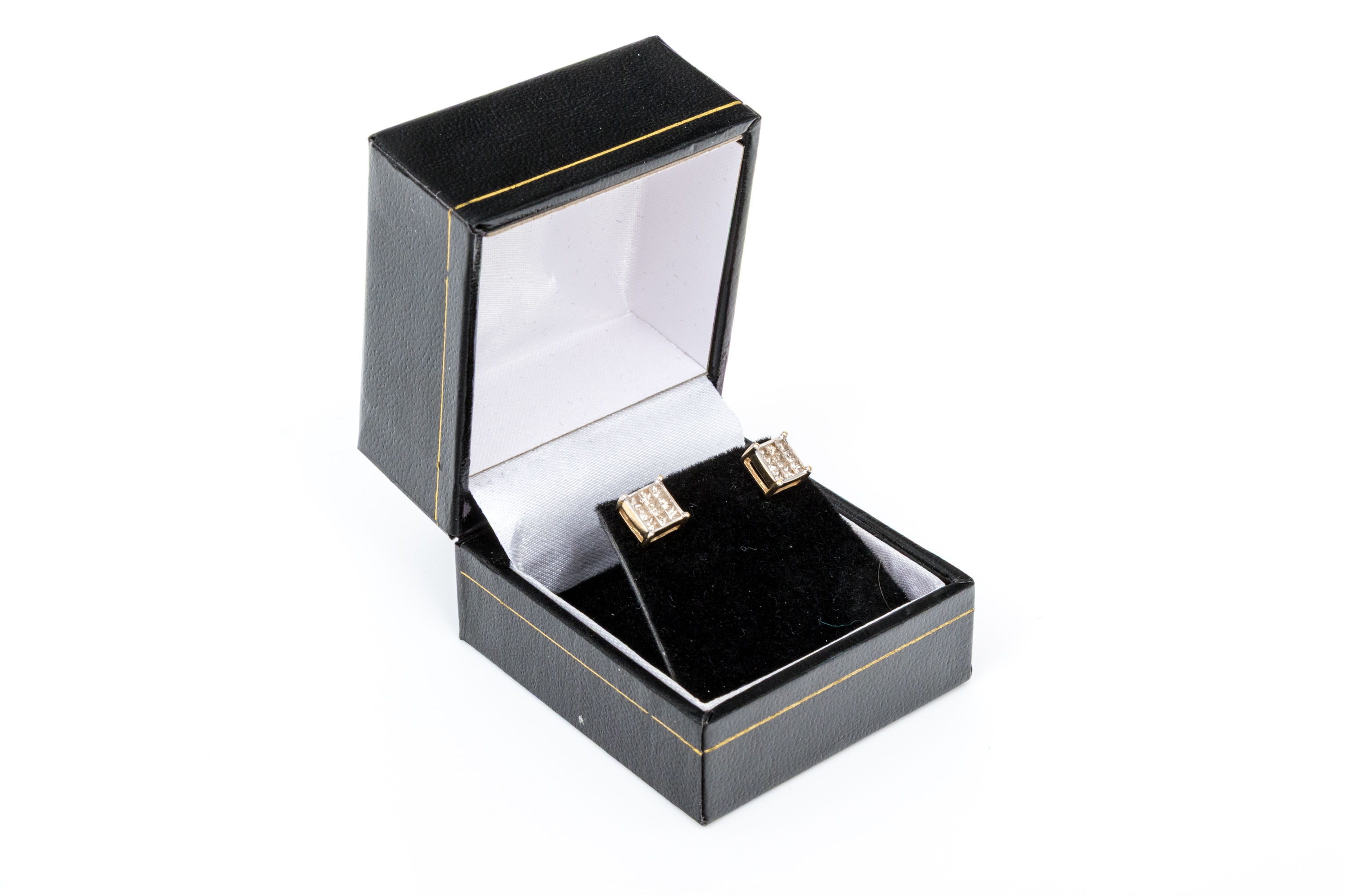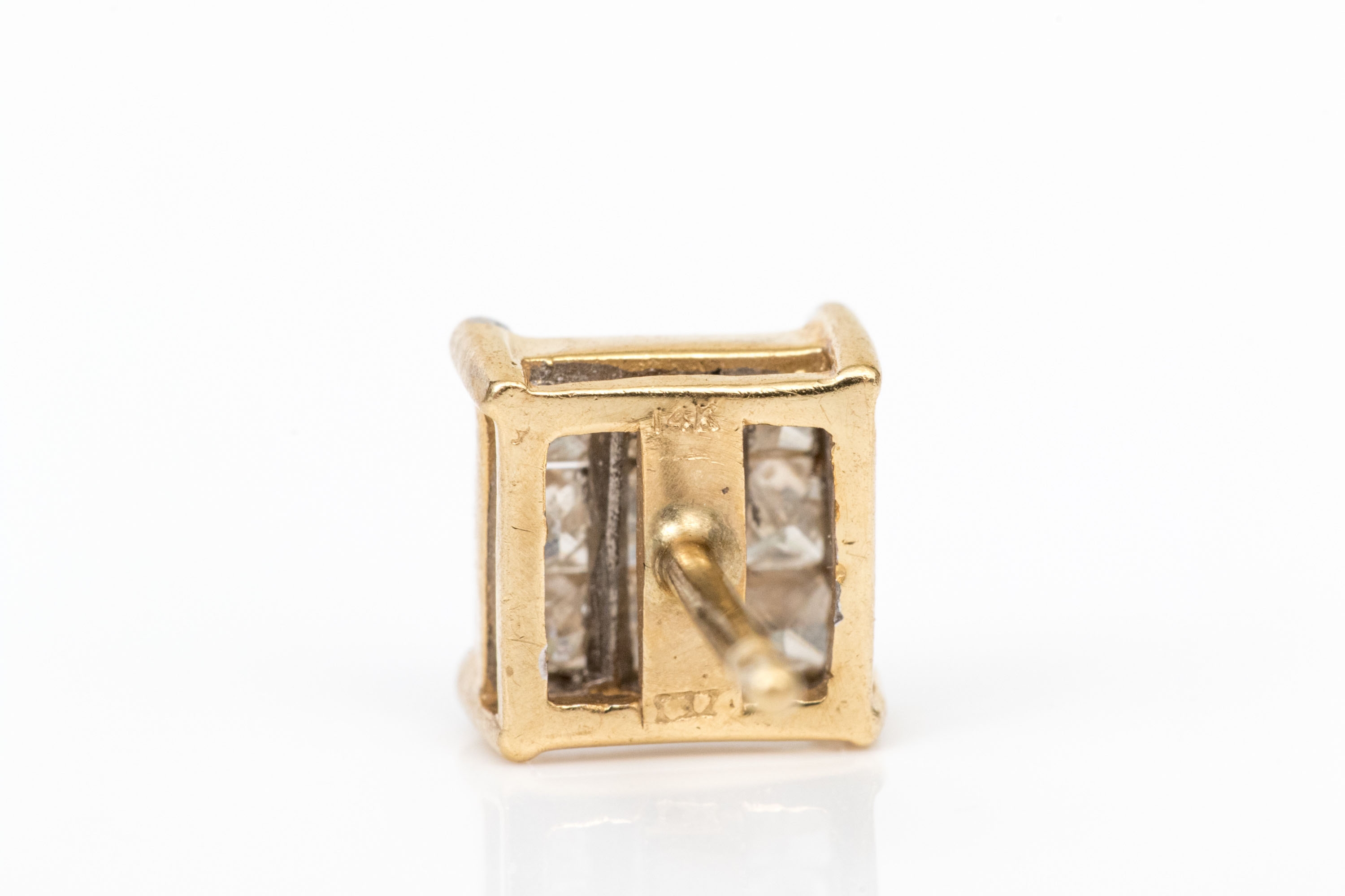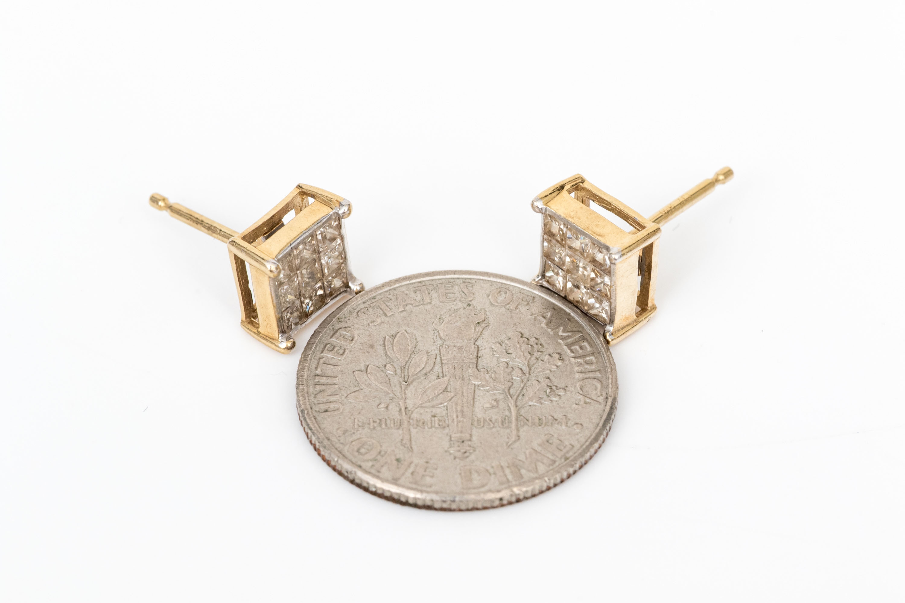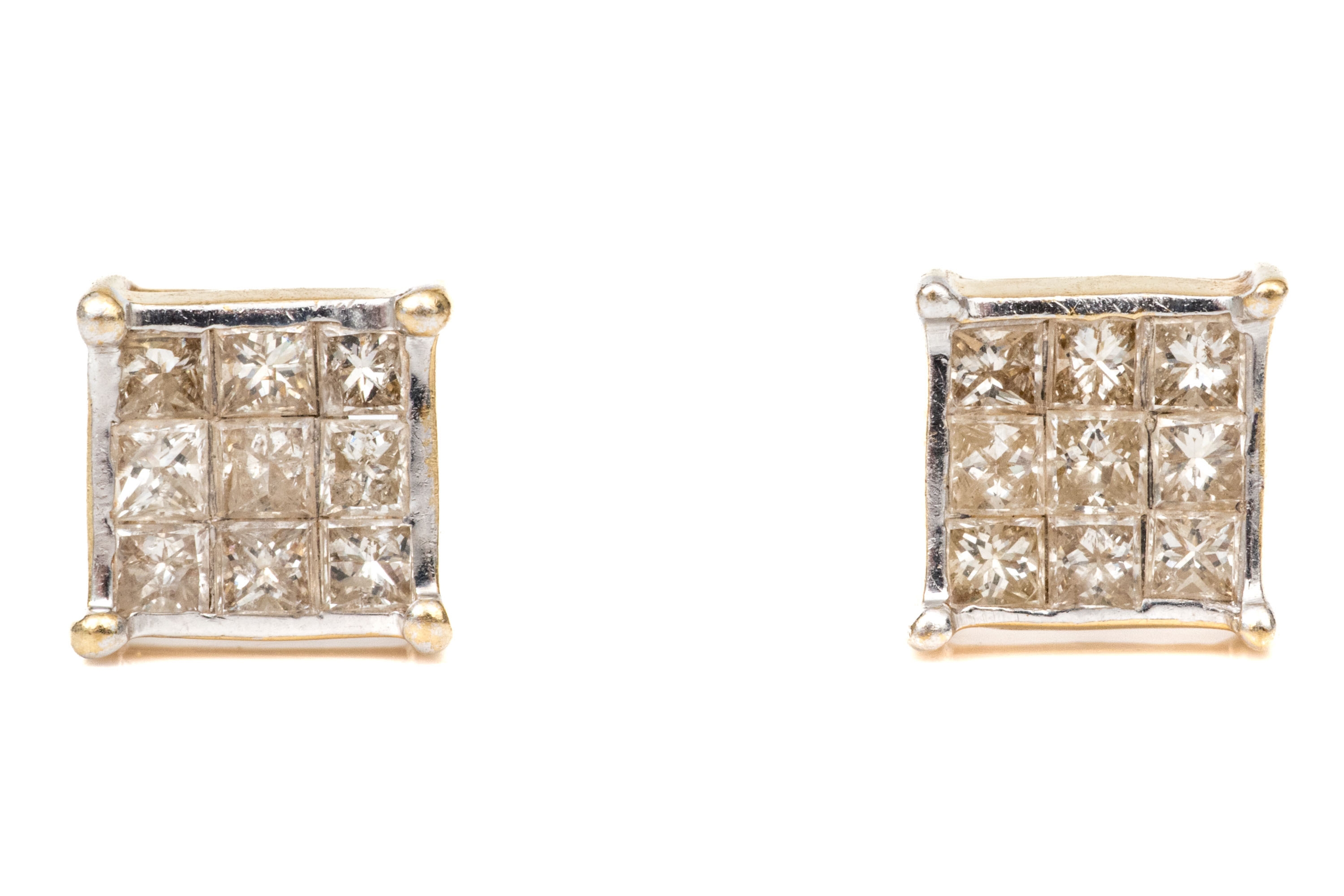 14k yellow gold handsome pair of princess cut diamond cluster earrings, app. 0.54 TCW, finished with posts and missing clutch style backs