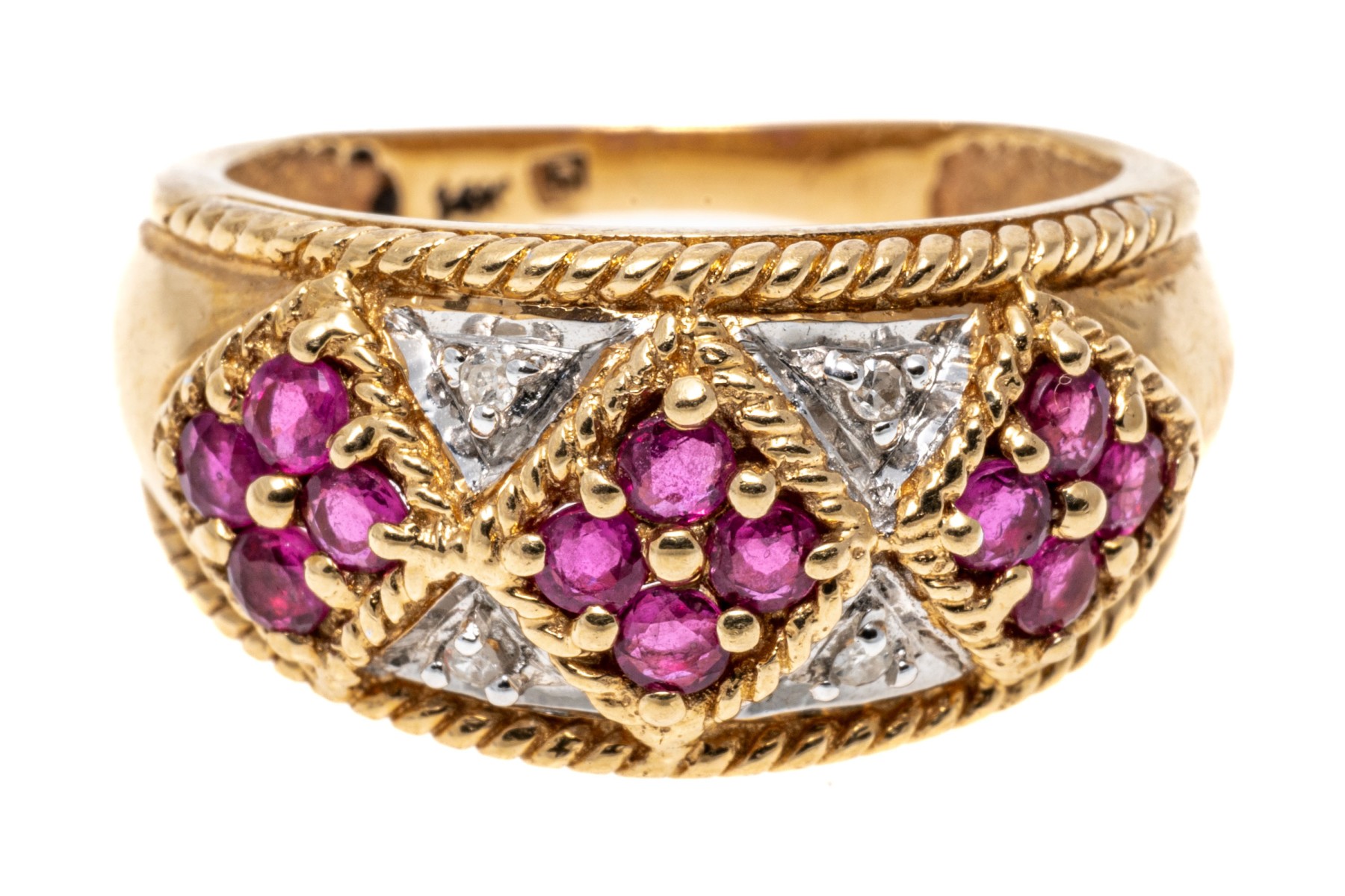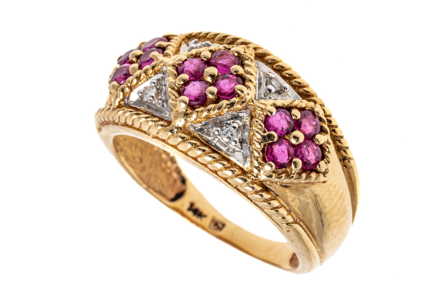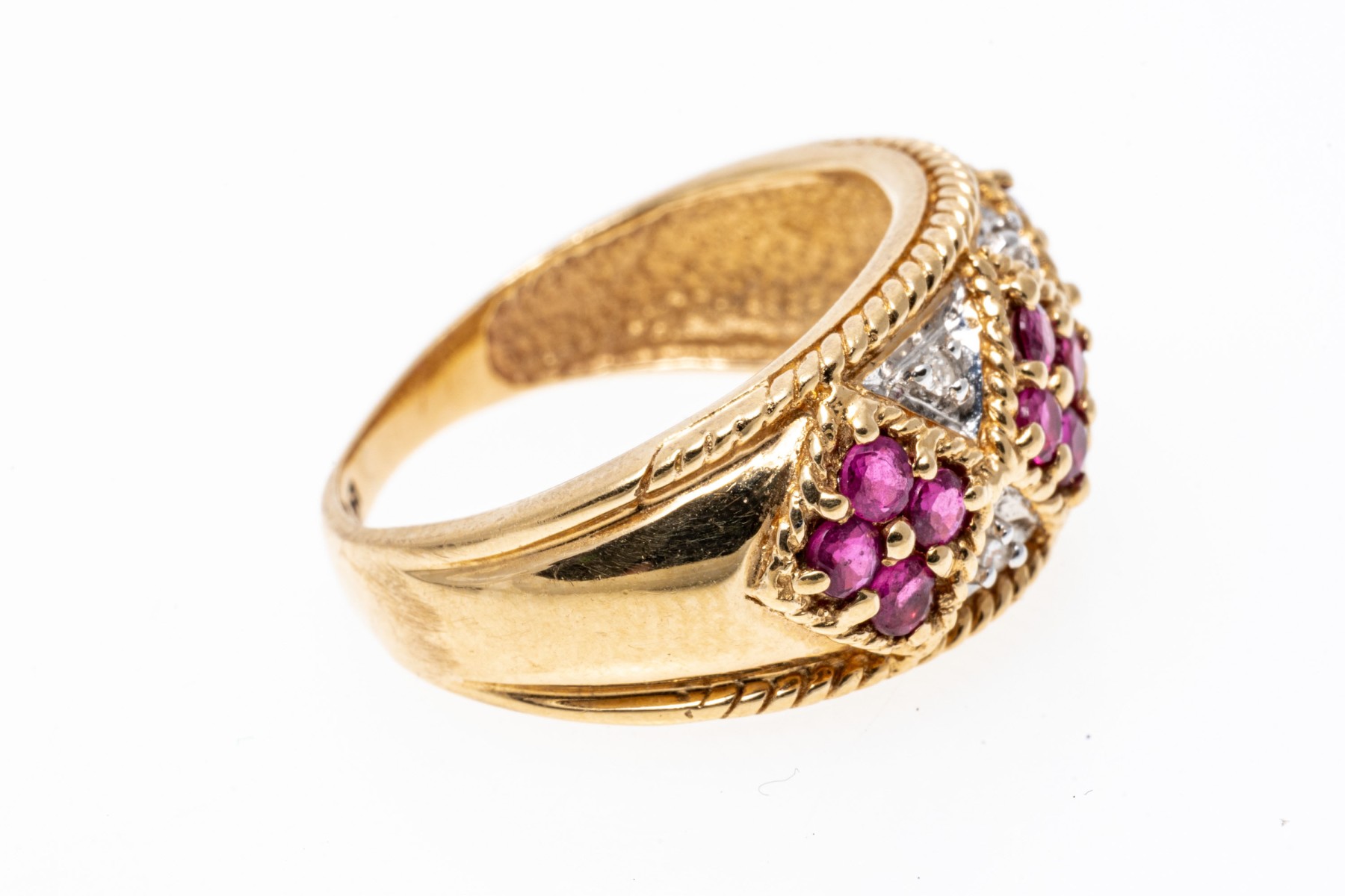 14k yellow gold ring. This handsome yellow gold ring has an argyle pattern motif with round faceted rubies, approximately 0.60 TCW and highlighted by round faceted diamonds, approximately 0.02 TCW