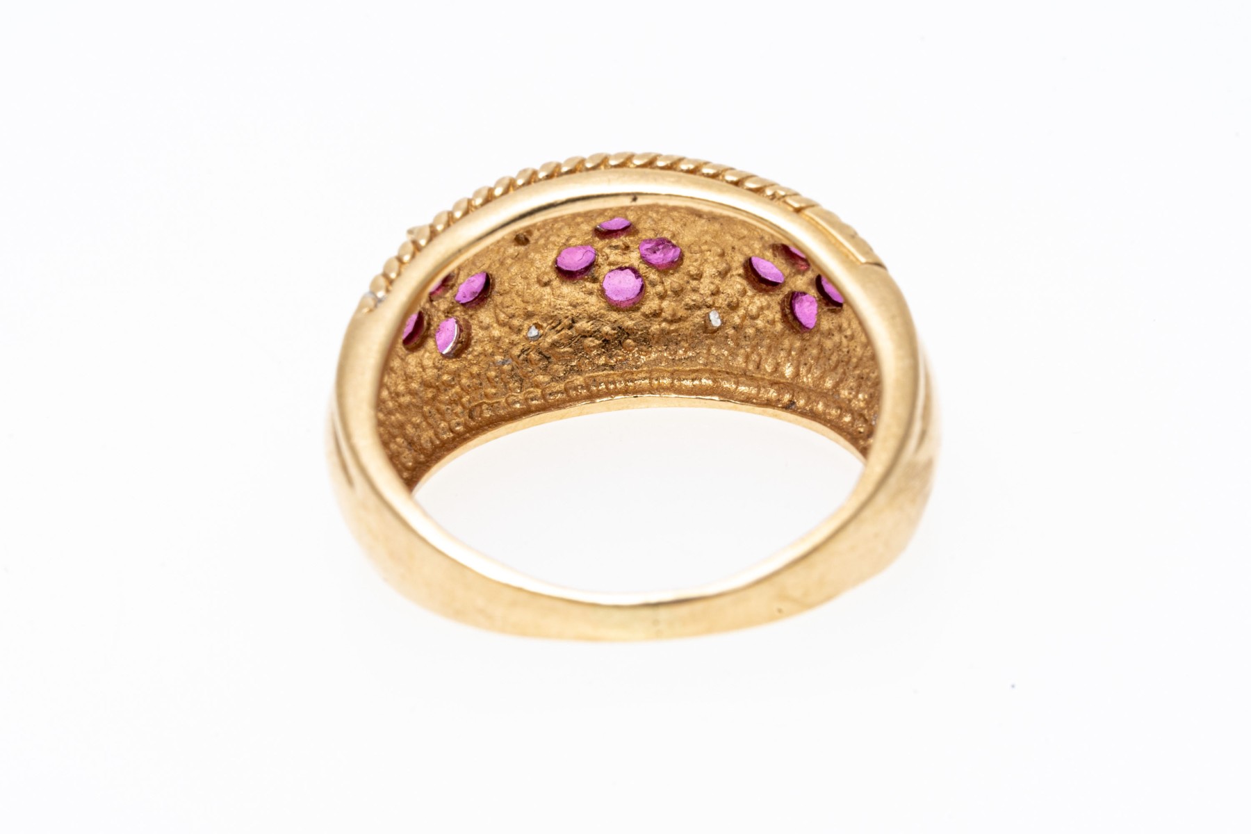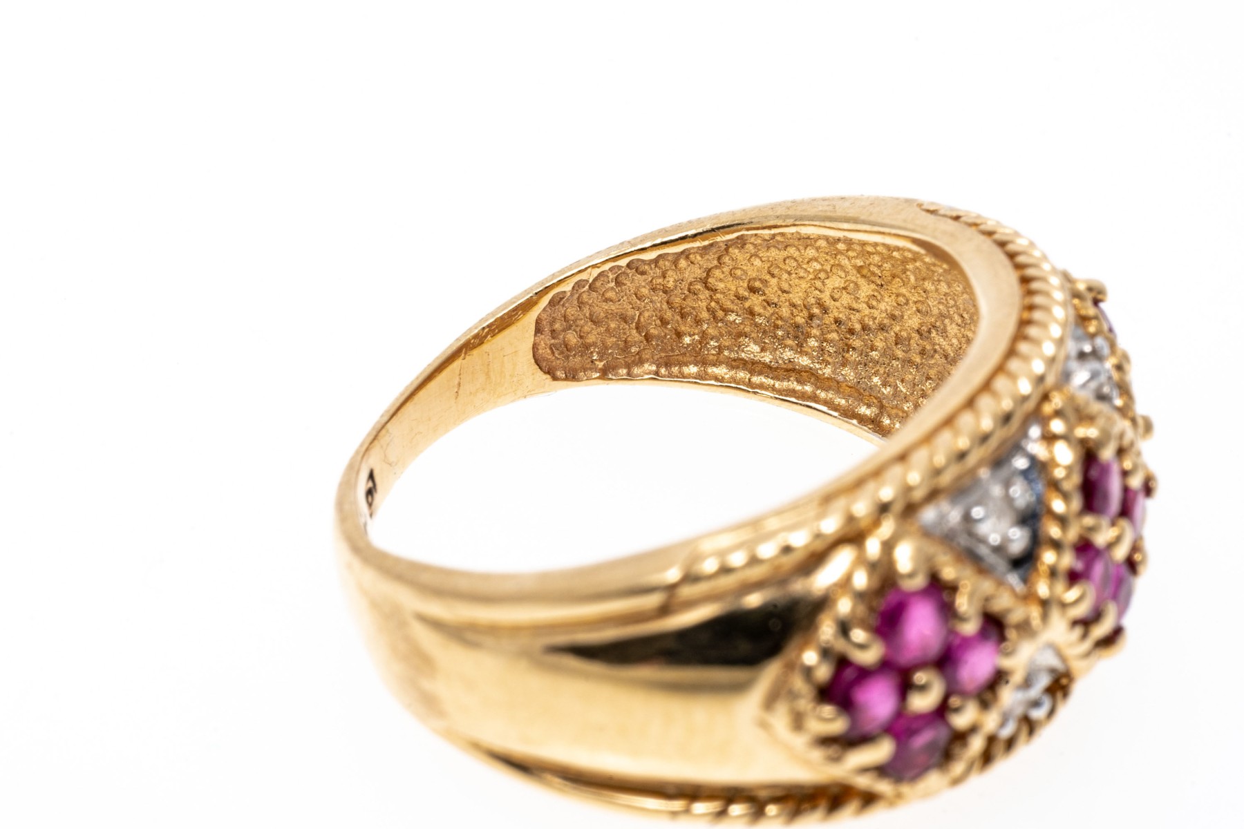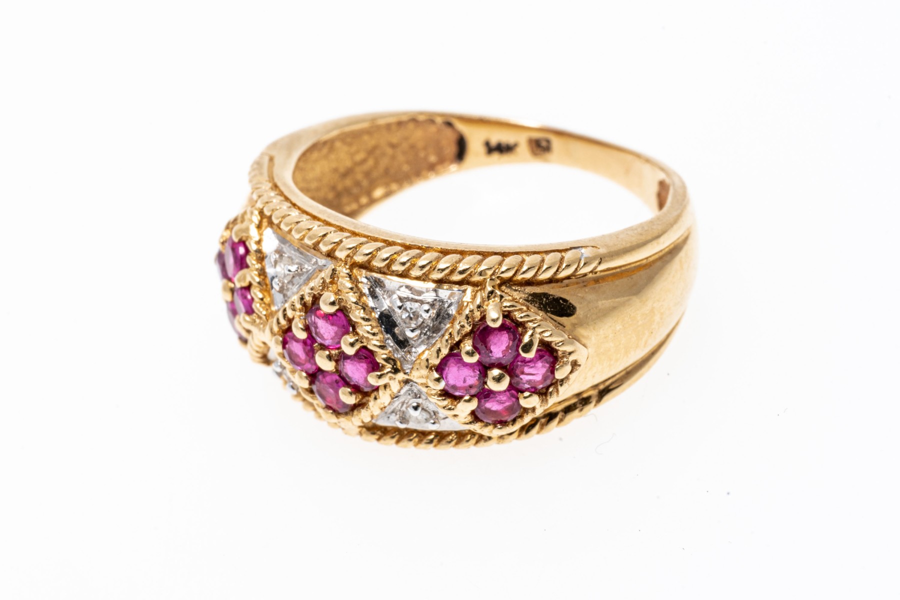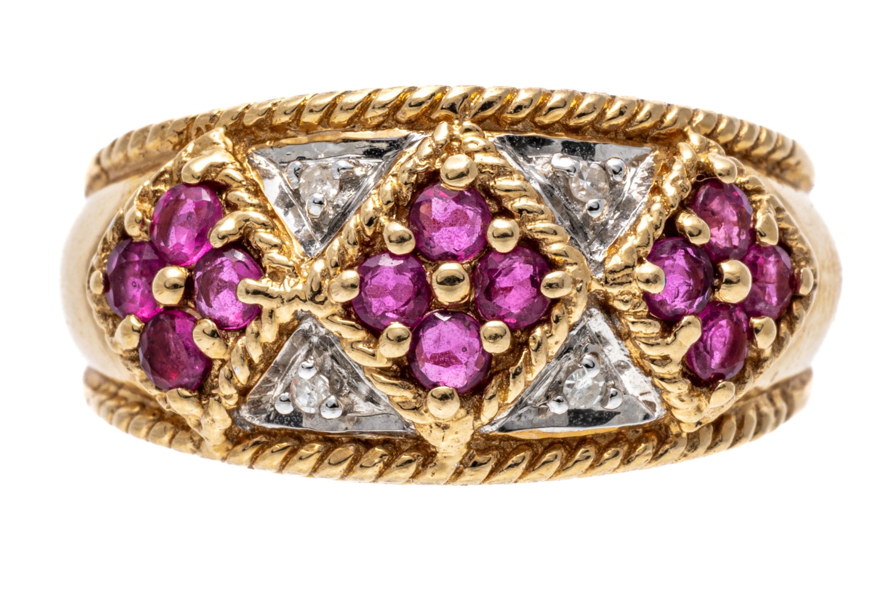 14k yellow gold ring. This handsome yellow gold ring has an argyle pattern motif with round faceted rubies, approximately 0.60 TCW and highlighted by round faceted diamonds, approximately 0.02 TCW