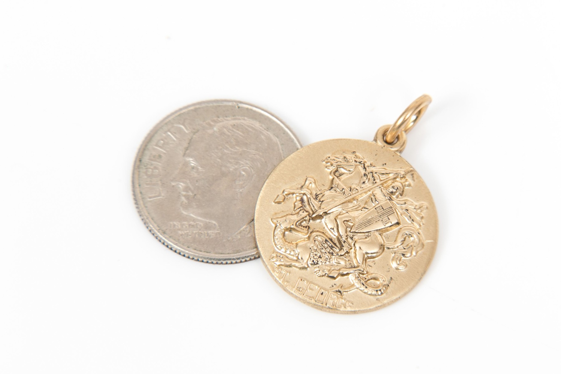 14k yellow gold handsome St. George slaying the dragon medal, finished with a solid bale