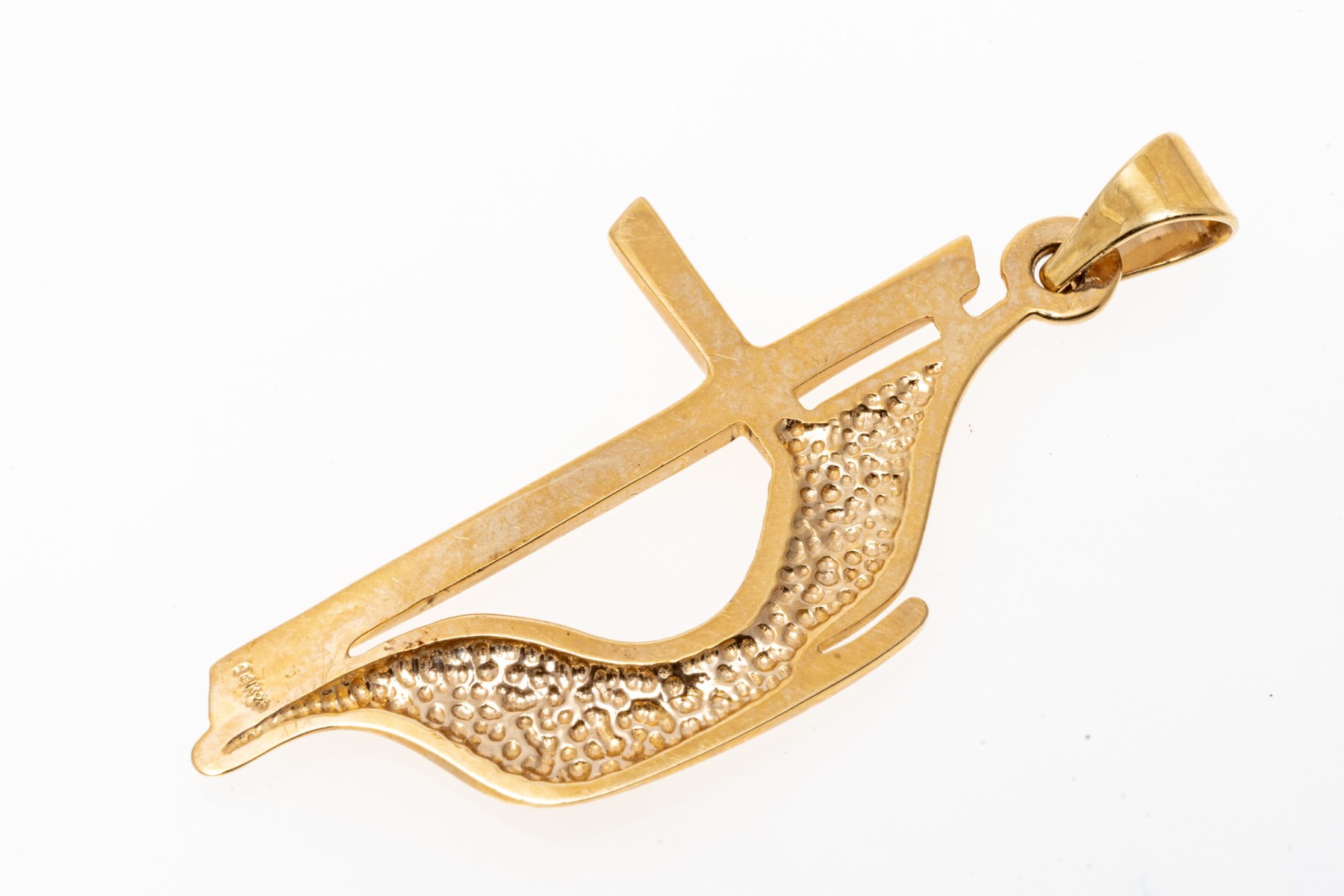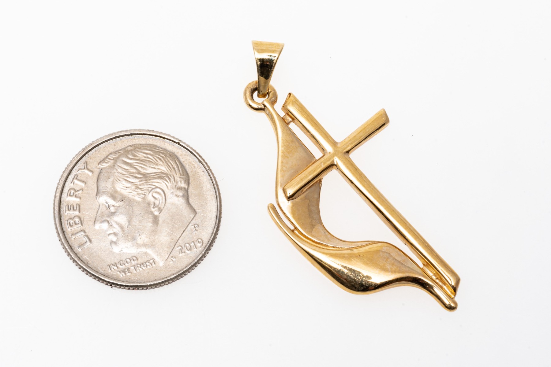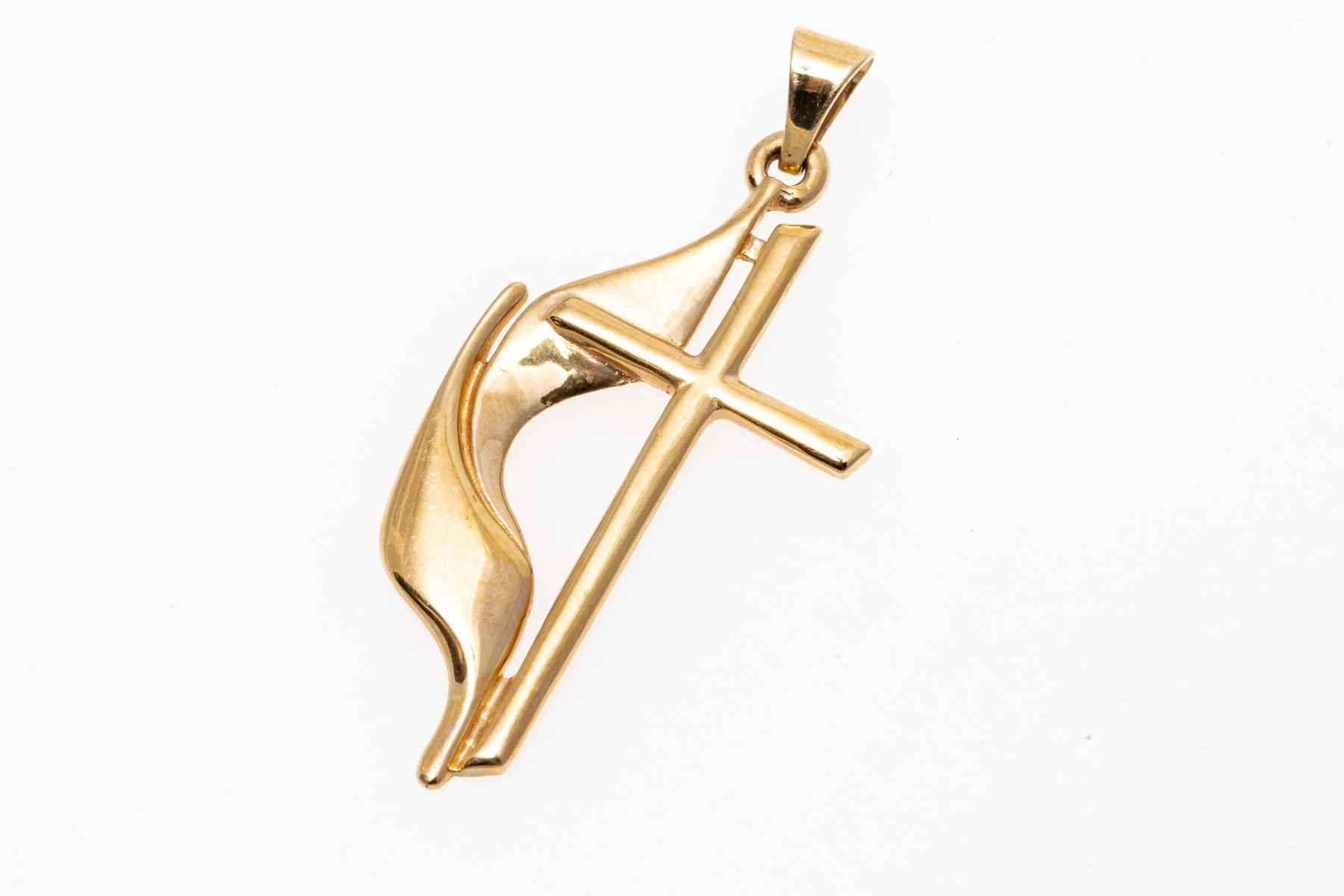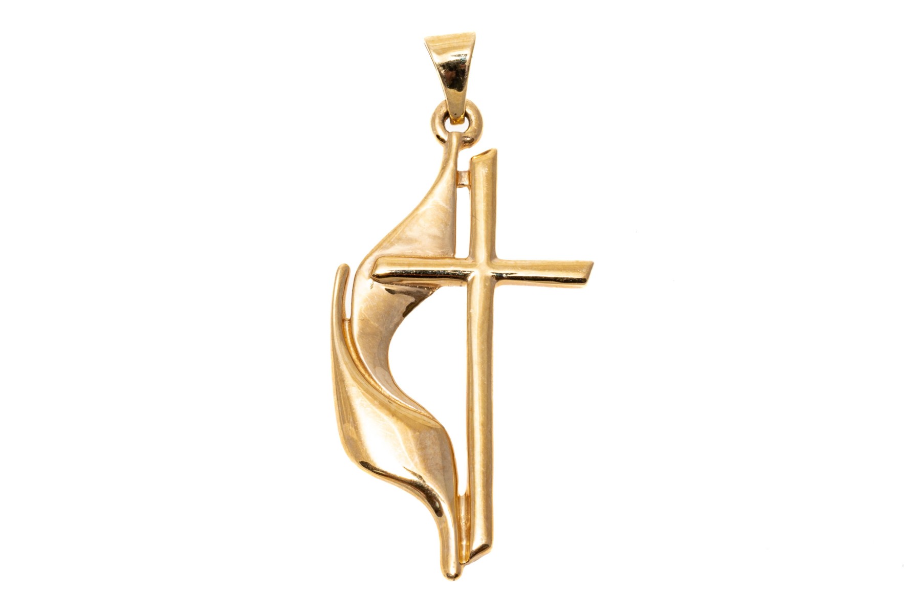14k yellow gold handsome United Methodist flame cross, finished with a solid style bale