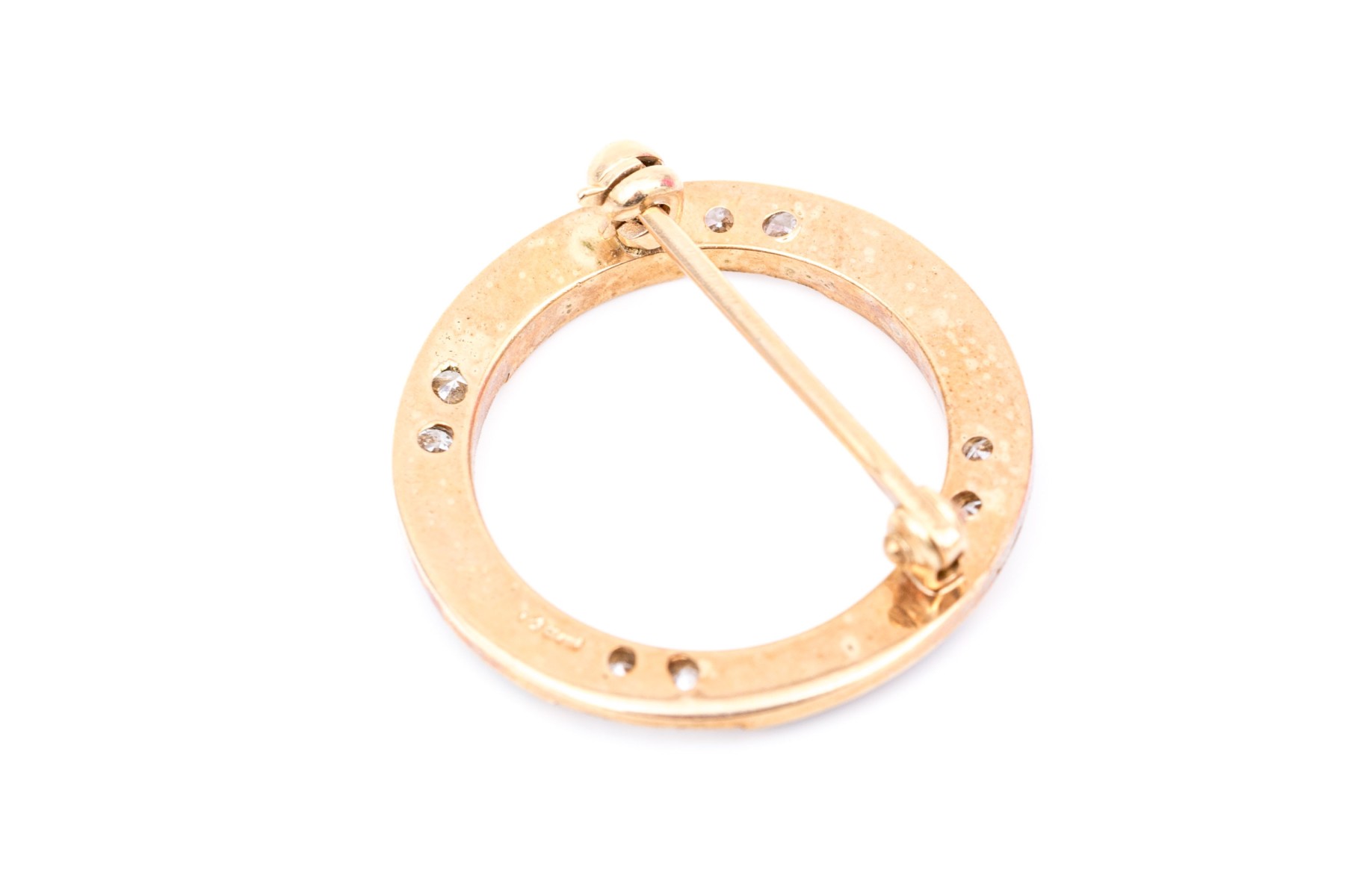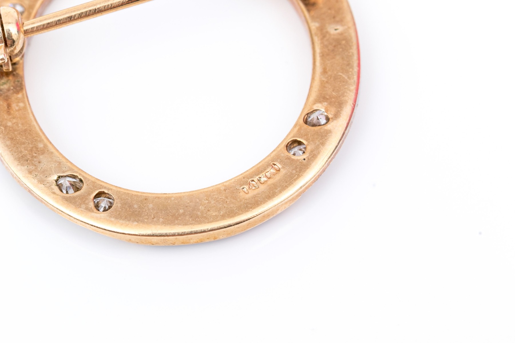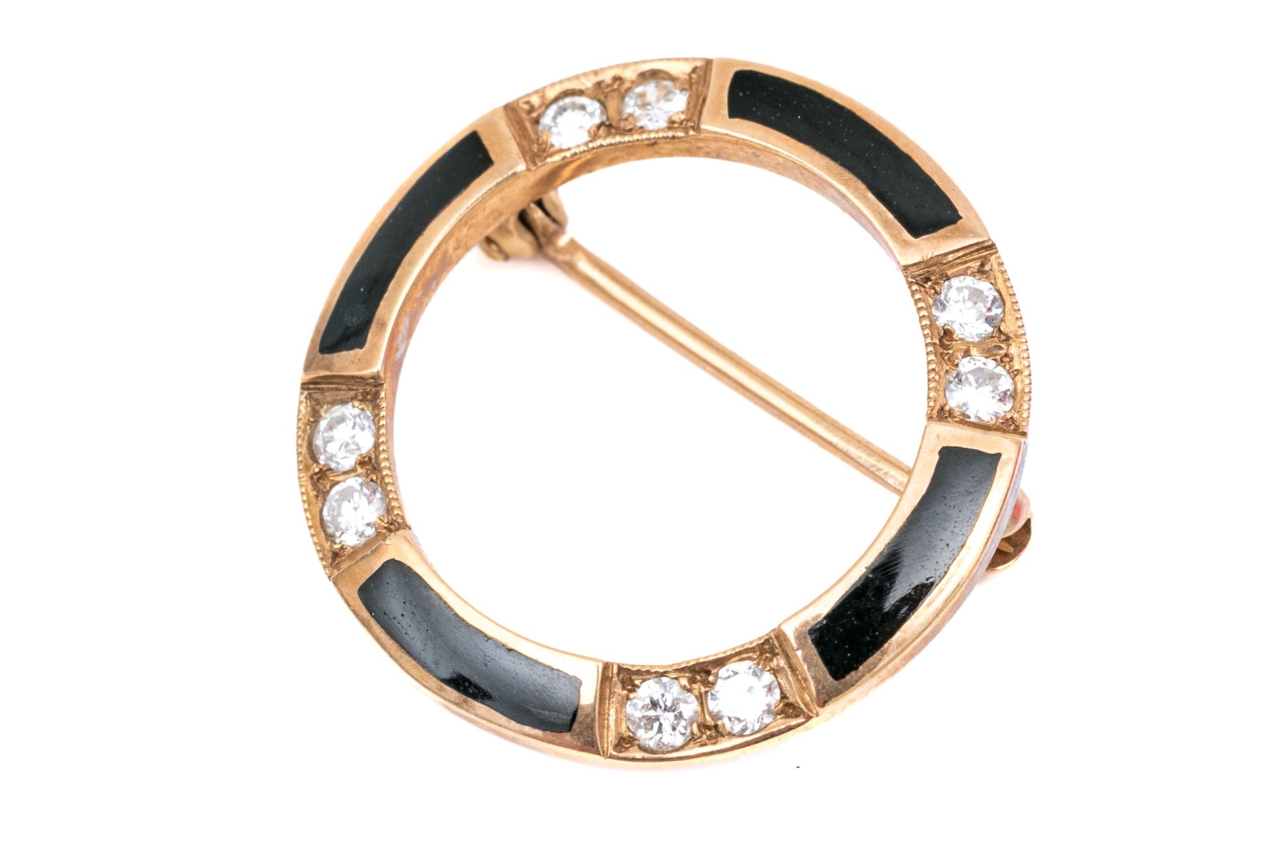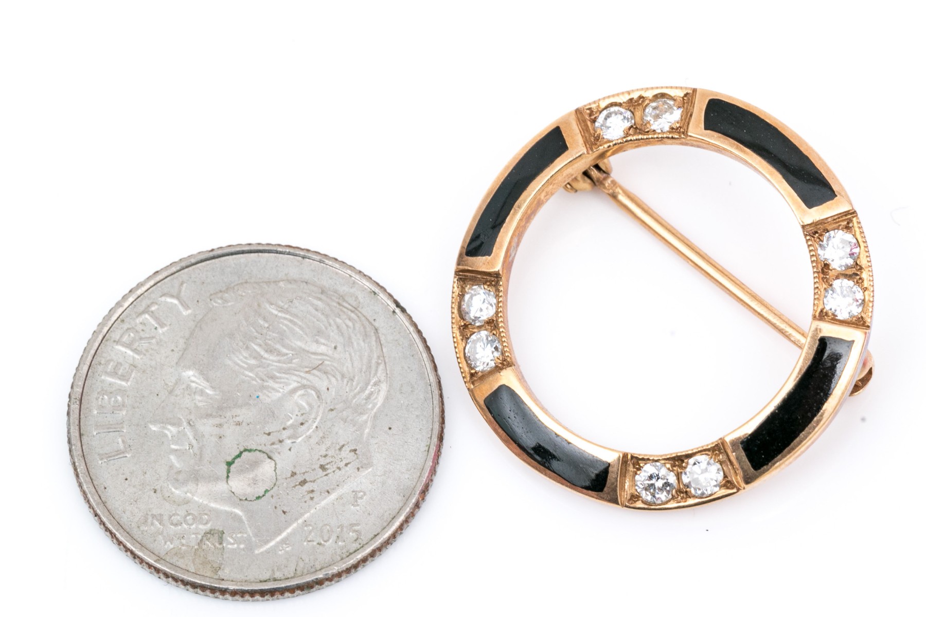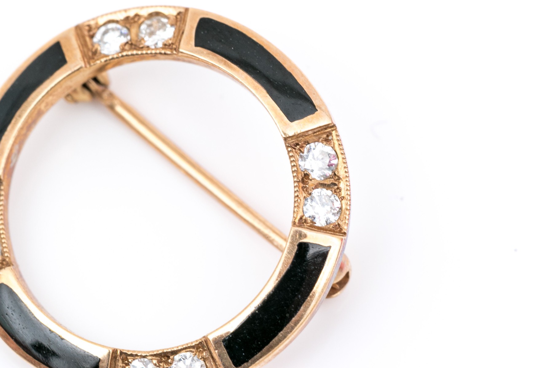 14k yellow gold handsome vintage black enamel and diamonds circle pin. This striking pin features alternating black enamel panels, alternating with round faceted diamonds, app. 0.19 TCW