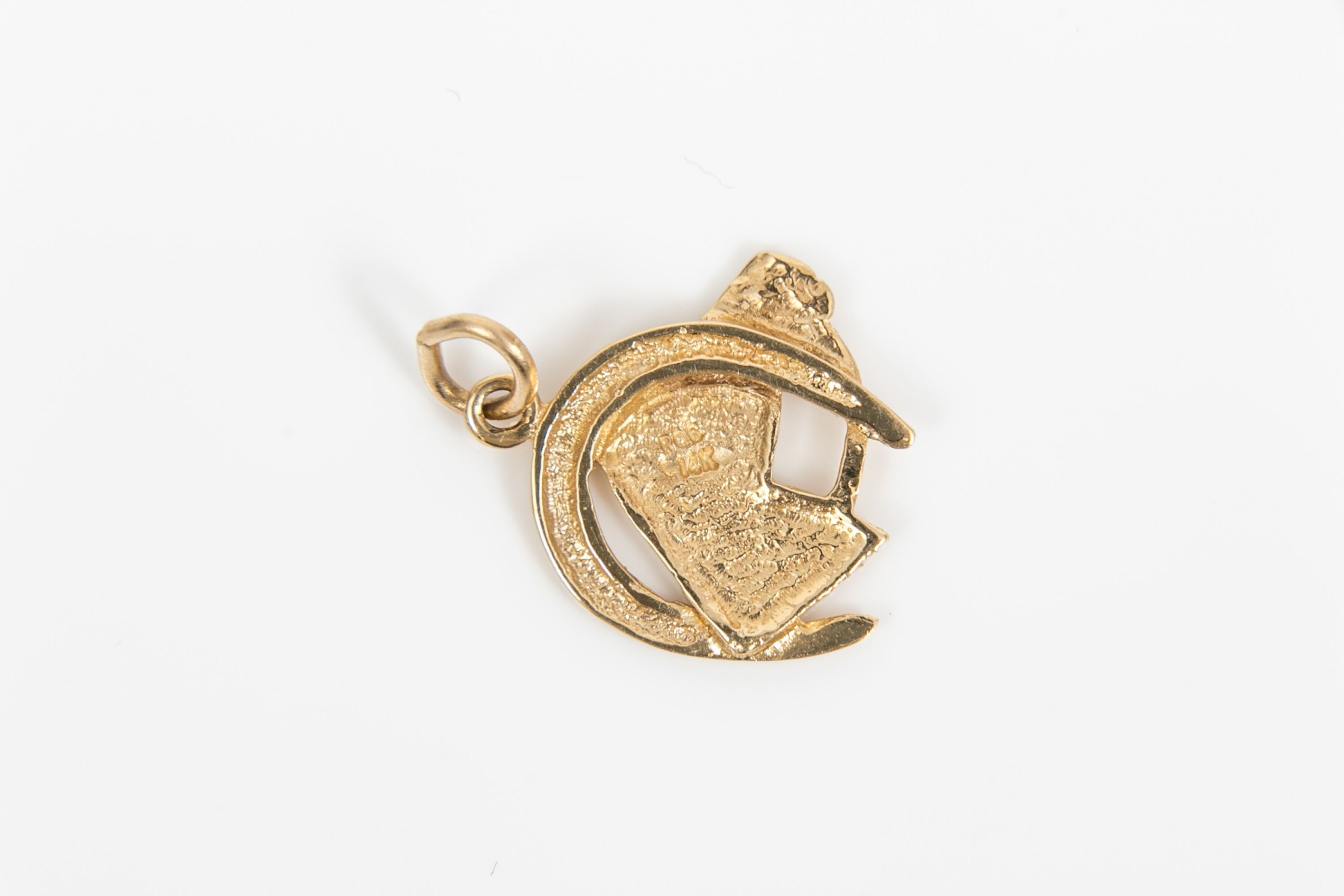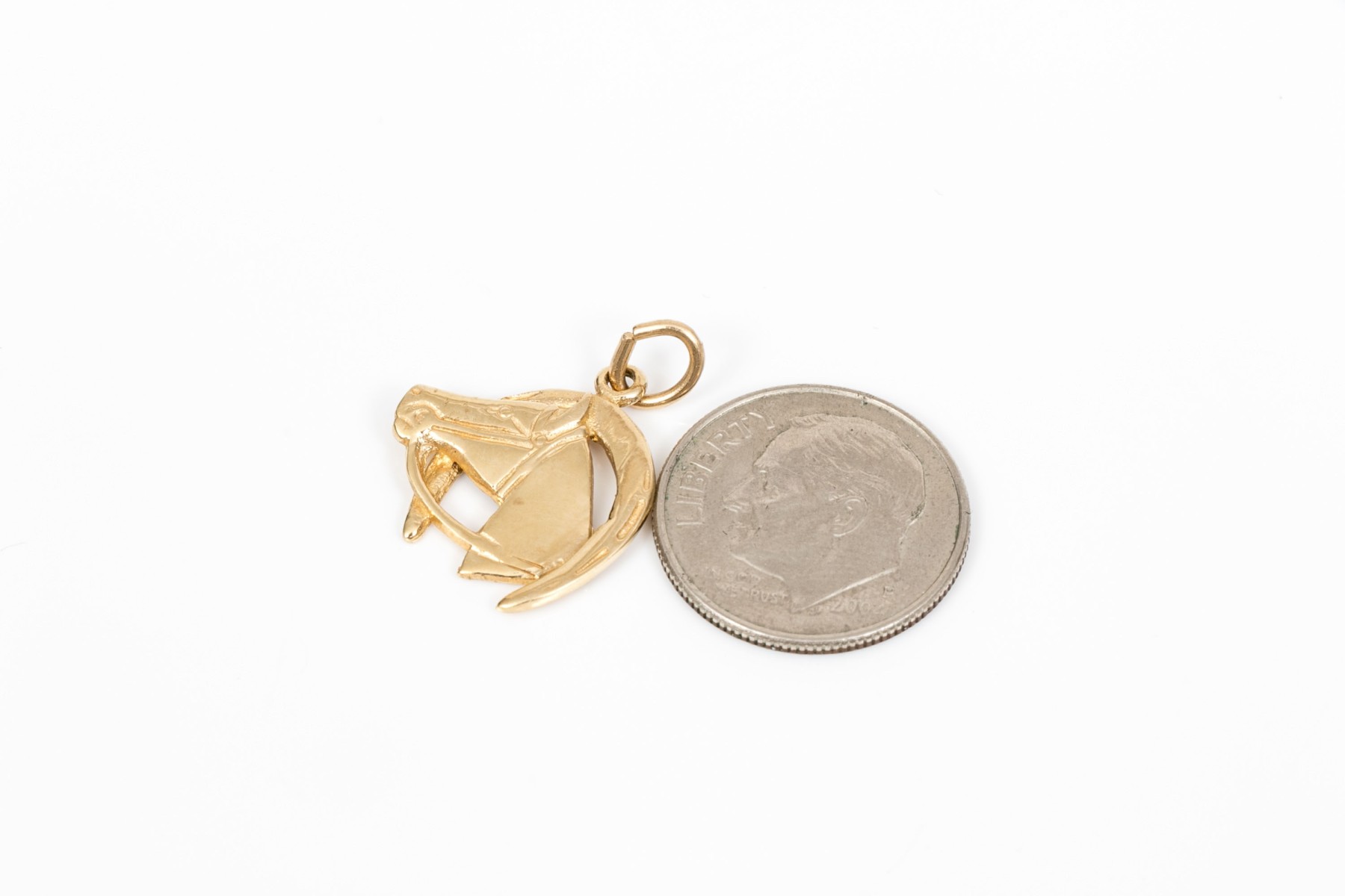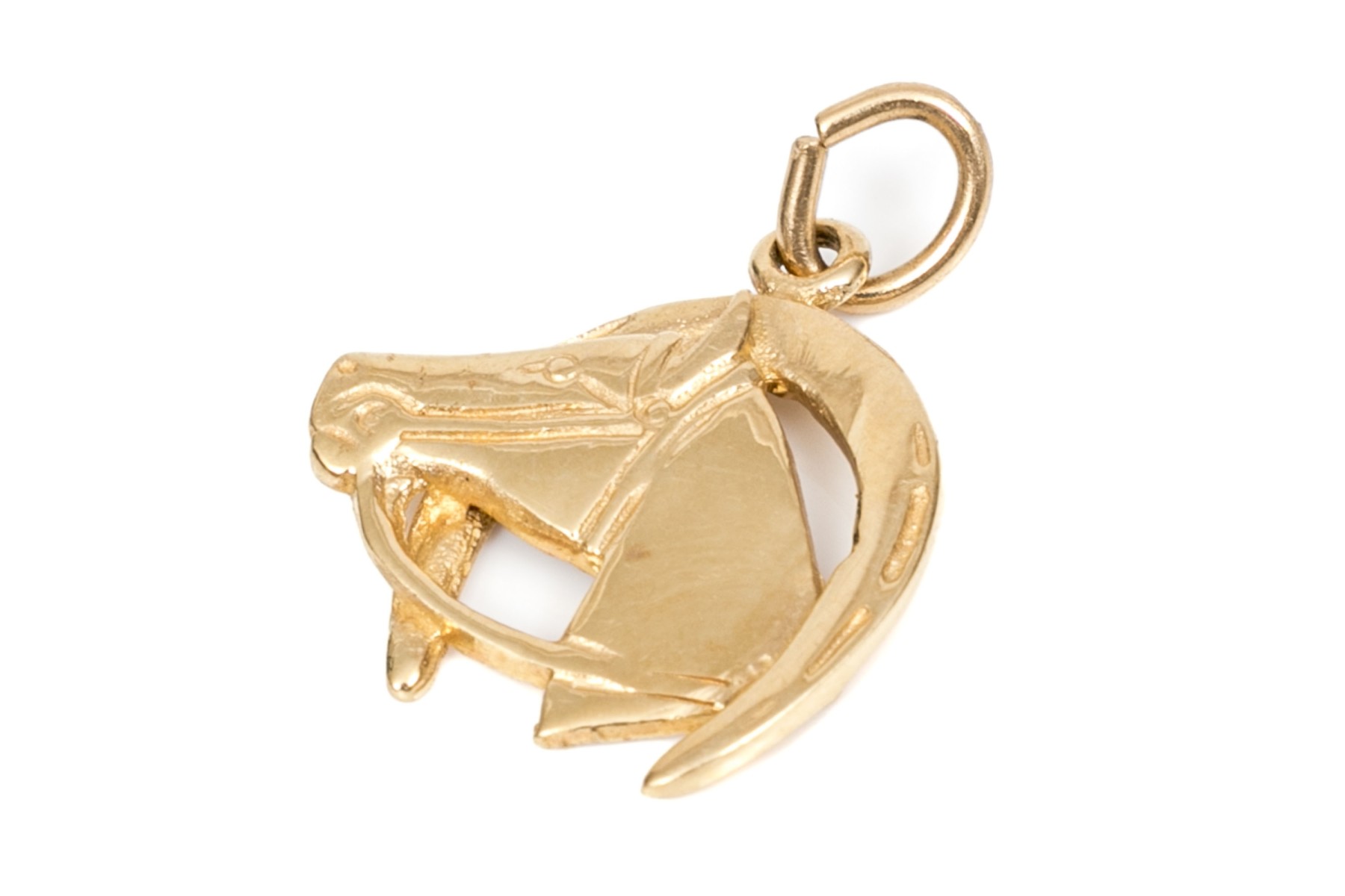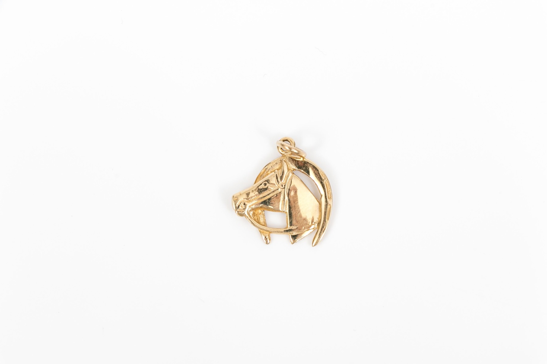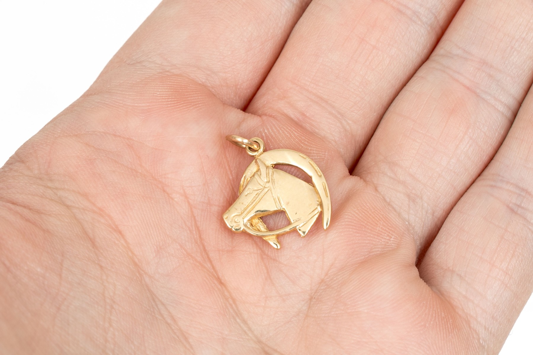 14k yellow gold horse head and horseshoe pendant, finished with a jump ring