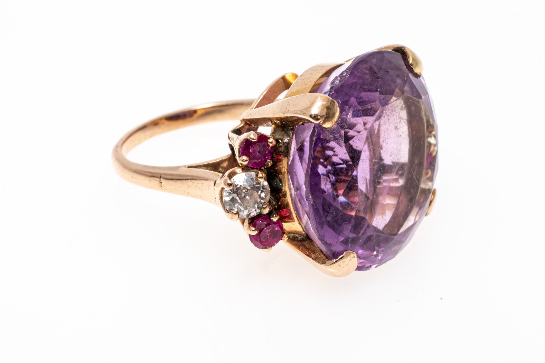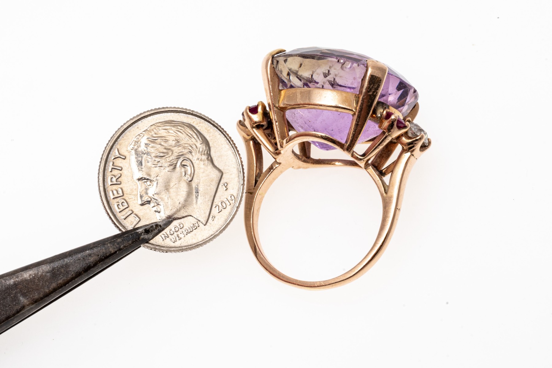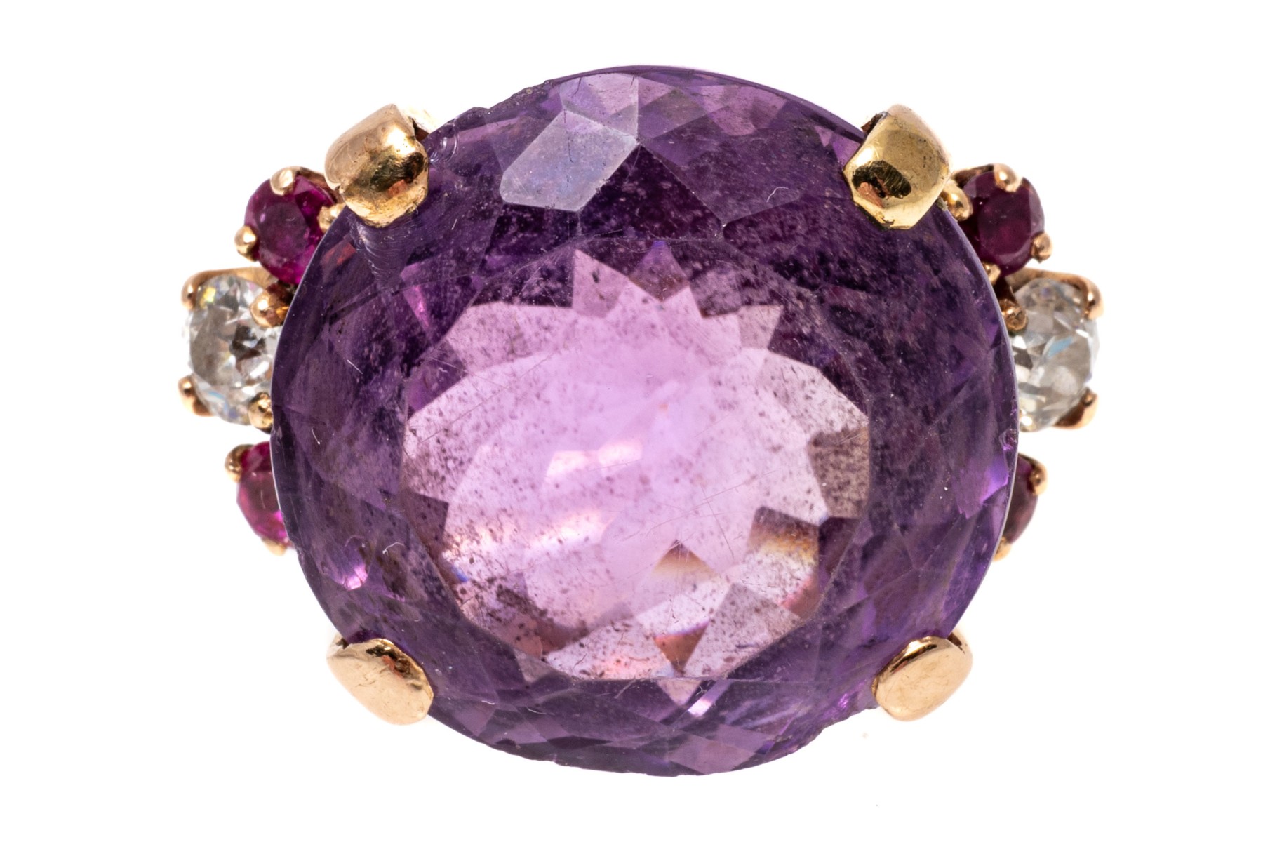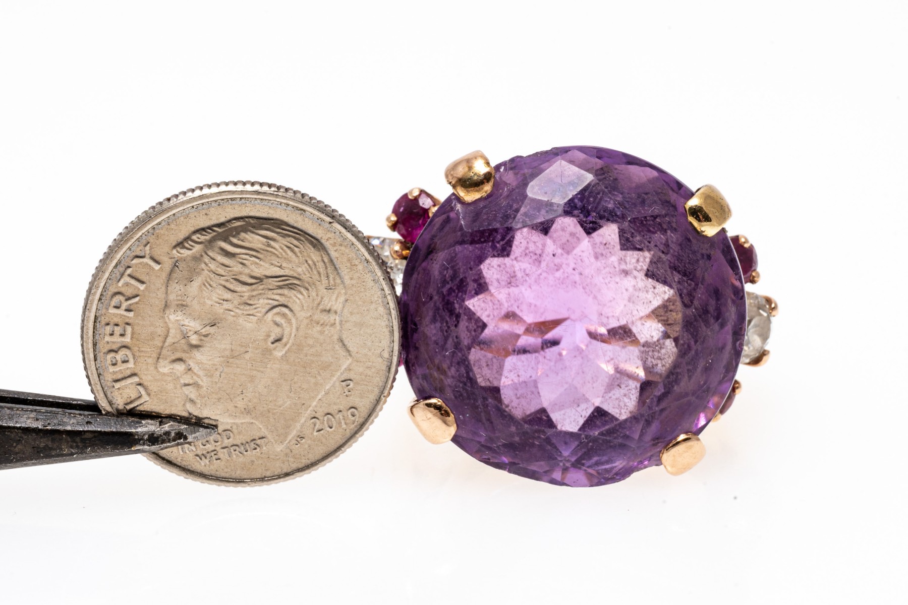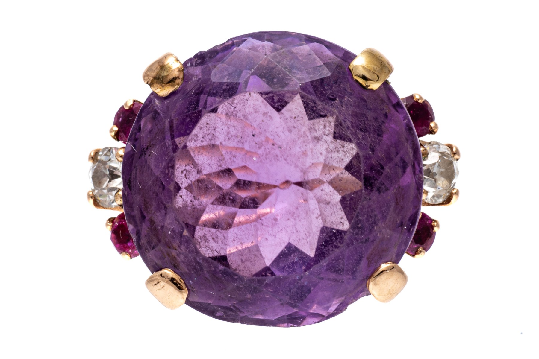 14k yellow gold impactful large purple amethyst, diamond and ruby ring, size 5.75. The center amethyst is a light color purple, round faceted, approximately 19.84 CTS, flanked by a cluster of round brilliant cut diamonds, approximately 0.50 TCW, and round faceted rubies, approximately 0.60 TCW, all prong set