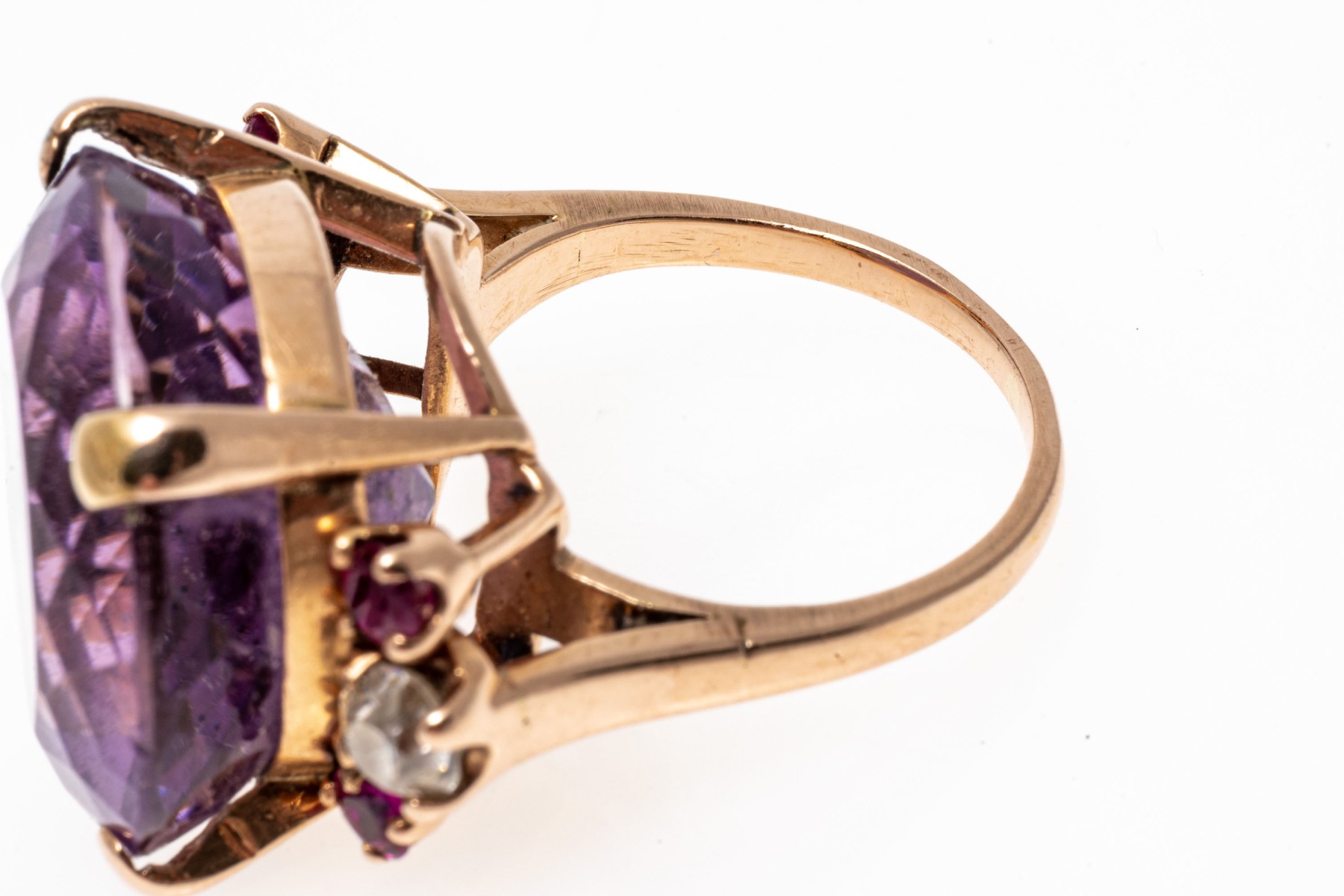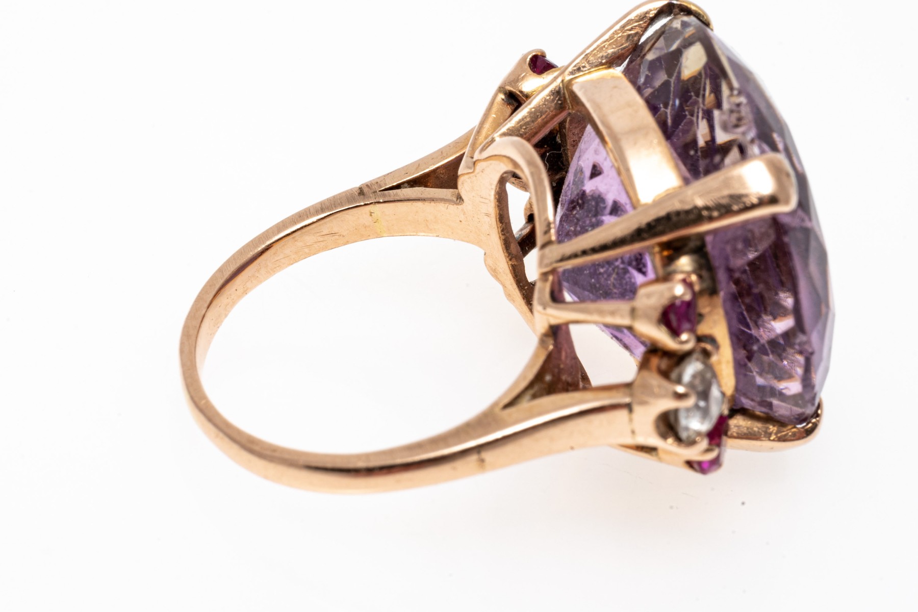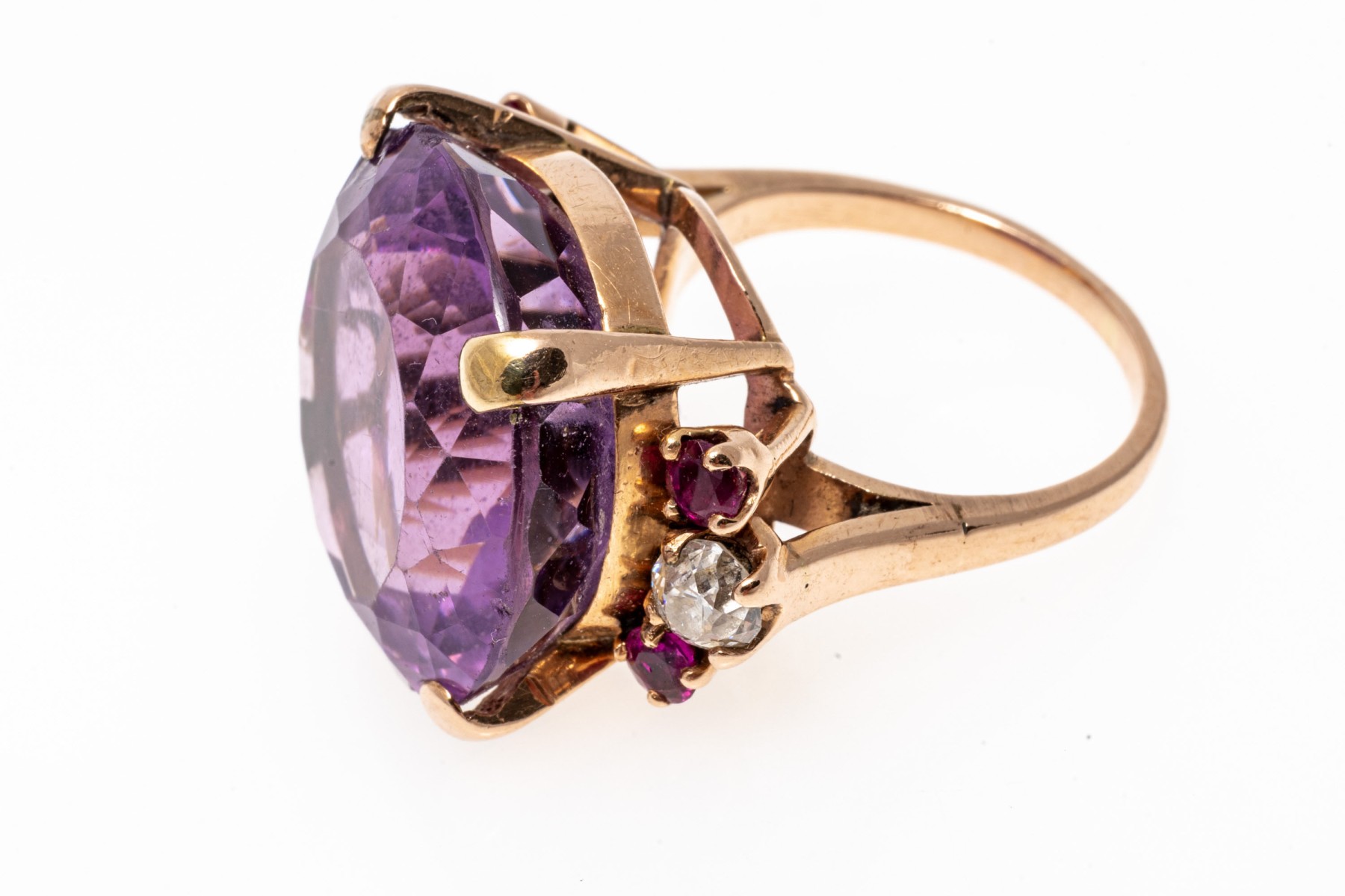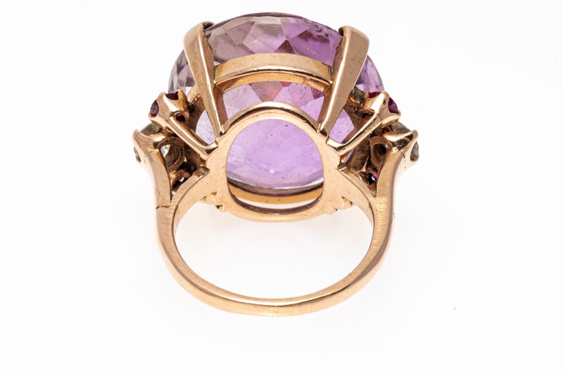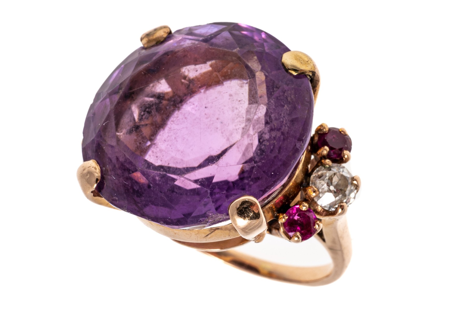 14k yellow gold impactful large purple amethyst, diamond and ruby ring, size 5.75. The center amethyst is a light color purple, round faceted, approximately 19.84 CTS, flanked by a cluster of round brilliant cut diamonds, approximately 0.50 TCW, and round faceted rubies, approximately 0.60 TCW, all prong set