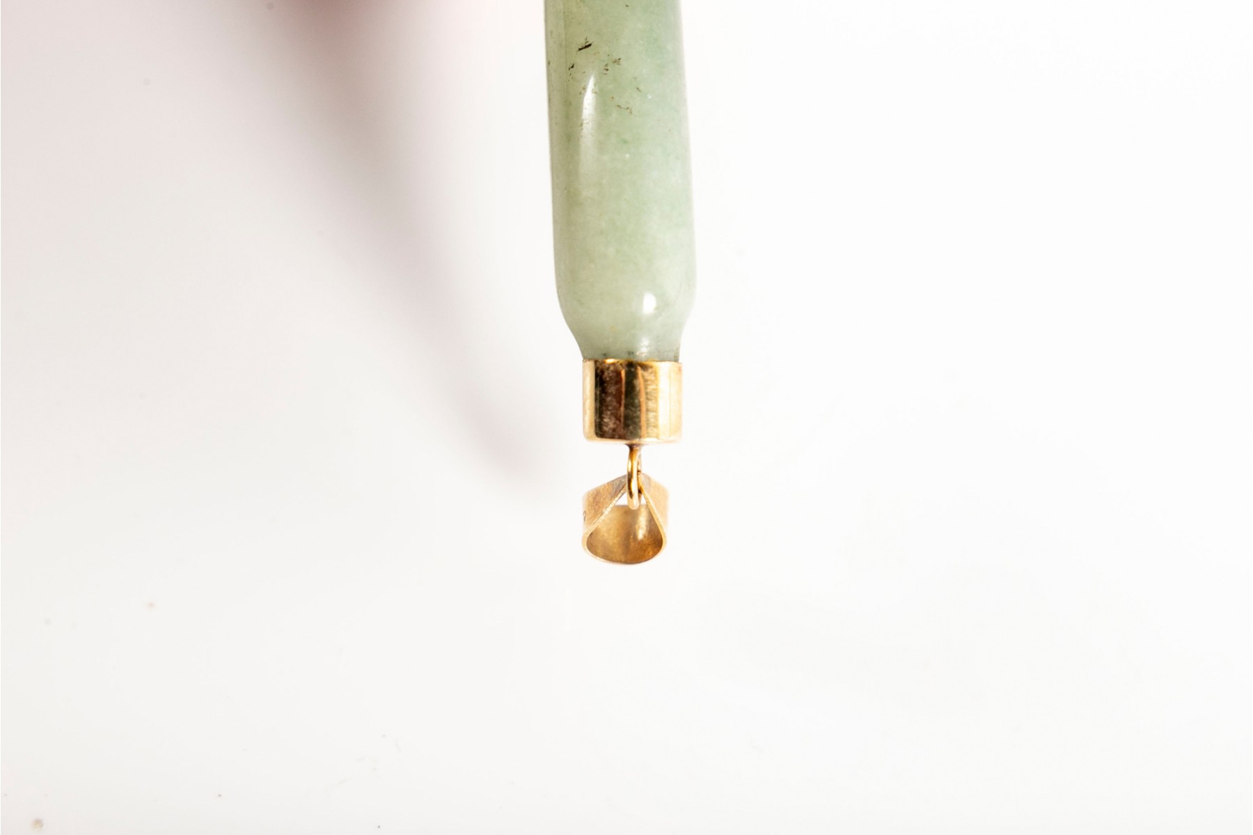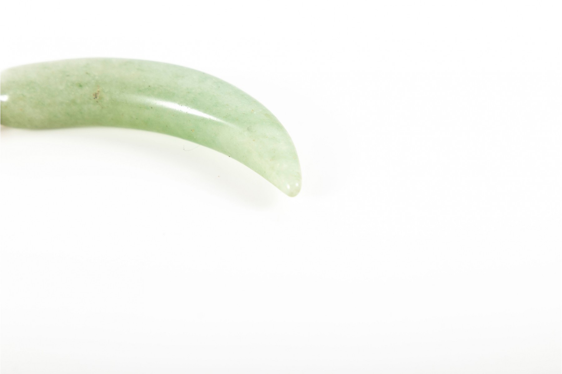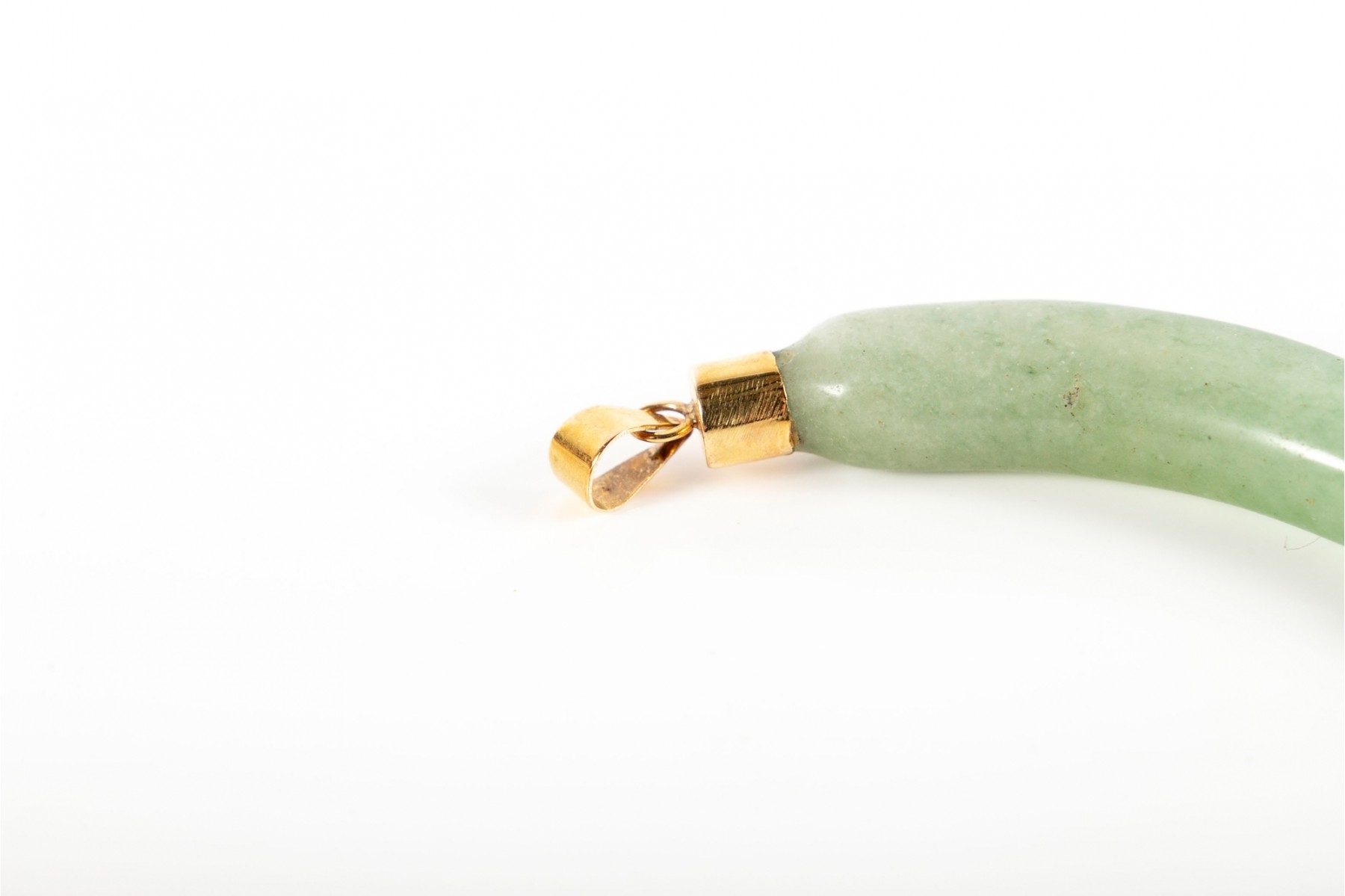 A wonderful pale green jade claw-form pendant with a yellow gold cap and bail.