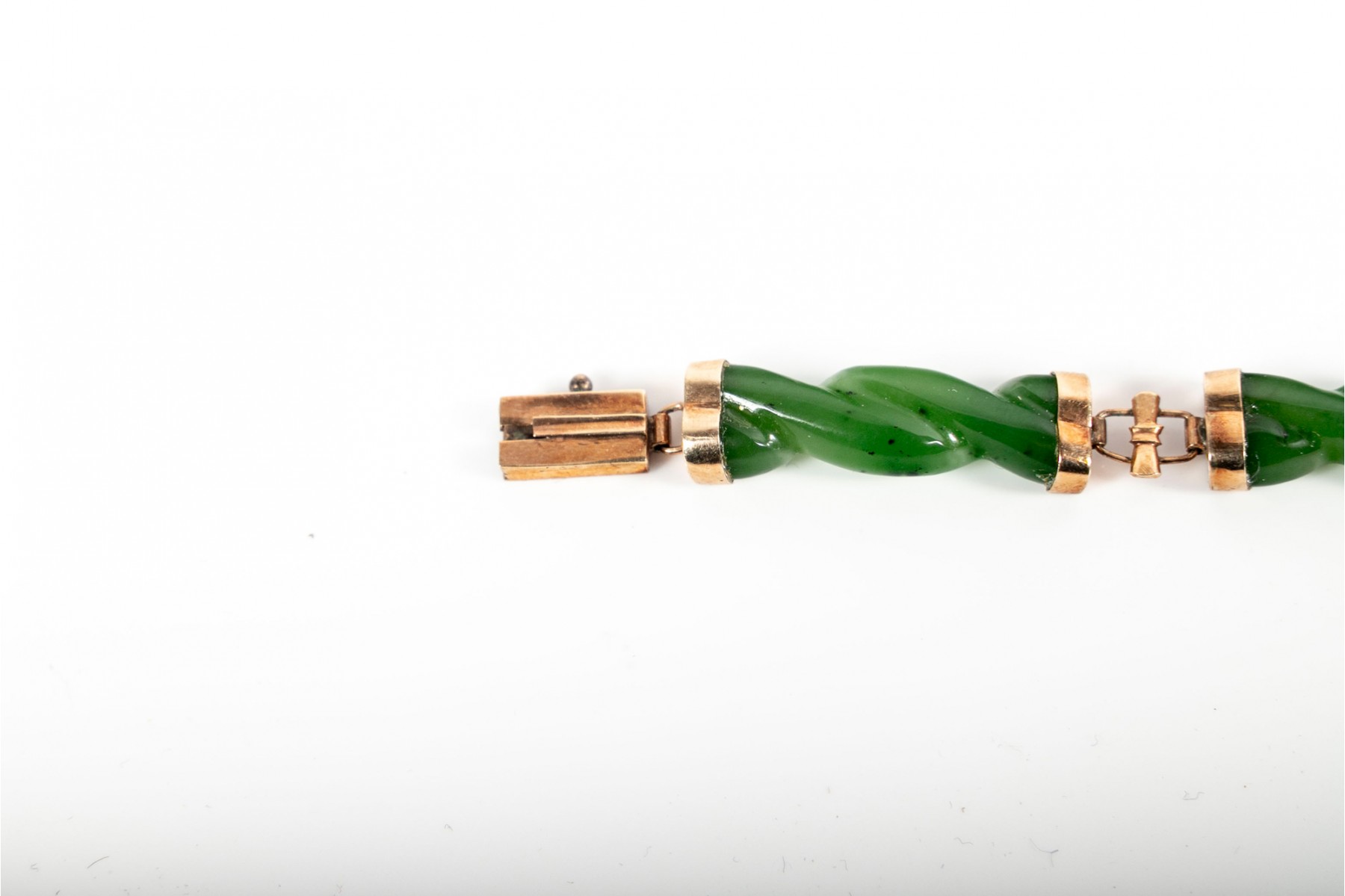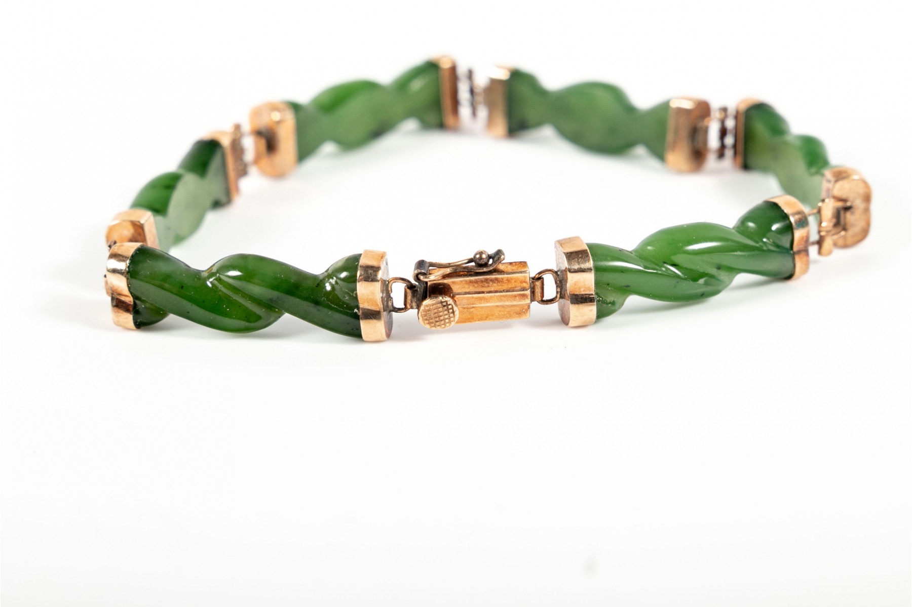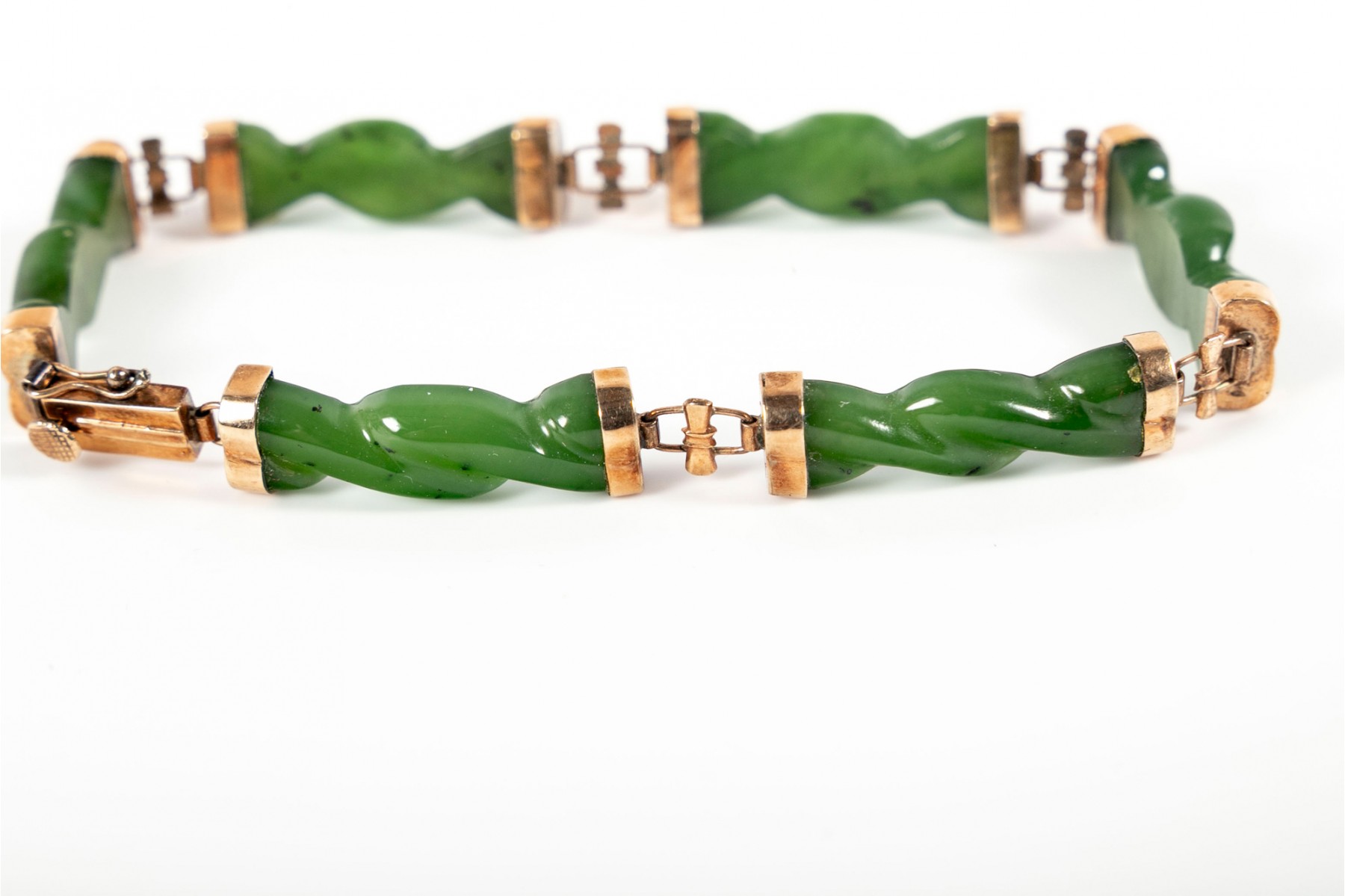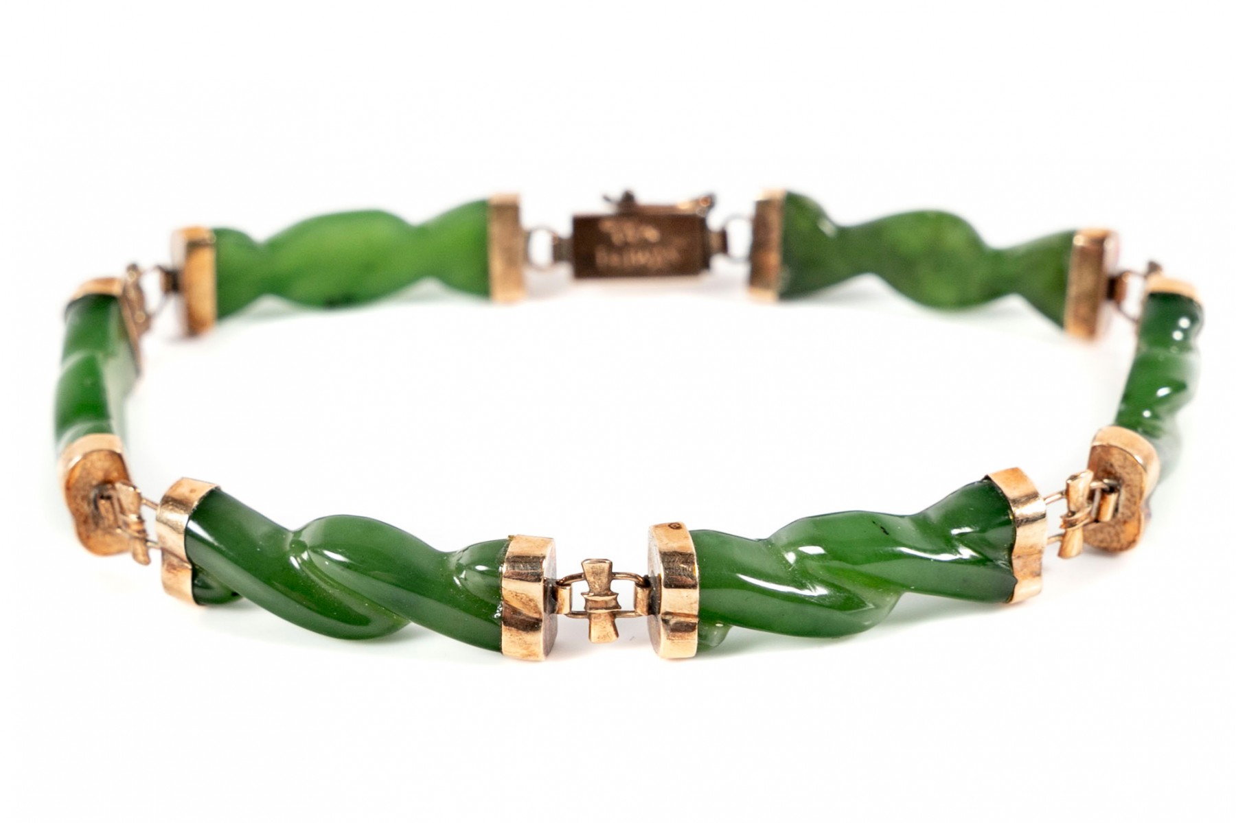 A beautiful yellow gold bracelet with links of nephrite jade in a sophisticated moss green, carved into barley twist or spiral motifs, capped in gold and accented with bow or scroll-shaped spacers.