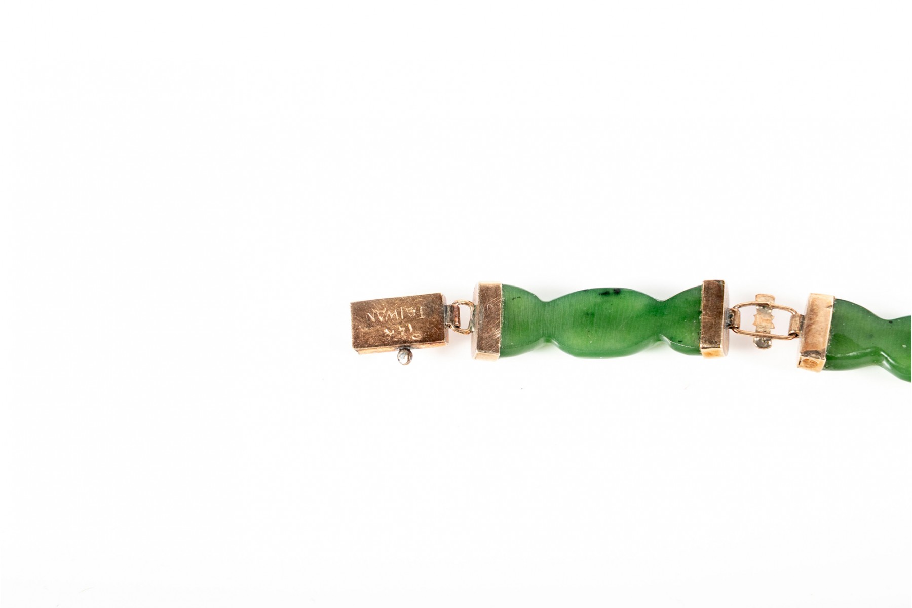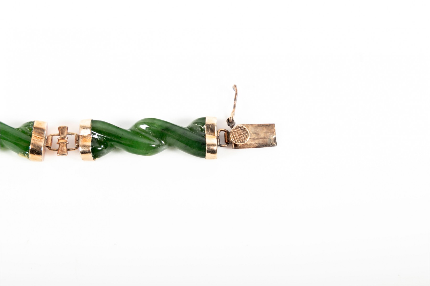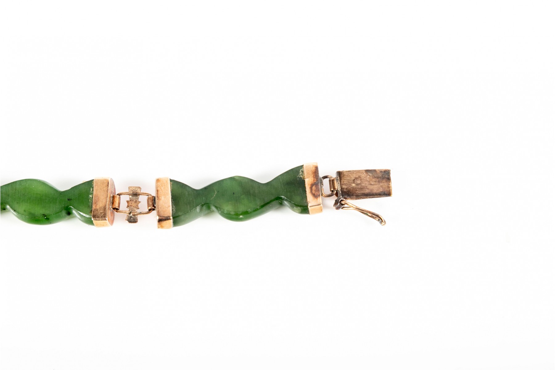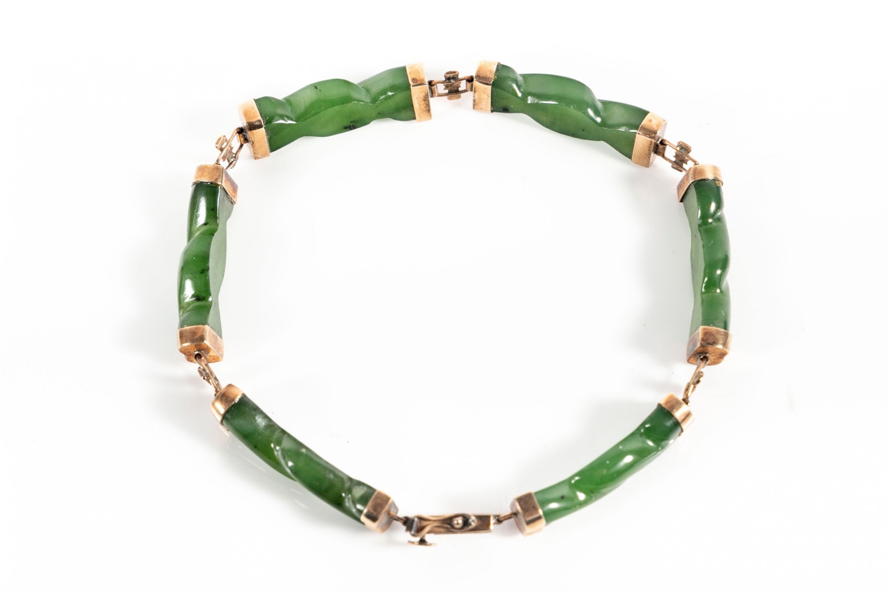 A beautiful yellow gold bracelet with links of nephrite jade in a sophisticated moss green, carved into barley twist or spiral motifs, capped in gold and accented with bow or scroll-shaped spacers.