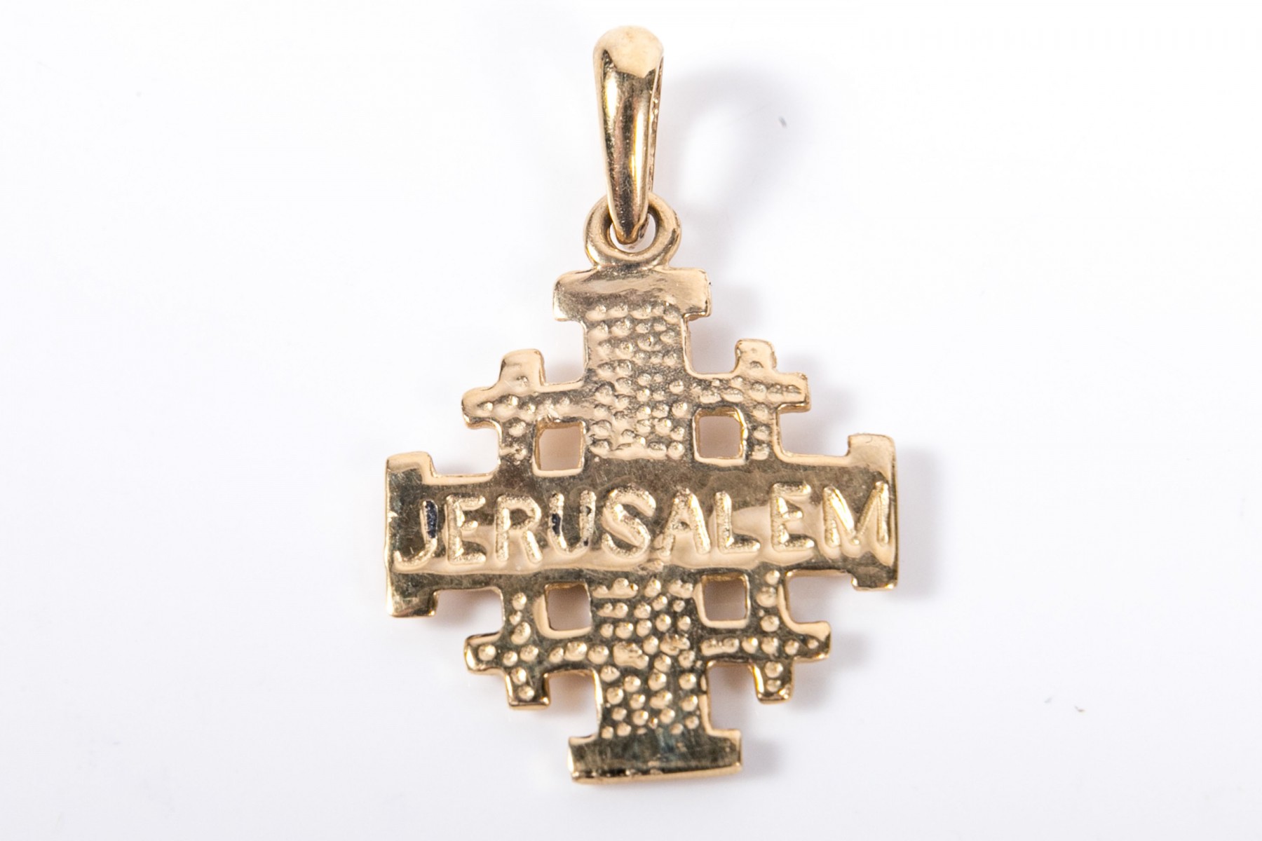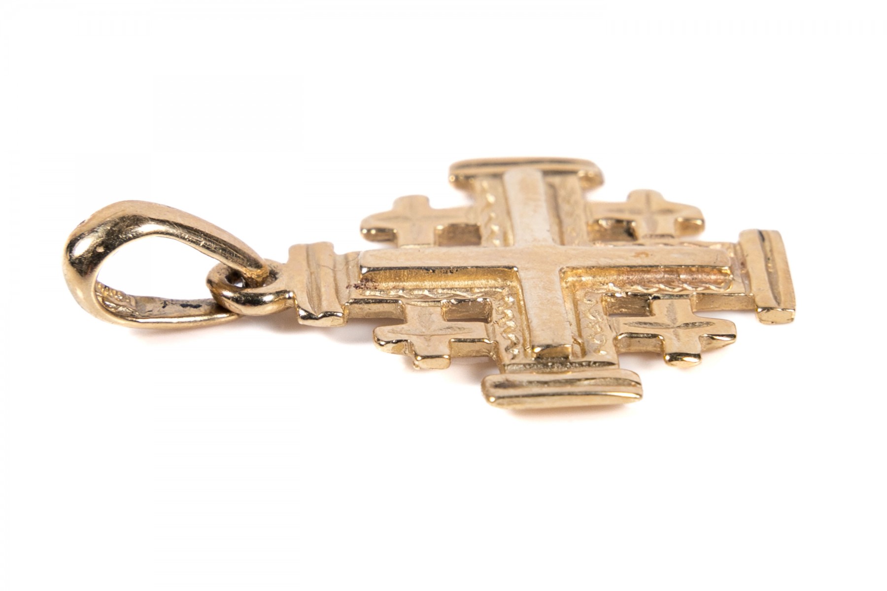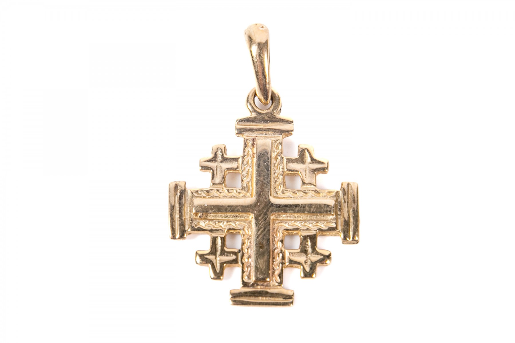 Yellow gold Jerusalem cross pendant with finely pierced and incised details.