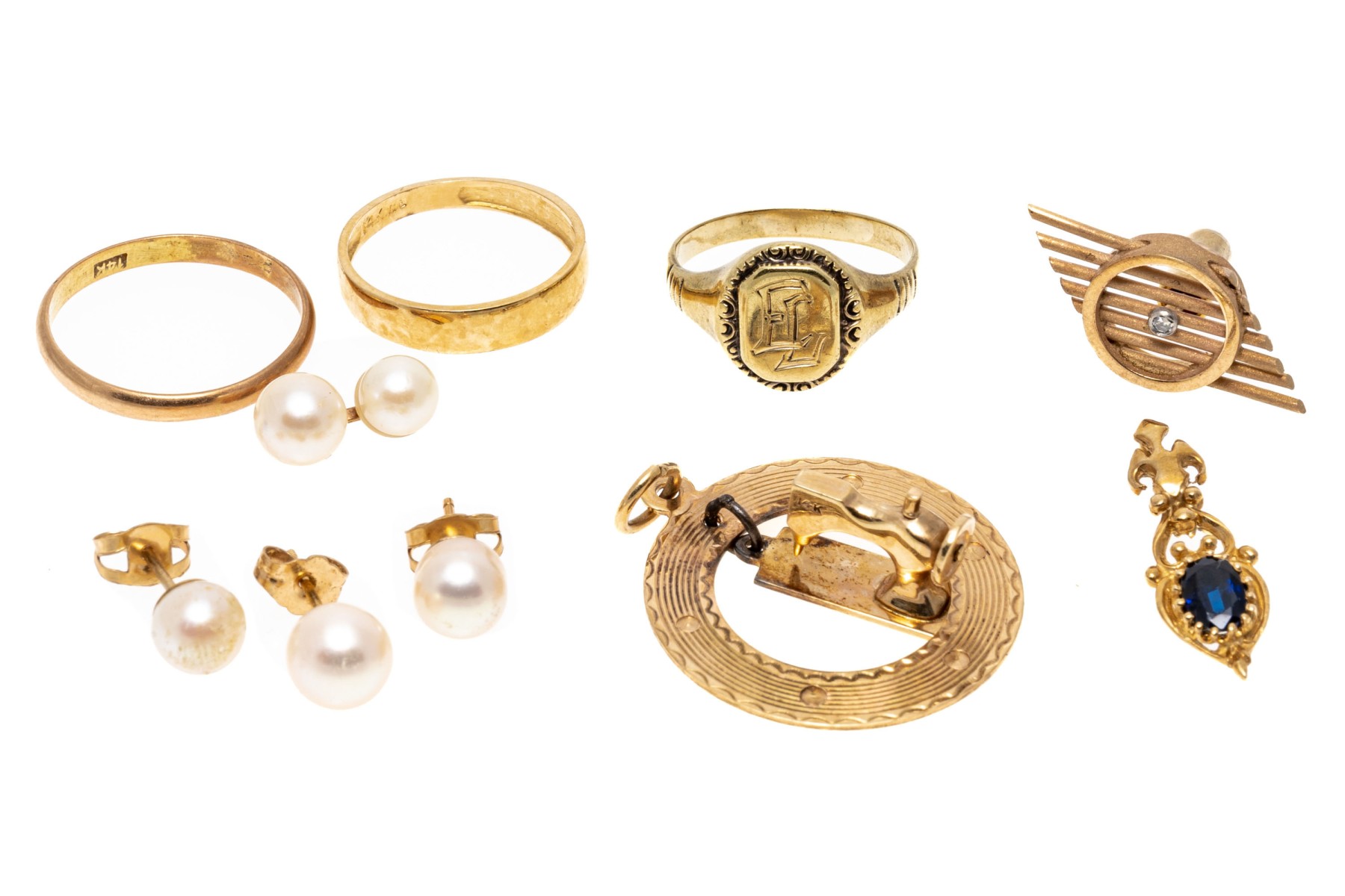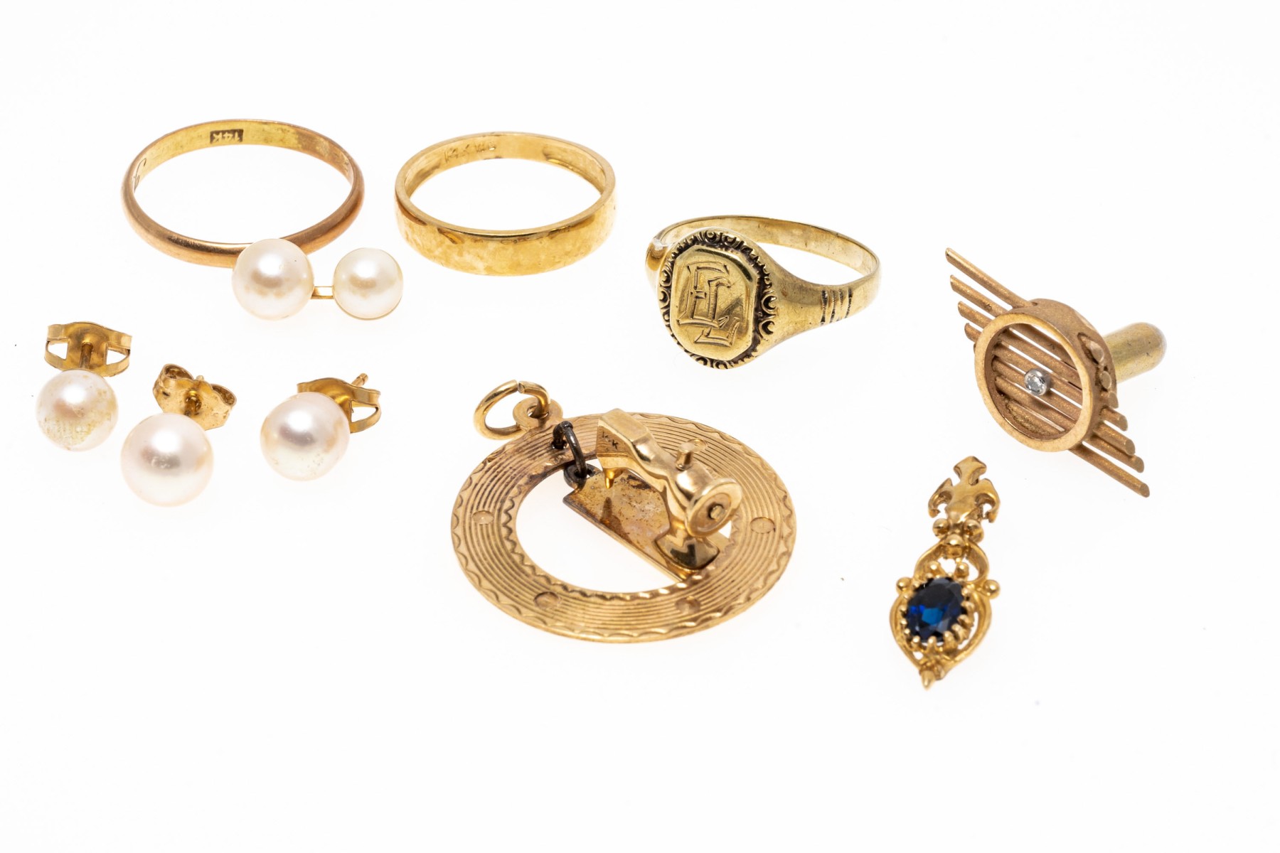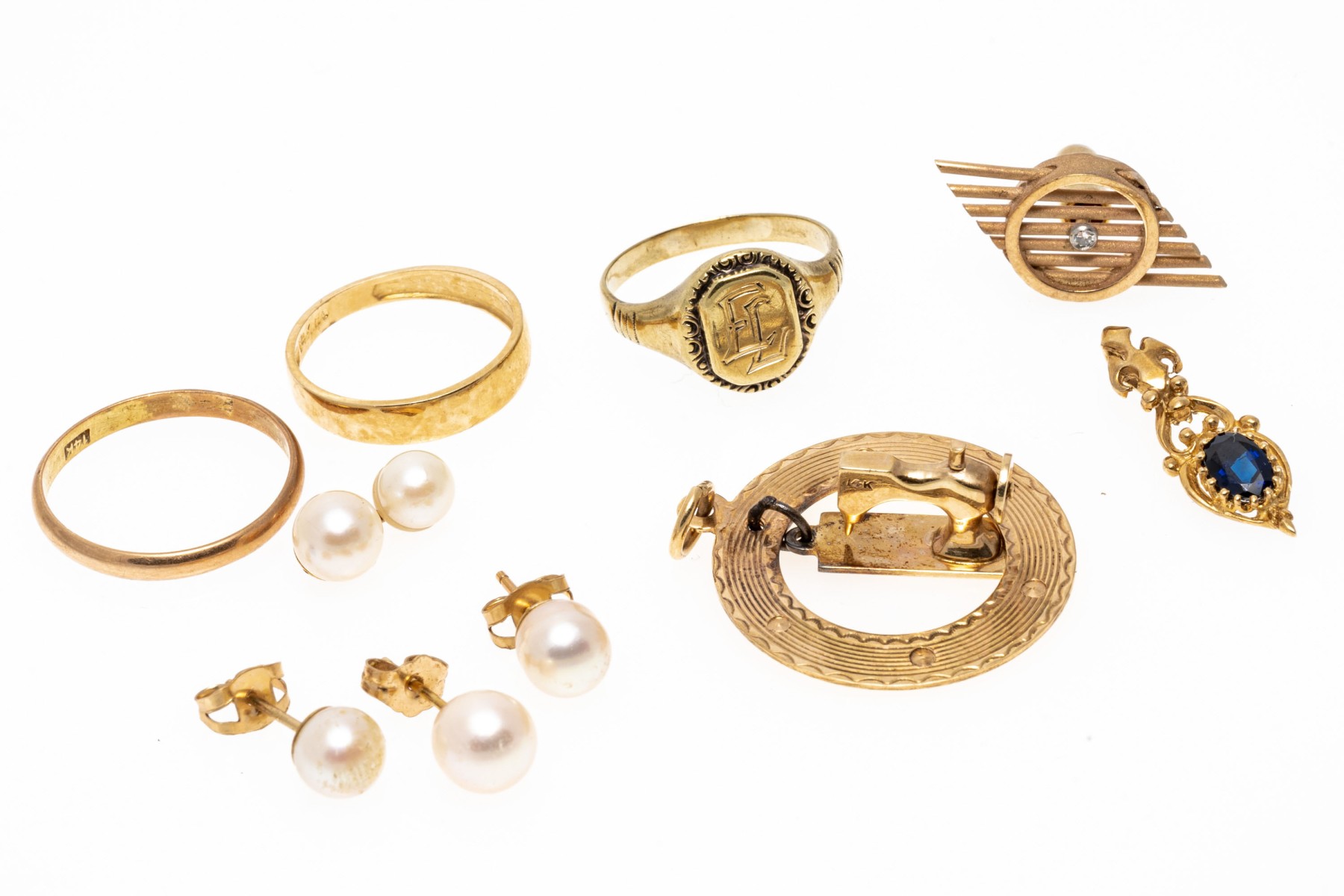 A lot of 14K gold. Rings, pendant, pin and earring singles.