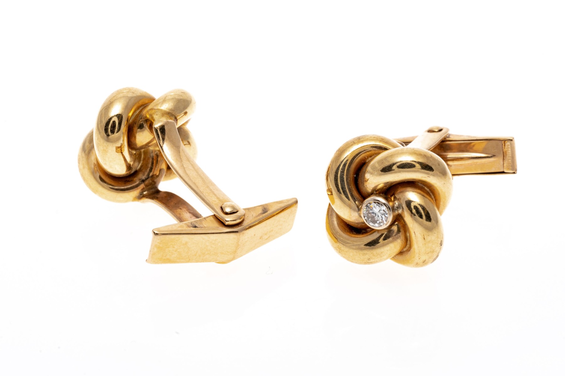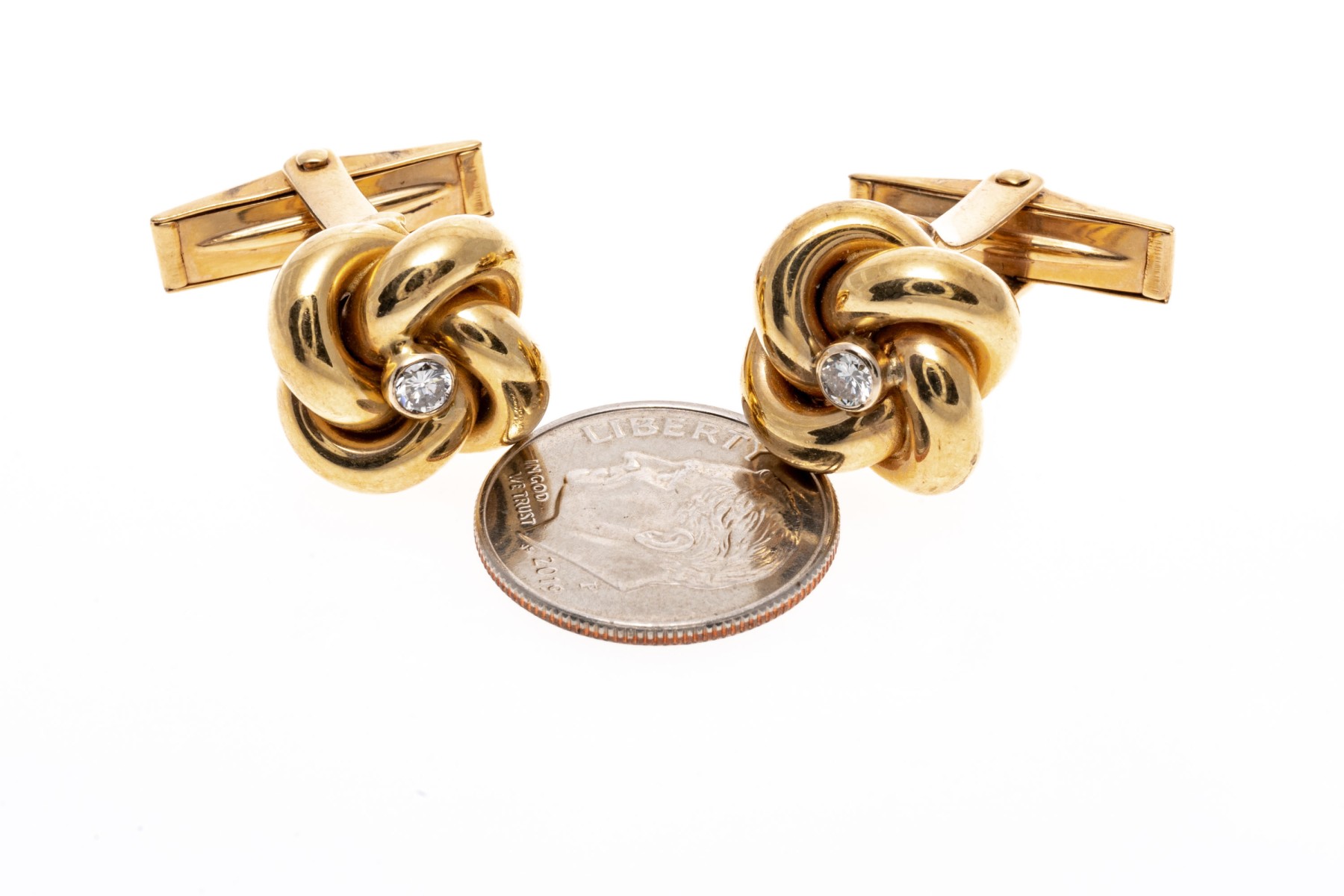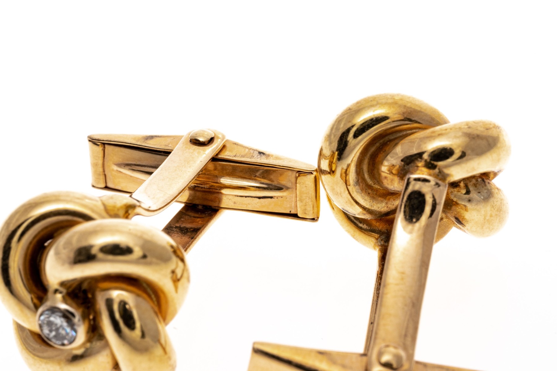 14k yellow gold cufflinks. These debonair cufflinks are a figural love knot, bezel set in the center with a round brilliant cut diamond, 0.16 TCW. The backs are lever style.