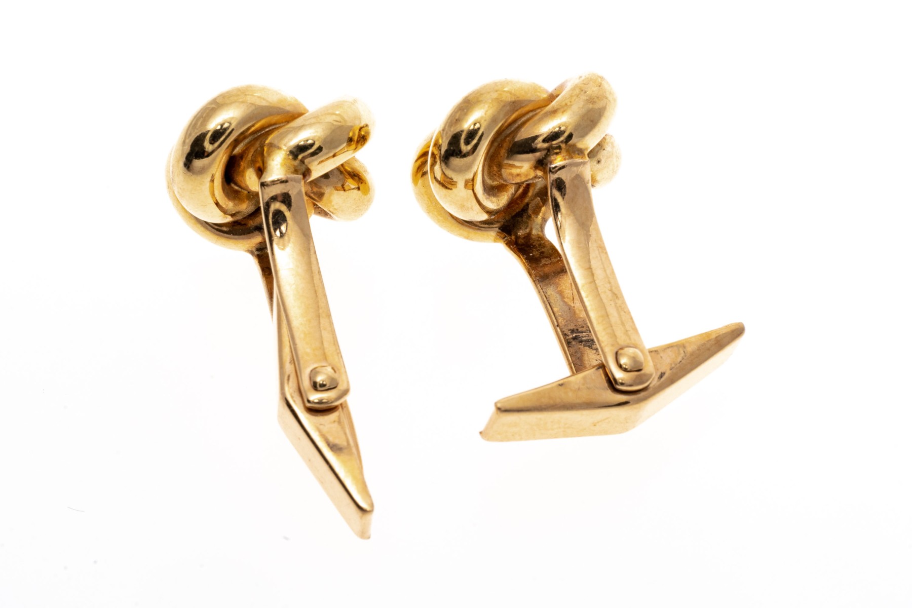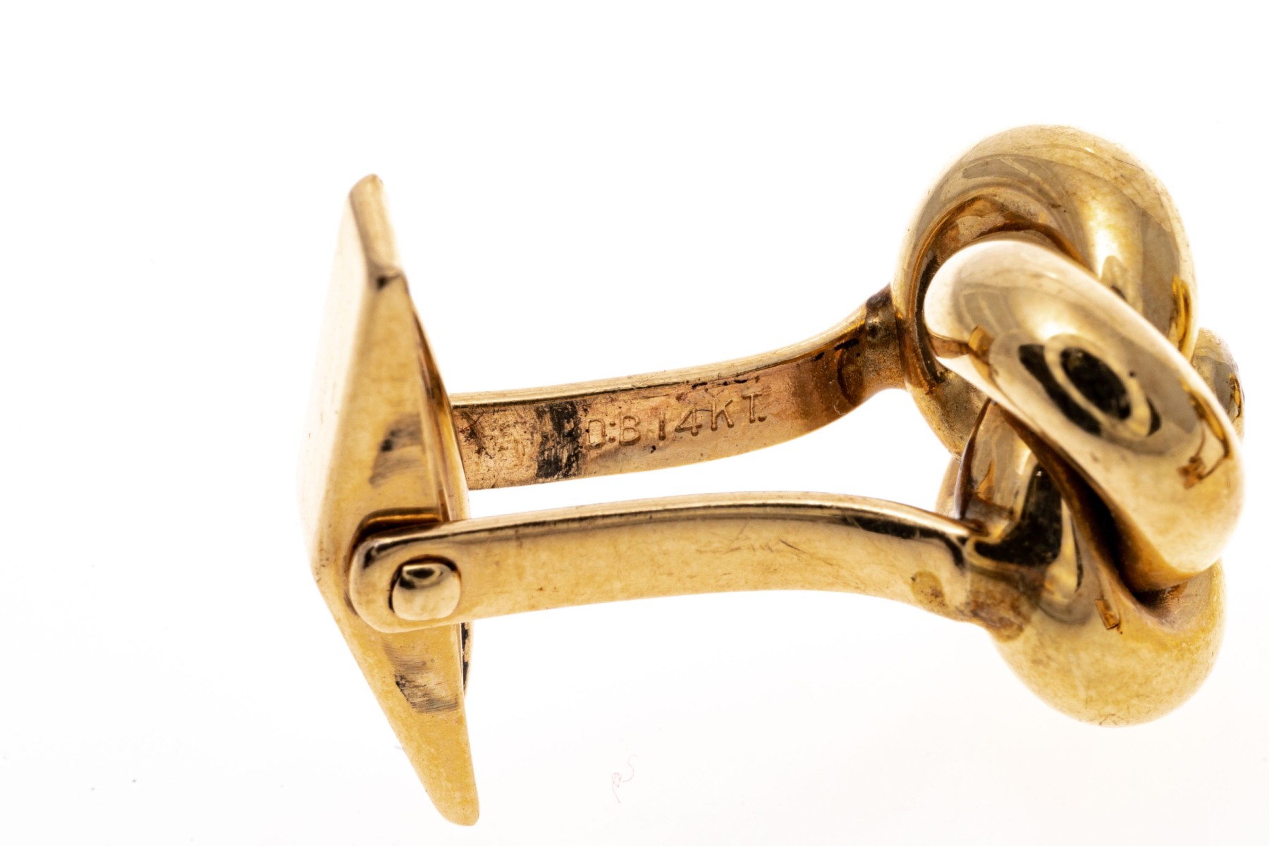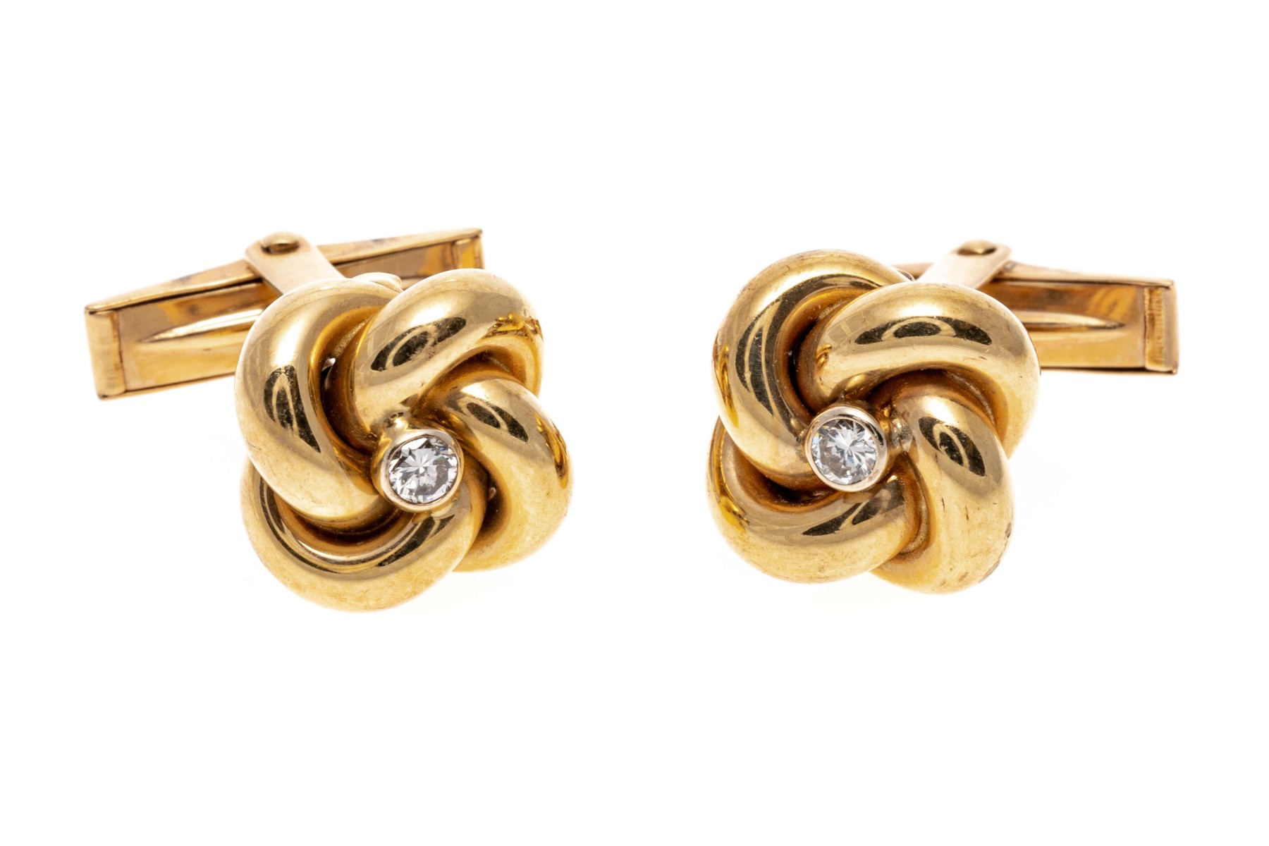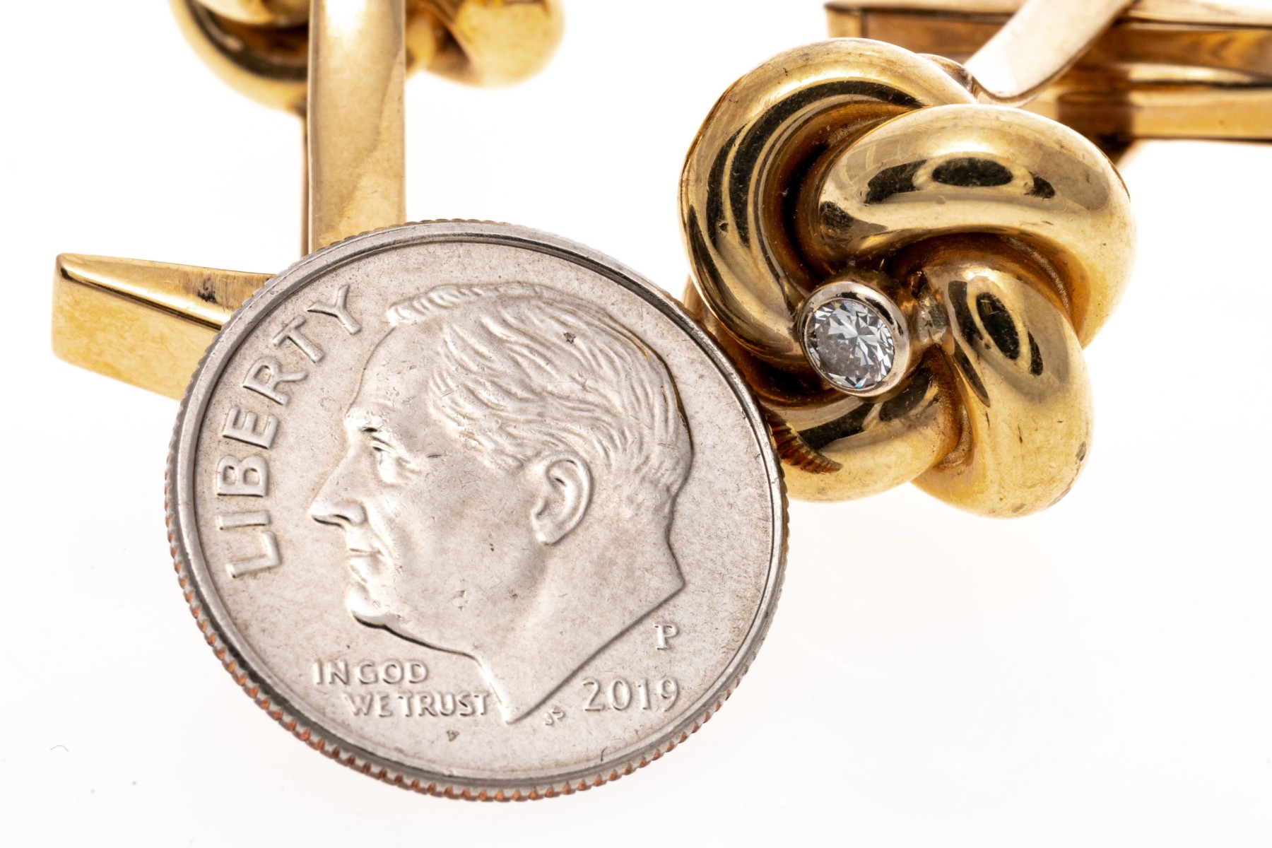 14k yellow gold cufflinks. These debonair cufflinks are a figural love knot, bezel set in the center with a round brilliant cut diamond, 0.16 TCW. The backs are lever style.