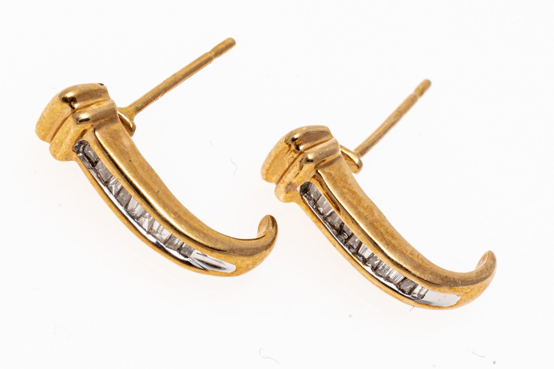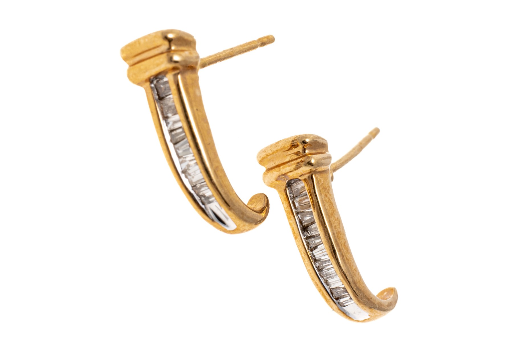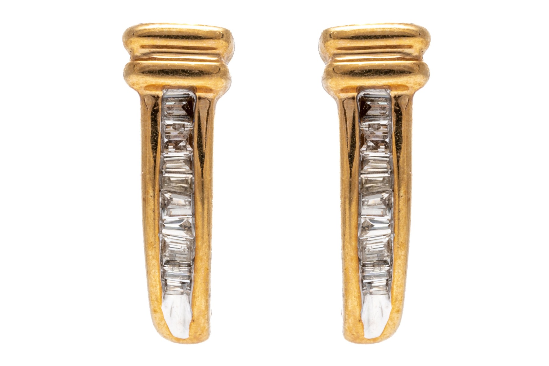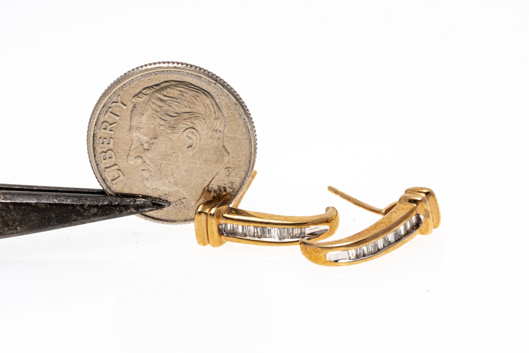 14k yellow gold lovely baguette diamond channel set hoop "j" hoop earrings, app. 0.22 TCW, ribbed tops. The earrings have posts and missing clutch style backs