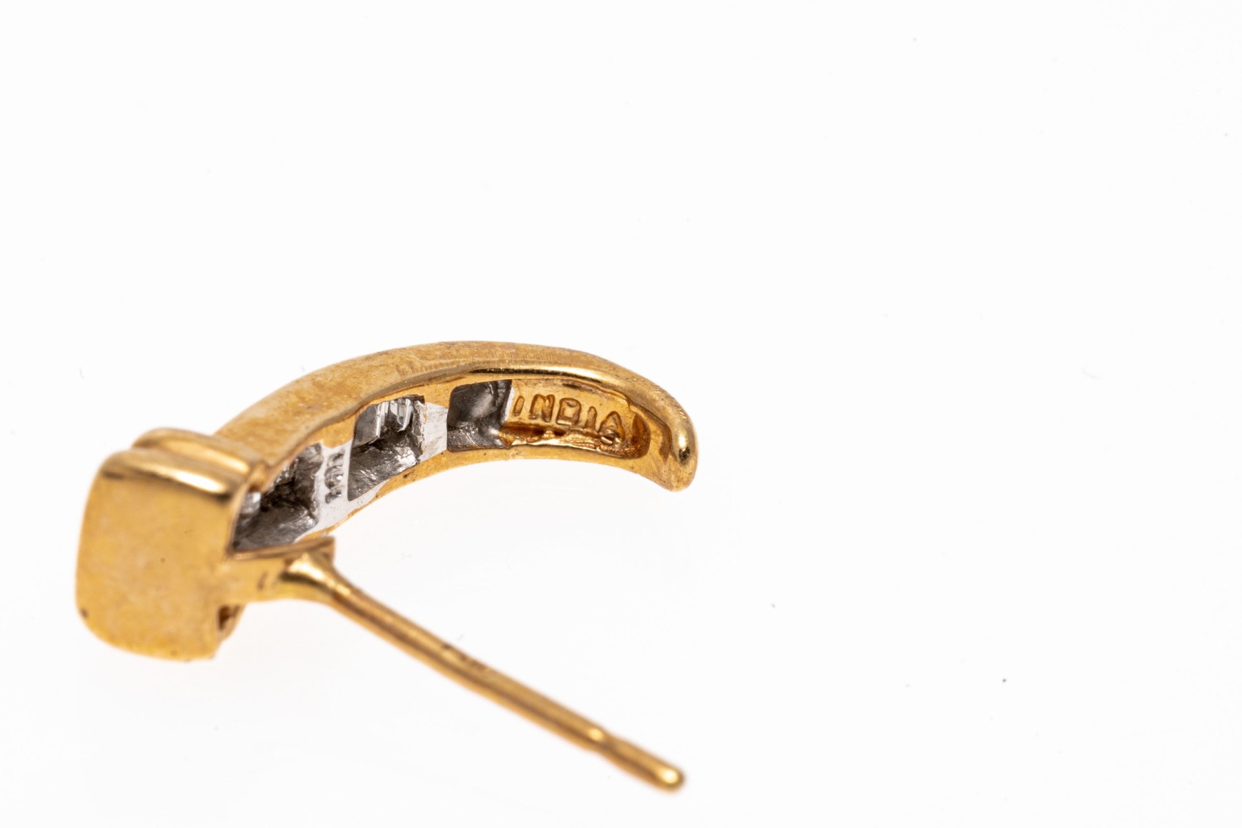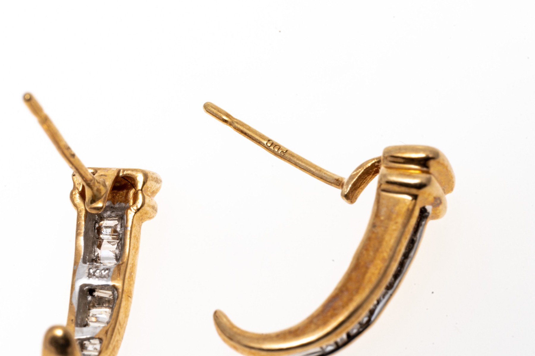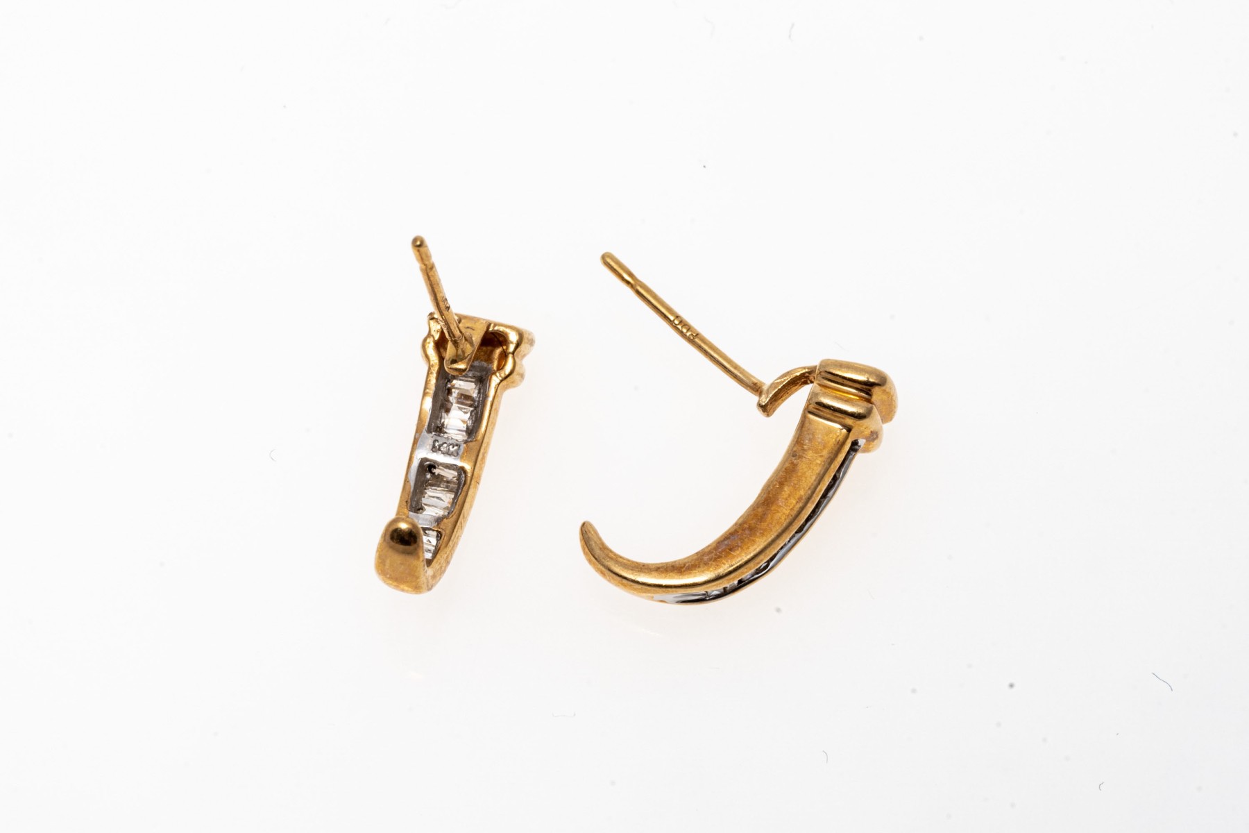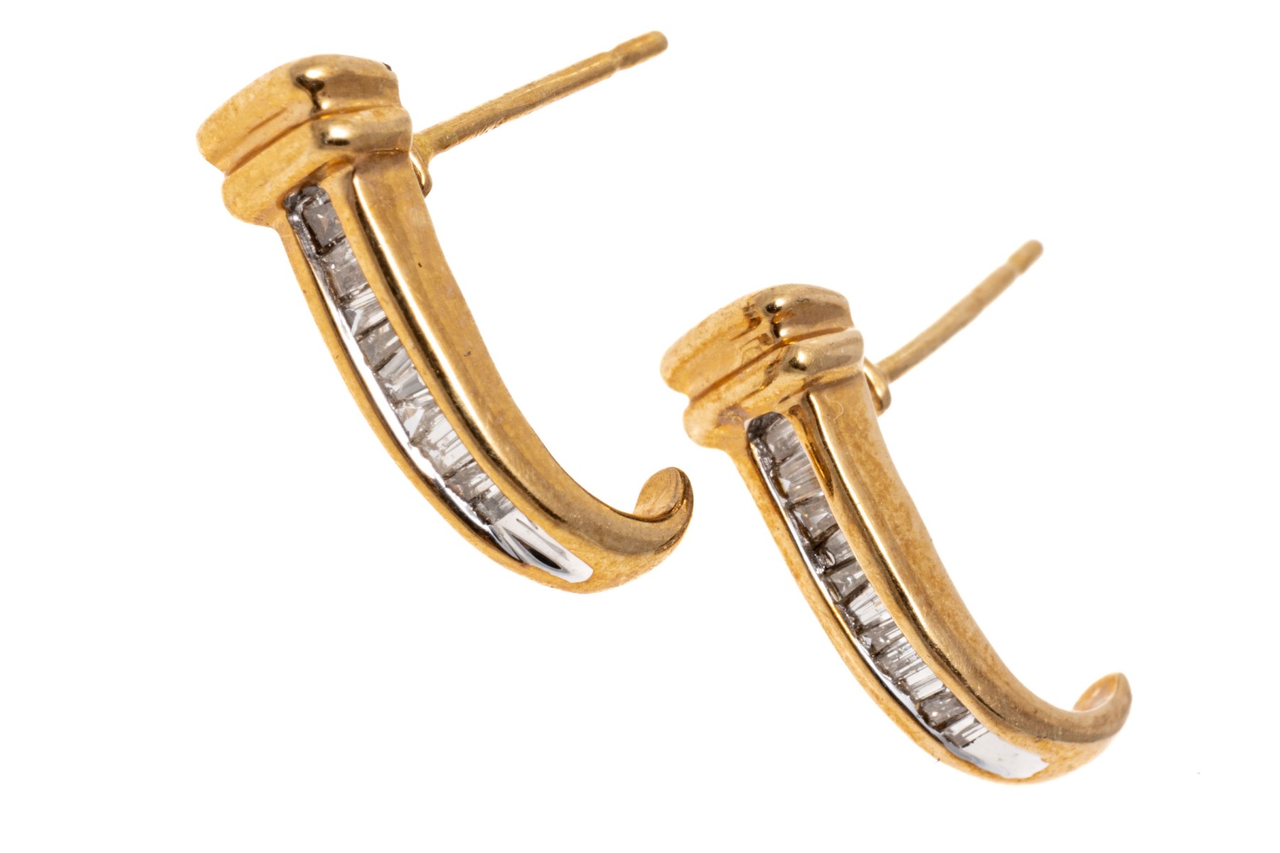 14k yellow gold lovely baguette diamond channel set hoop "j" hoop earrings, app. 0.22 TCW, ribbed tops. The earrings have posts and missing clutch style backs